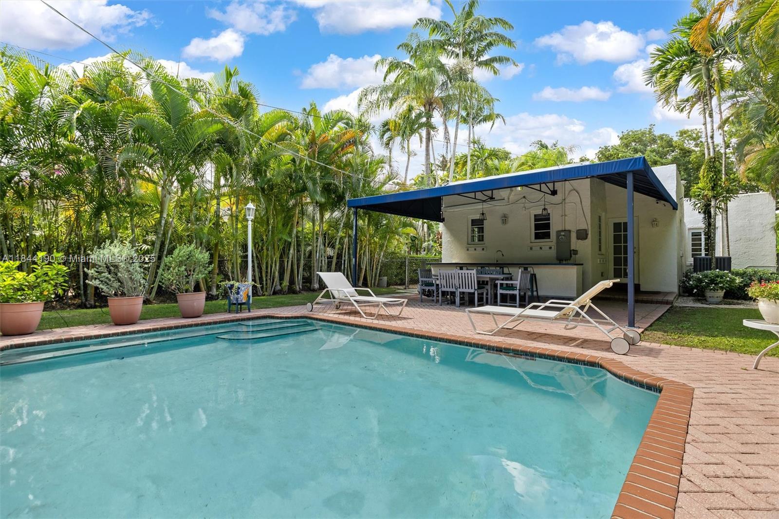 This charming Old Spanish home in Coral Gables was built in 1926 and features original wood floors, arched walls, and a fireplace that highlight its historic character. Modern updates include new bathrooms, custom closets, a comfortable family room, and upgraded impact windows and doors installed in 2024—blending classic style with today’s comforts. The backyard offers a brick patio, a spacious covered bar, and a tranquil pool surrounded by lush landscaping. The lot is larger than most at 50 by 150 feet, providing extra space and privacy. Conveniently located near Coral Gables’ Restaurant Row and Miracle Mile, with easy access to some of the city’s best dining, shopping, and entertainment.