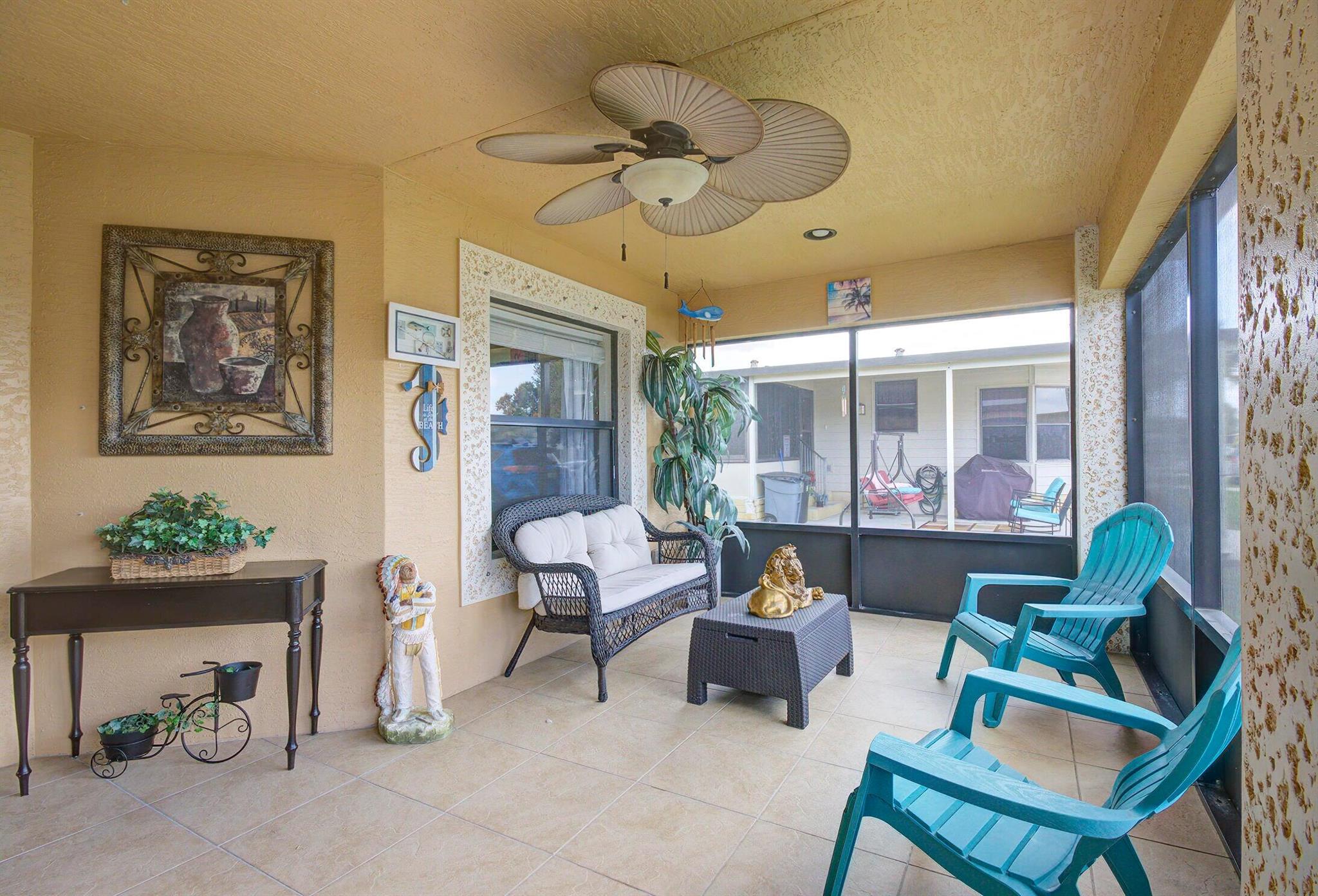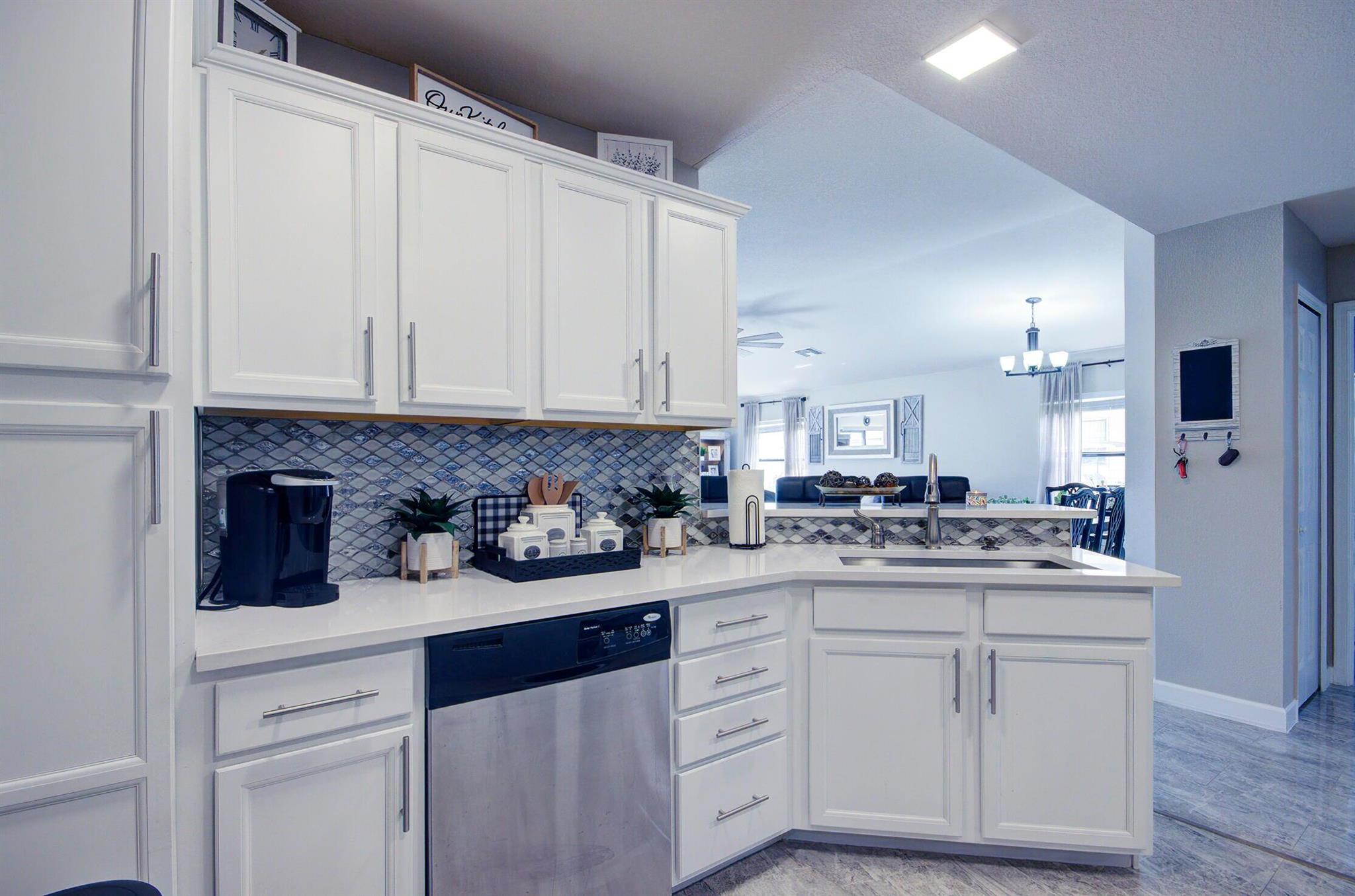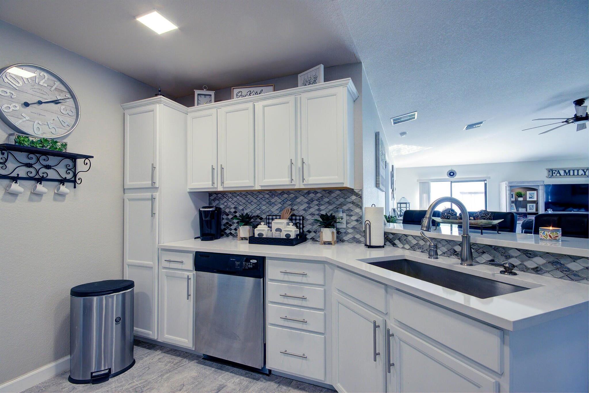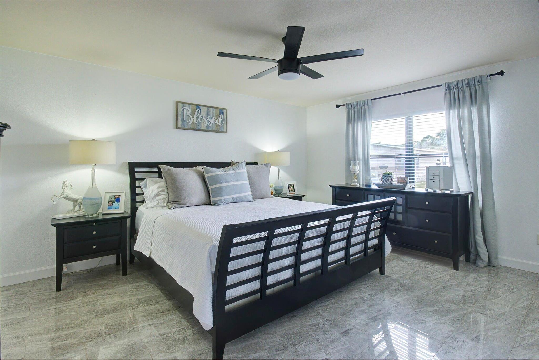 Elegant and beautifully upgraded 2/2/1 CBS home, featuring Quartz countertops, pristine white cabinetry, stylish tiled floors, and a large, screened porch. This home comes equipped with newer appliances, an AC unit with a transferable warranty, and a durable metal roof. Nestled in the sought-after 55+ community of Spanish Lakes, residents enjoy an array of amenities, including heated pools for residents and guests, a clubhouse with a cantina and kitchen, an auditorium with a stage, a community library, a lounge with a bar, an arts and crafts room, a billiards hall, a gym with a sauna, woodworking facilities, and a card room. Outdoor enthusiasts will love the two designated pickleball courts, lighted shuffleboard, an 18-hole golf course, tennis, dog park and bocce ball.