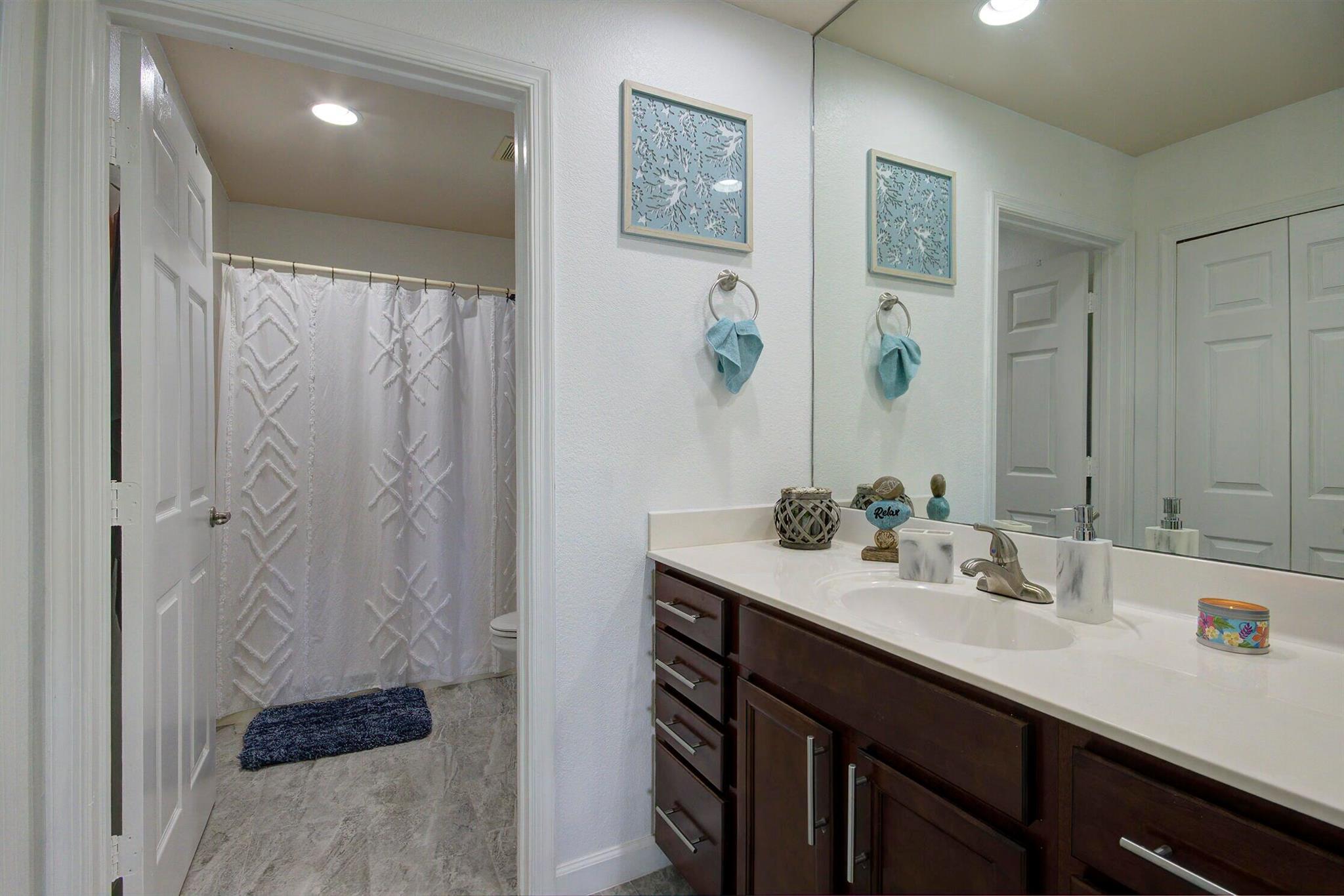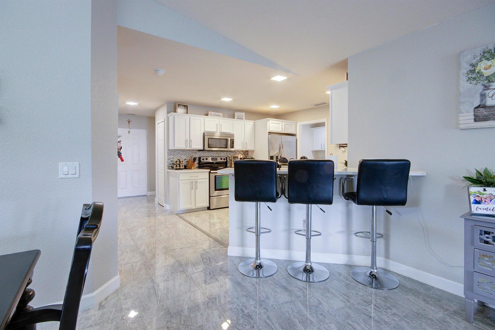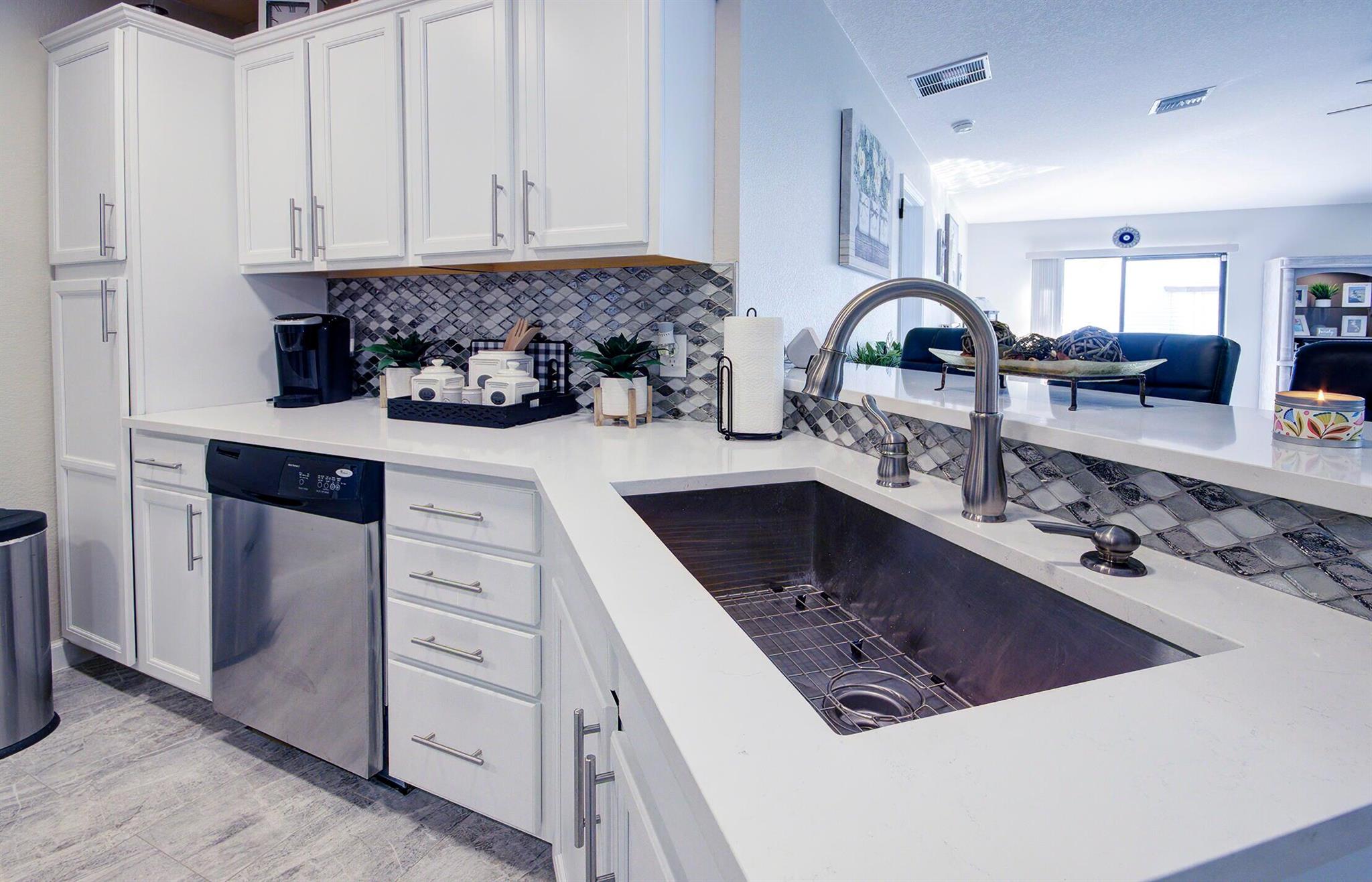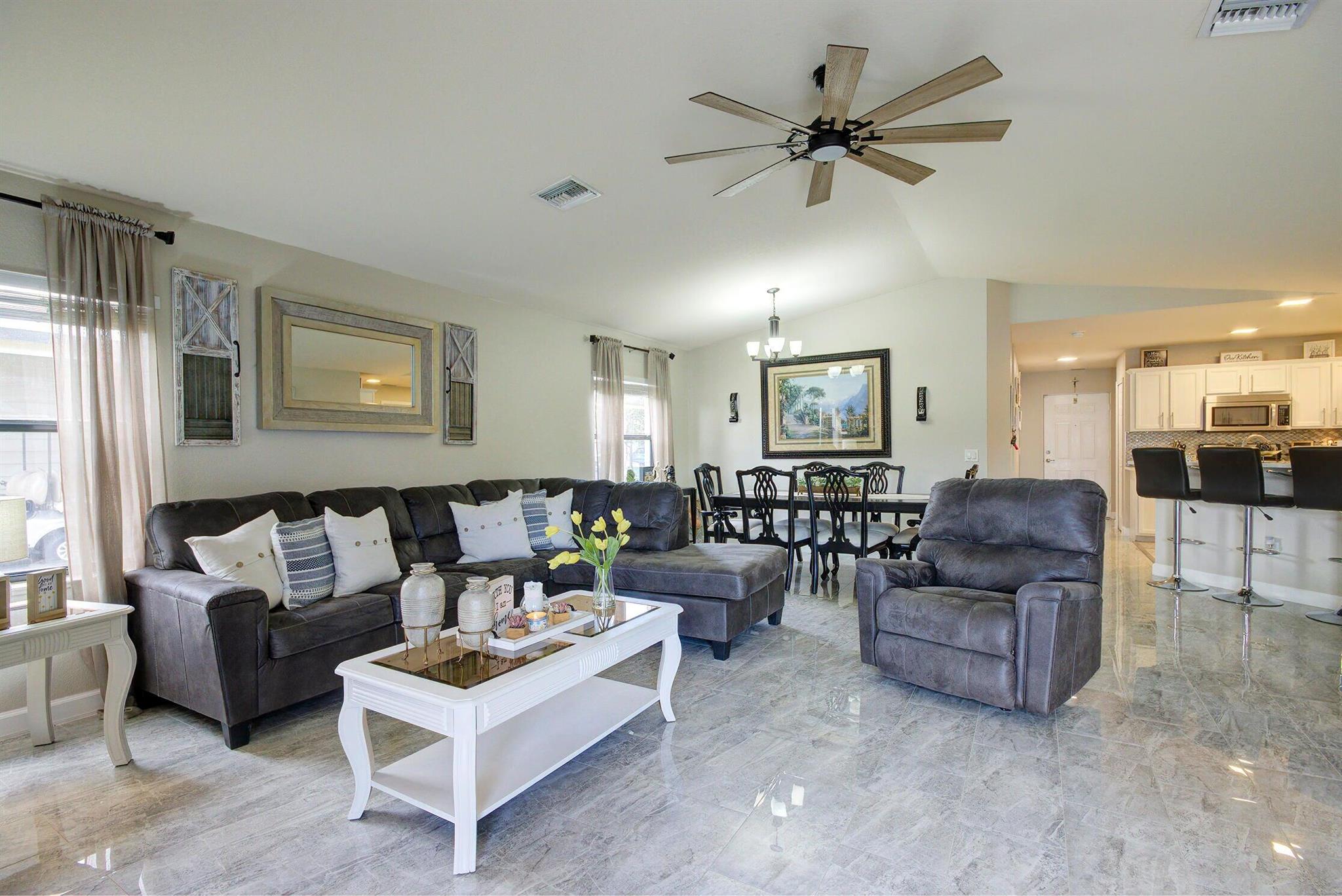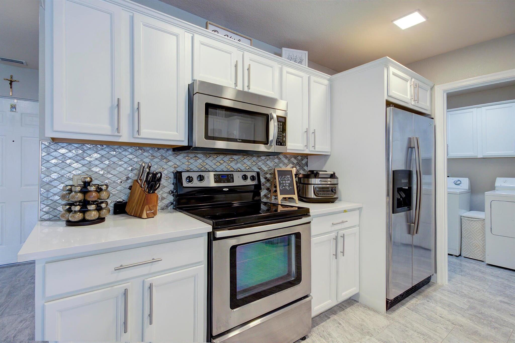 Elegant and beautifully upgraded 2/2/1 CBS home, featuring Quartz countertops, pristine white cabinetry, stylish tiled floors, and a large, screened porch. This home comes equipped with newer appliances, an AC unit with a transferable warranty, and a durable metal roof. Nestled in the sought-after 55+ community of Spanish Lakes, residents enjoy an array of amenities, including heated pools for residents and guests, a clubhouse with a cantina and kitchen, an auditorium with a stage, a community library, a lounge with a bar, an arts and crafts room, a billiards hall, a gym with a sauna, woodworking facilities, and a card room. Outdoor enthusiasts will love the two designated pickleball courts, lighted shuffleboard, an 18-hole golf course, tennis, dog park and bocce ball.