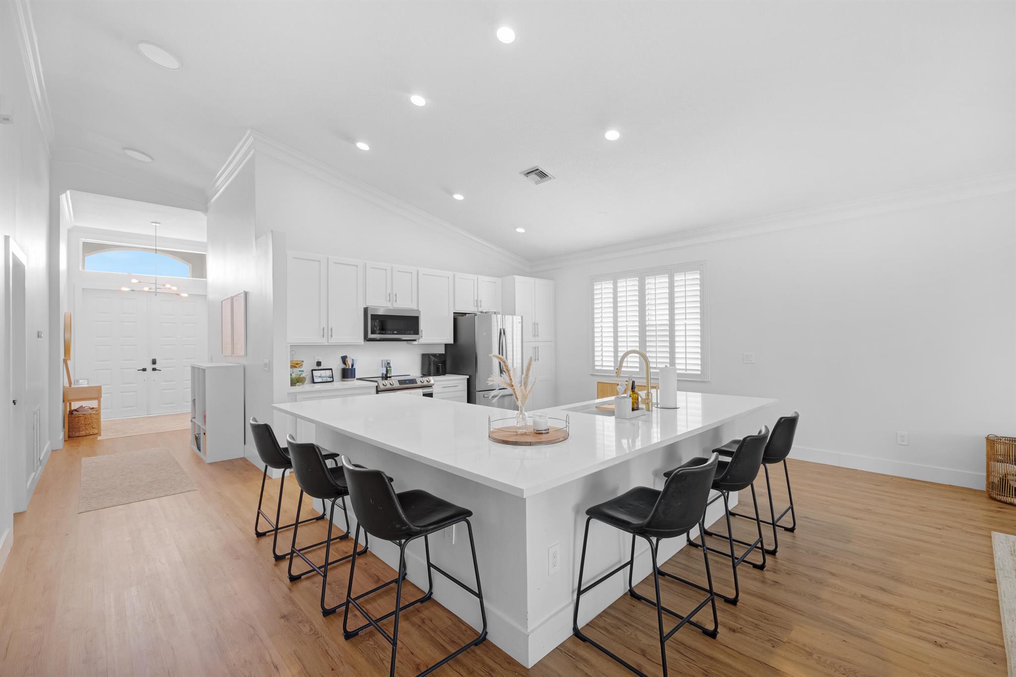 Check out one of the rarely available fully remodeled 3 bed 2 bath single story home in the community of Andros Isle. This CBS home features an open concept living and split floor plan. The kitchen features white cabinetry, quartz counters, and newer stainless steel appliances. Vinyl plank flooring runs seamlessly throughout the home. The primary bedroom has two custom built walk in closets. Impact windows and shutters provide complete protection from storms. The 2 stall garage features a FPL EV Charger. Enjoy the screened in patio recently screened with a special no- see-em screening with views of the 23 mile grassy waters preserve. This home is located close to shops and dining such as Target, Starbucks, Bimini Twist and more.
