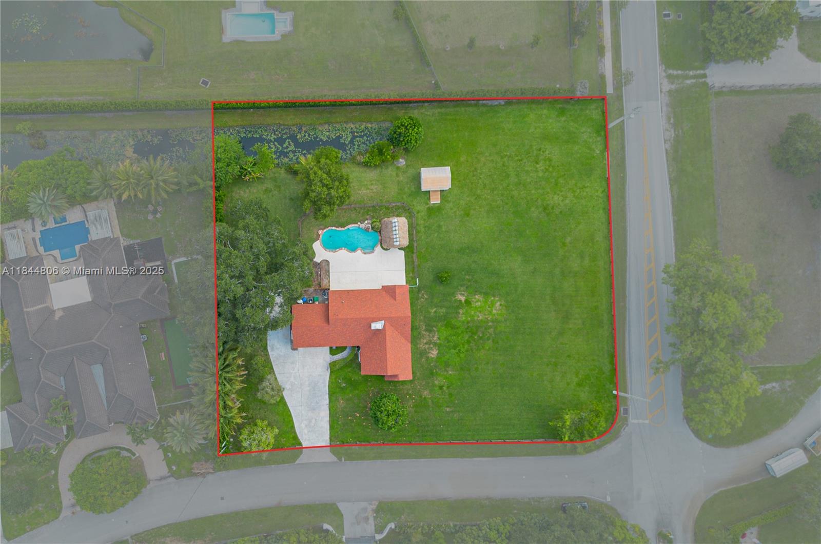 Nestled on an oversized canal-front corner acre lot in the heart of Davie, this unique property blends rustic charm with modern upgrades and NO HOA. Bring your horses and enjoy wood floors, a double-sided wood-burning fireplace, a new A/C (2023), and a new roof (2022). The primary bathroom was completely renovated in 2024. Impact sliding doors in the living room and primary suite lead to a tropical oasis with mature fruit trees, a chickee hut with a new roof, a pool with a waterfall, a Jacuzzi, and a 50-amp RV hookup. The septic tank was just recently pumped out and is in great condition.