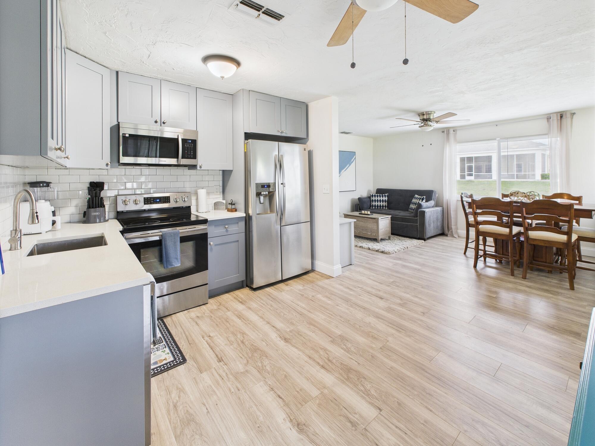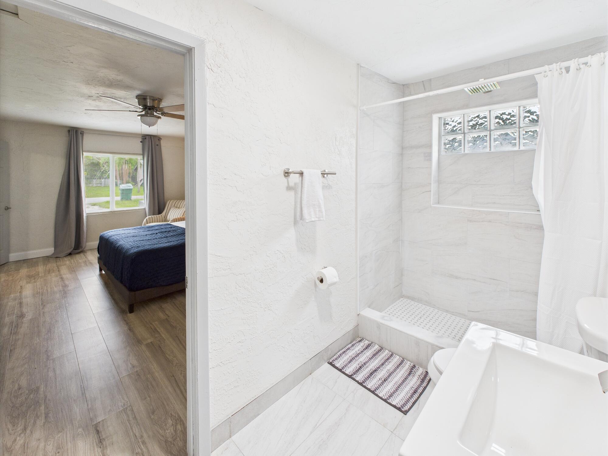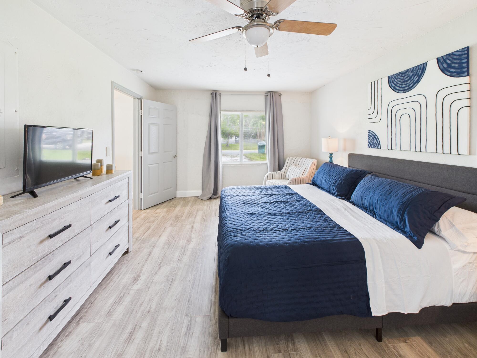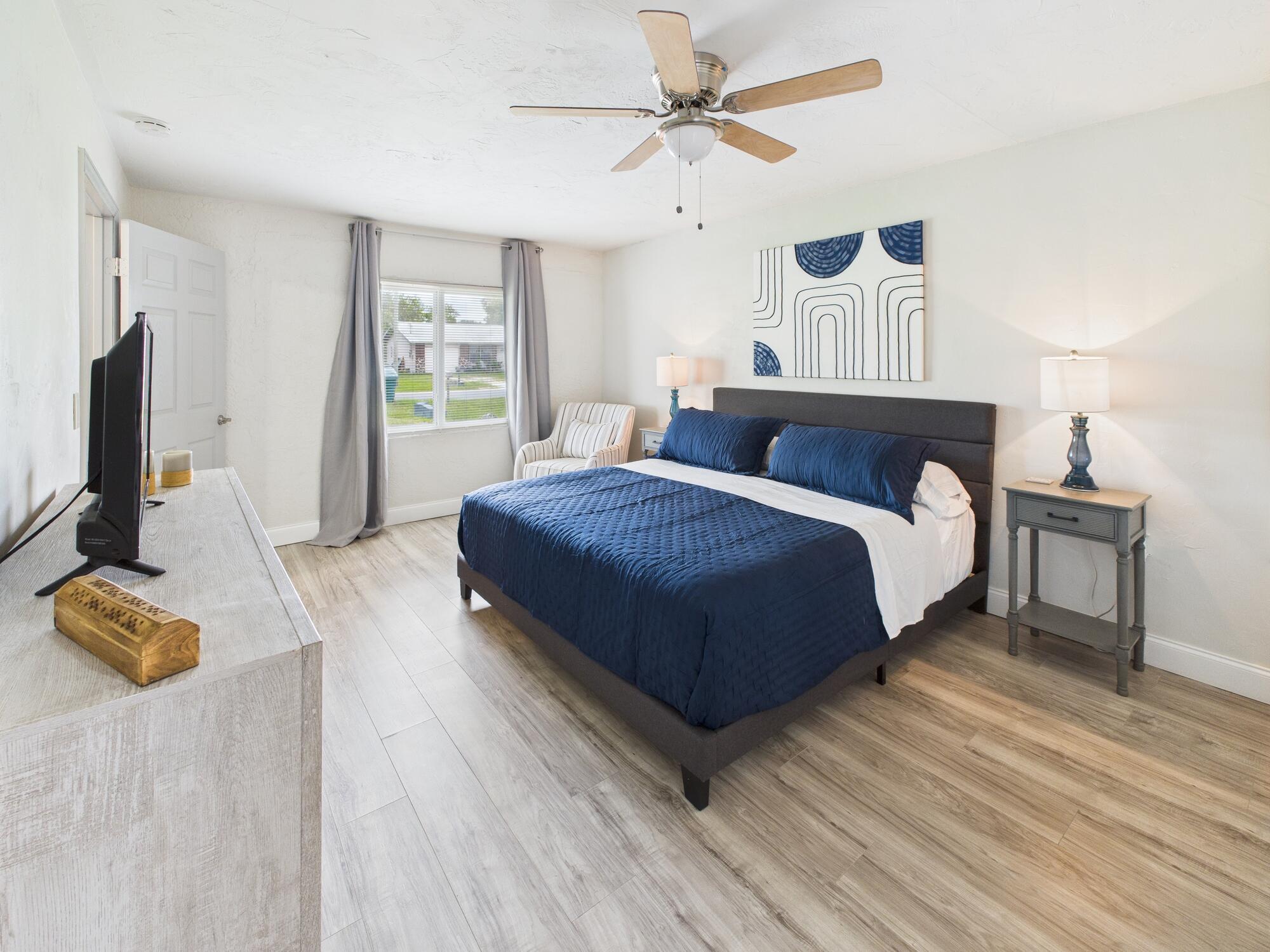 Completely remodeled 3BD/2BA split floor plan with brand-new roof, windows, floors, paint, kitchen, and baths--no detail overlooked! The all-new kitchen features solid cabinets, countertops, stainless appliances, and subway tile backsplash. The master suite offers a rainfall shower with glass block, sunken shelf, and private lanai. Guest bath includes a vessel sink. Fully furnished and set up as a short-term rental--furnishings negotiable. Corner lot with shaded backyard near schools, medical, great fishing, restaurants, and just a short drive to east and west coast beaches.