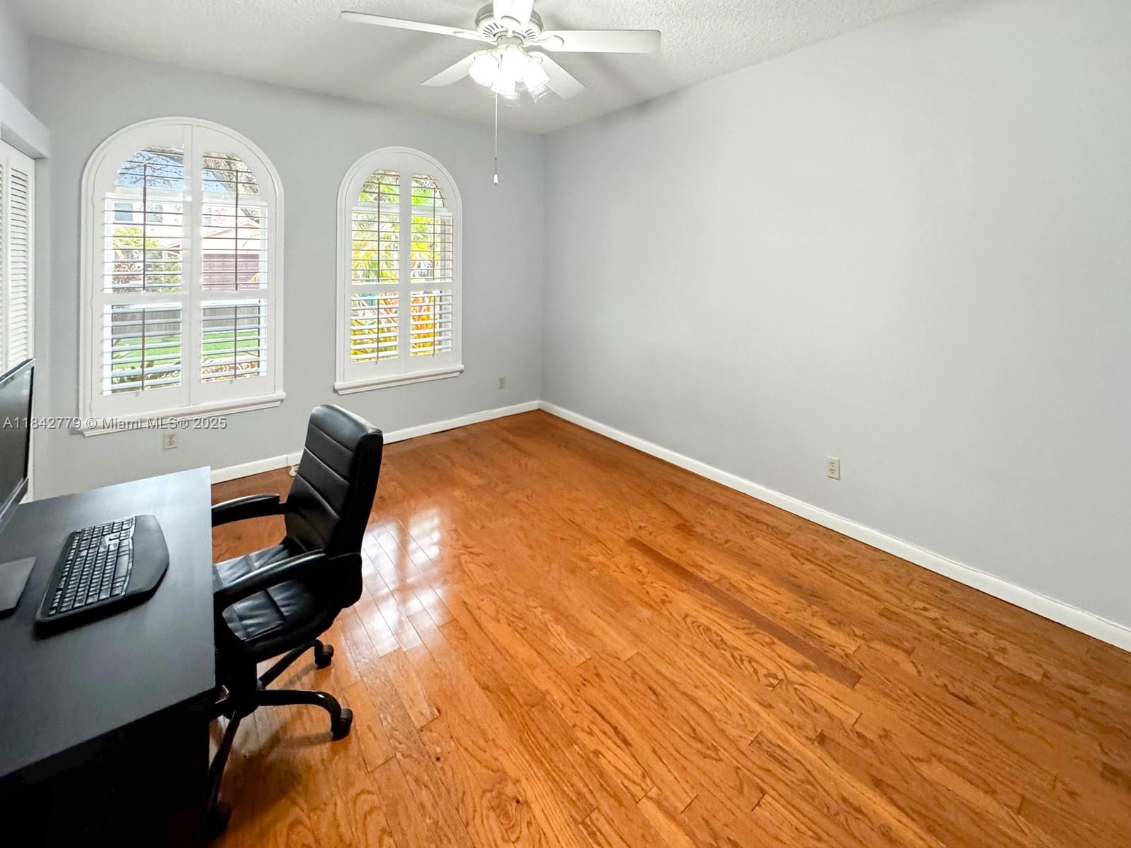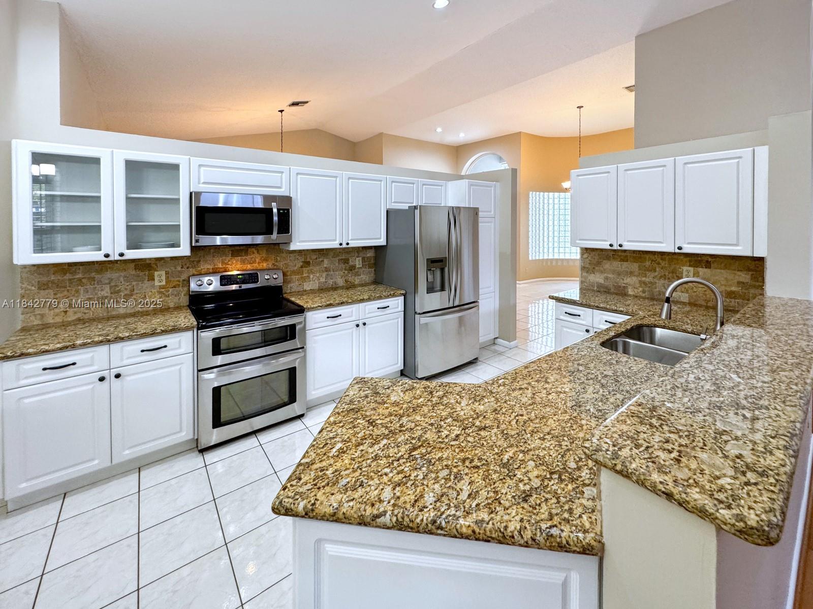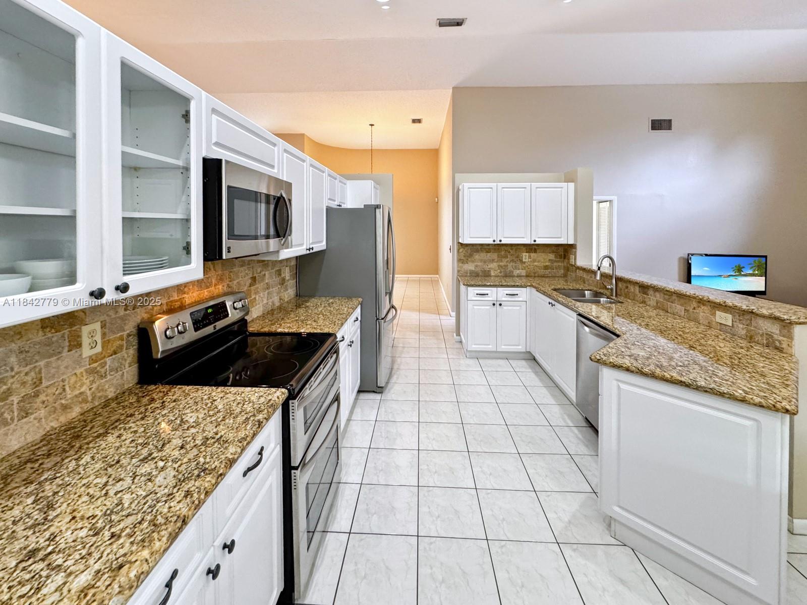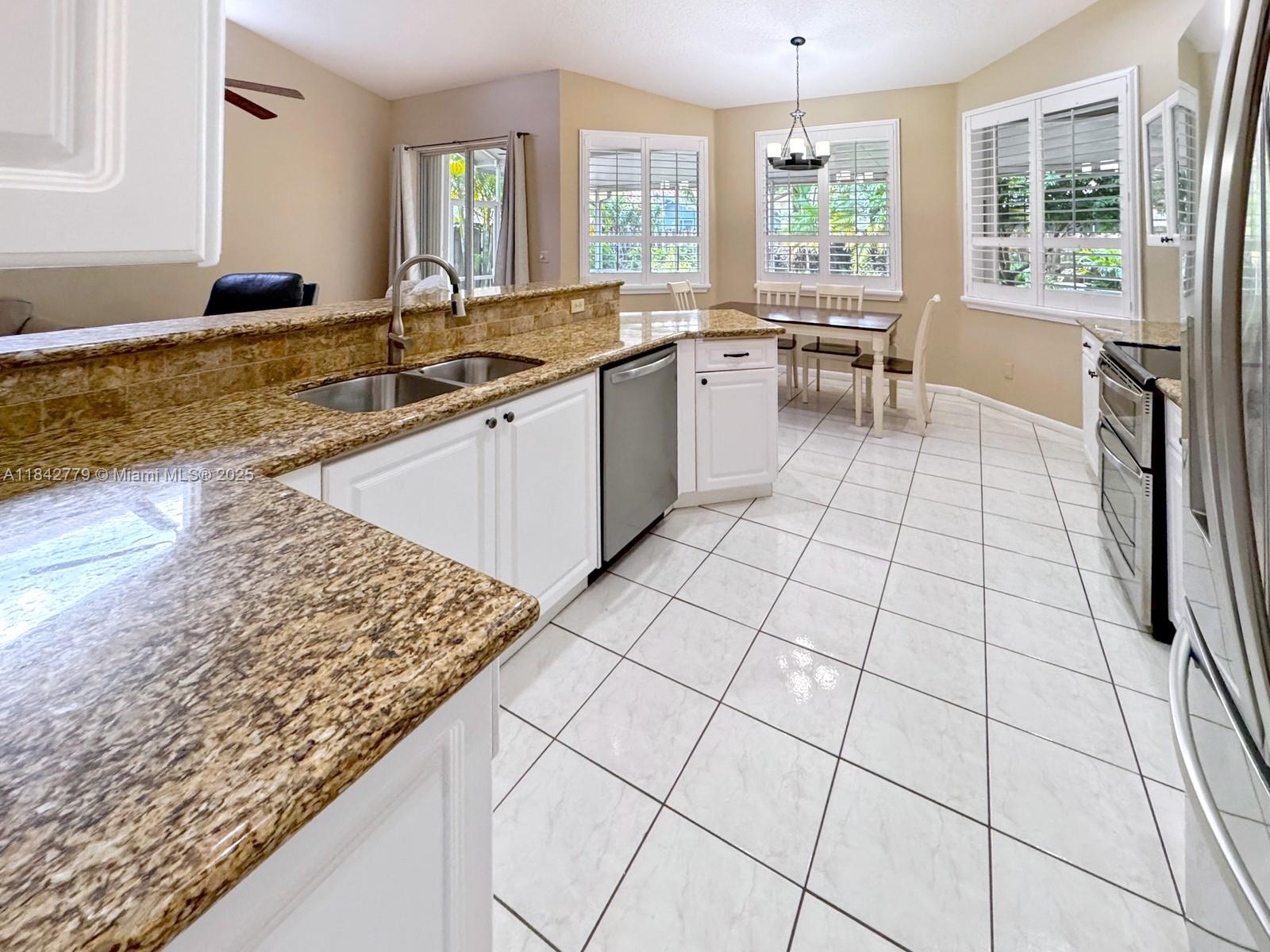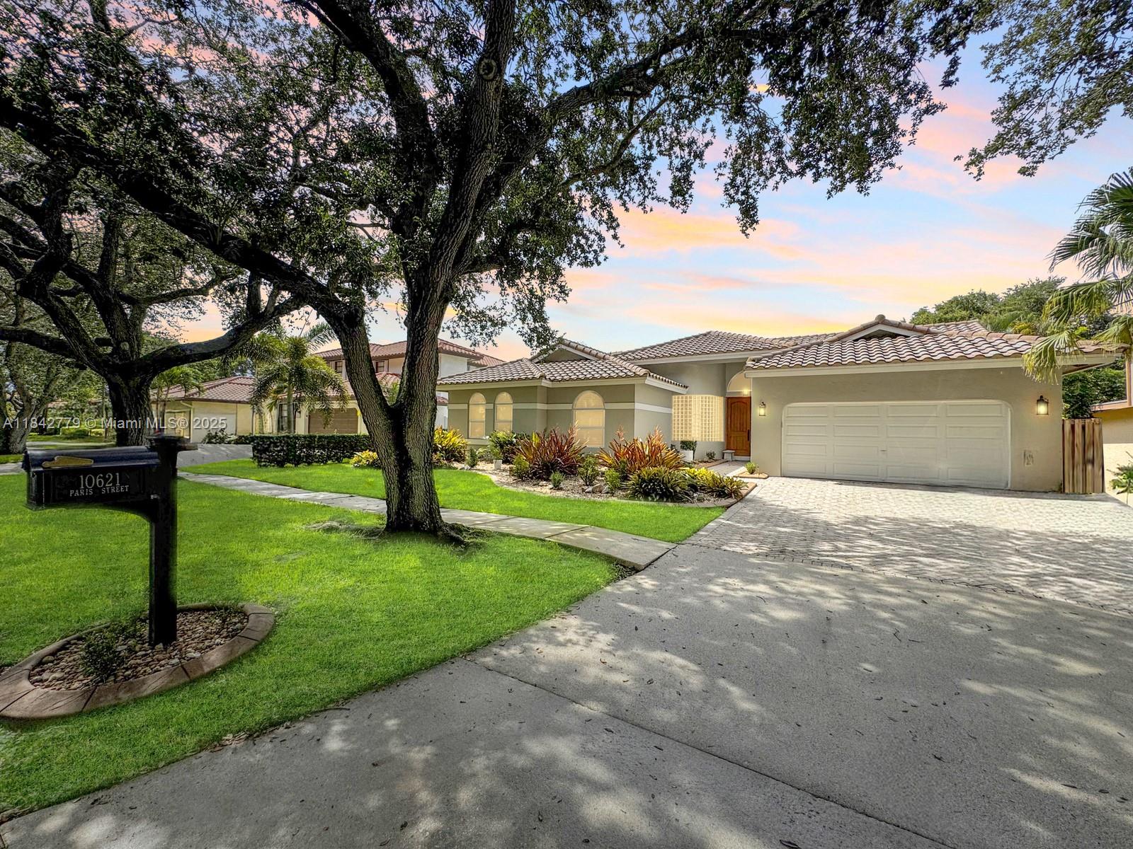 Beautiful 4 bed, 2.5 bath home nestled in the sought-after Embassy Lakes, Cooper City. Grand double door entry welcomes you to home filled with natural light through arched windows that create an inviting atmosphere. Kitchen features white cabinetry, granite tops, stainless appliances, counter-height seating & breakfast area. Open-concept layout w split floor bedroom plan. Spacious primary suite w walk-in closet & en-suite bath. Combination of impact & accordion shutters for complete protection; EV charger. Private Zen-like garden w stone pathway on fenced backyard with a tranquil covered patio retreat. Located on a tree-lined street in a pet-friendly neighborhood assigned to Cooper City schools. Resort-style gated community w fabulous pool, clubhouse, gym, sports courts & 3 manned gates.