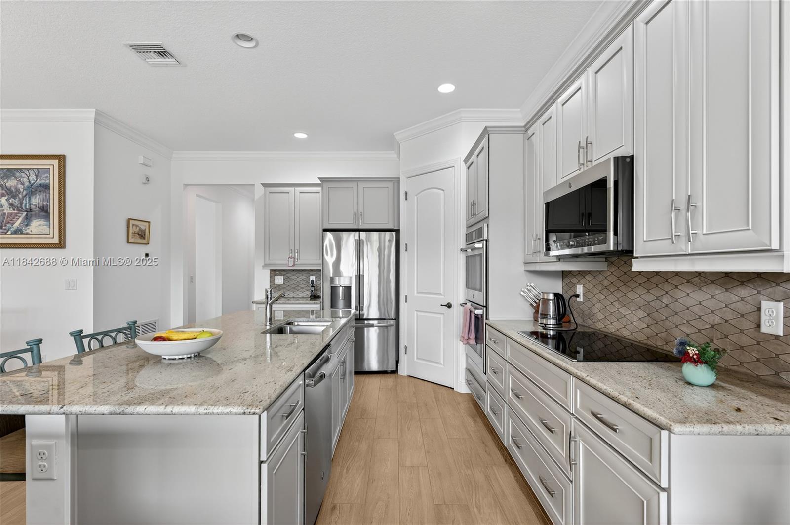 Welcome home to this RARE GEM, 3-bedroom, PLUS 4th room/Office, pie-shaped waterfront home on a charming cul-de-sac in a gated community. Not your builder's-basic! Updates Abound with over $150k in UPGRADES, offered at a HUGE DISCOUNT! Peace of mind afforded with newer construction codes to face the elements | Whole-Home Generac to weather any storm uninterrupted | Impact Windows | CAT 4 Rated Expanded Patio Enclosure | Stunning Outdoor Kitchen & Paved Patio | Builder Premium Upgrades | Luxury Closet System | Plantation Shutters | Motorized Shades | Timeless Open Kitchen, Stainless Appliances, Double Wall Oven | Spacious Extra Large Fenced Private Lot Great for Pets Featuring Secondary Dog Fence | Gutters | Comcast-wired. Minutes from Sawgrass & Turnpike, great schools, dining & shopping!