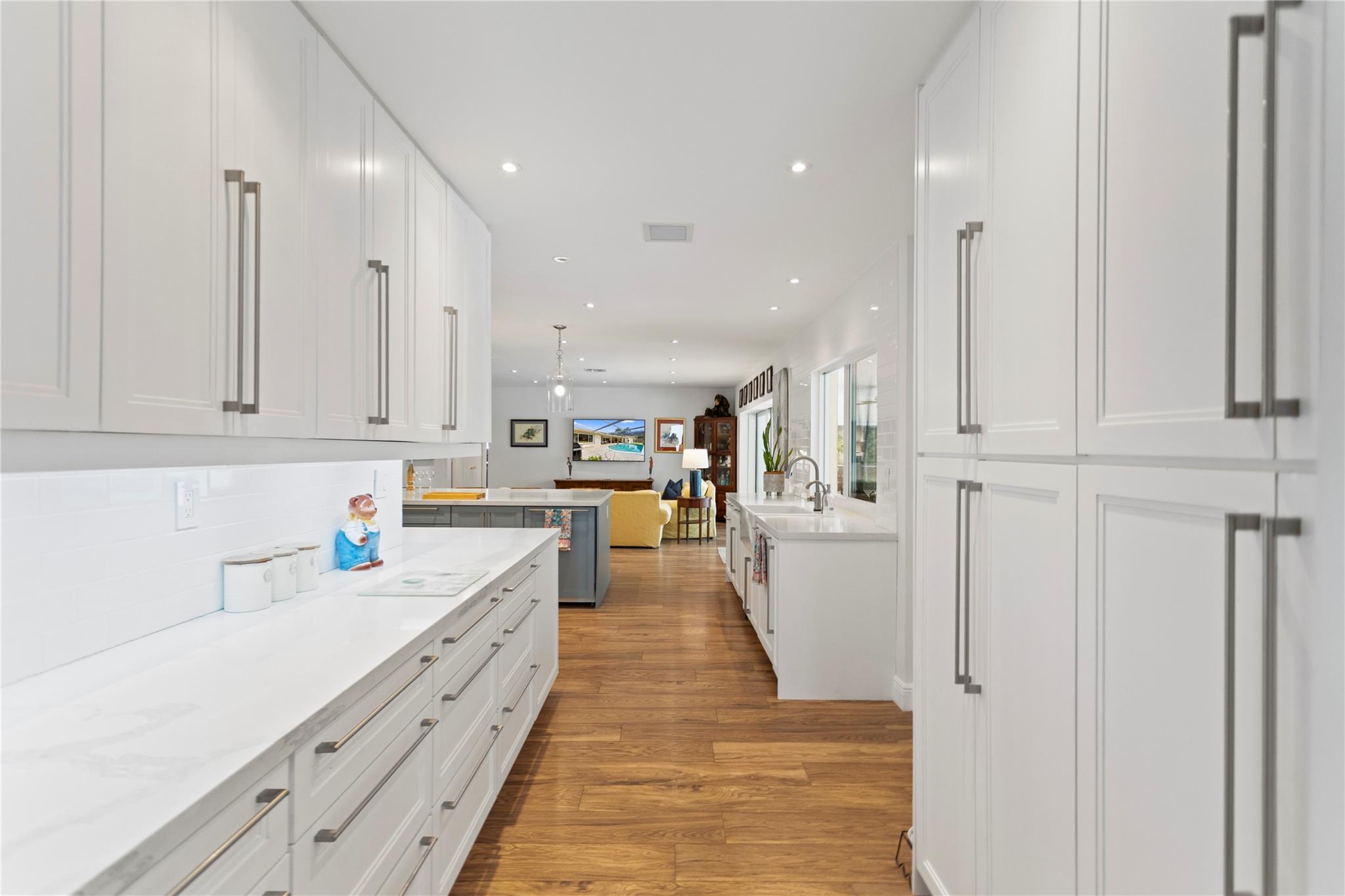 Beautifully renovated 5BR/3BA, OPEN CONCEPT home boasting over 3000 total sqft on a quiet cul-de-sac lot that is roughly 1/2 ACRE. Stunning oversized kitchen with a massive center island, separate full size refrigerator/freezer combo, LG double ovens, pot filler, JennAir extractor, induction cook top and a farmhouse sink with a window overlooking the pool and yard. UPDATED ELECTRICAL PANEL, 2019 A/C, 2018 water heater, 2015 flat roof, 2005 shingle roof, FULL IMPACT WINDOWS AND DOORS. Laminate wood floors throughout, NEW carpet in two bedrooms. Double master suites—perfect for IN-LAWs or guests. Impact sliders retract all the way open to a spacious 34x15 covered patio. The canal connects to Fig Tree lake and park. Circular driveway, great closet space, amazing park-like backyard setting.