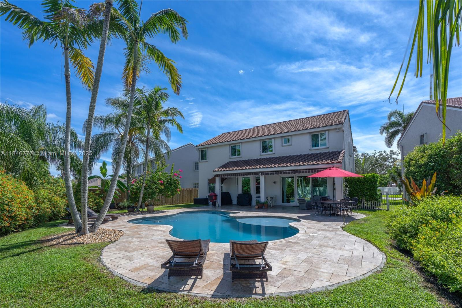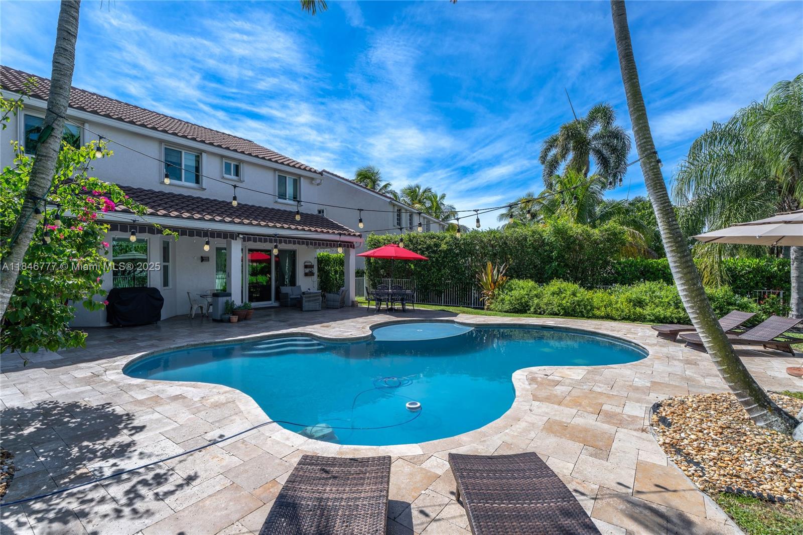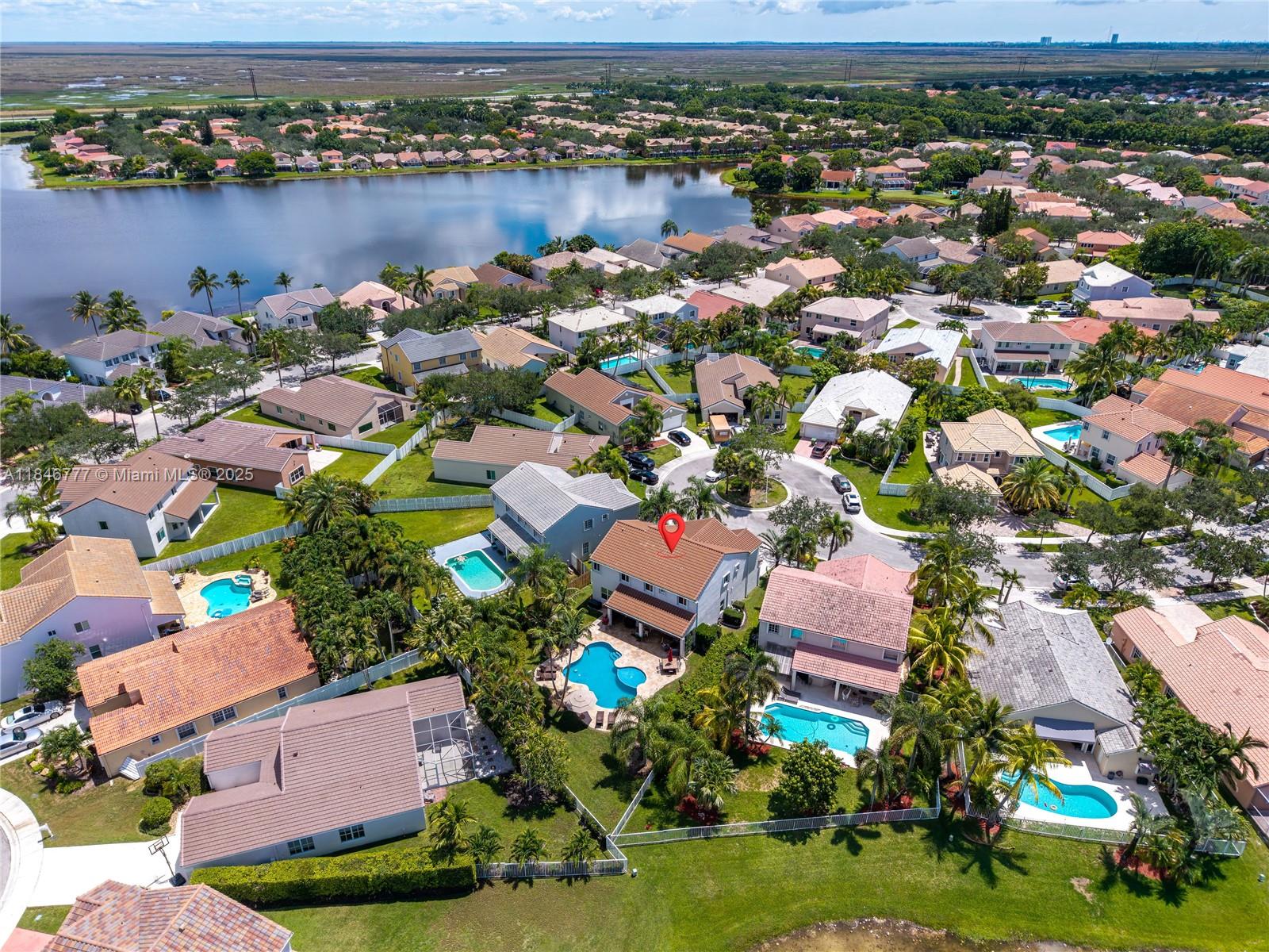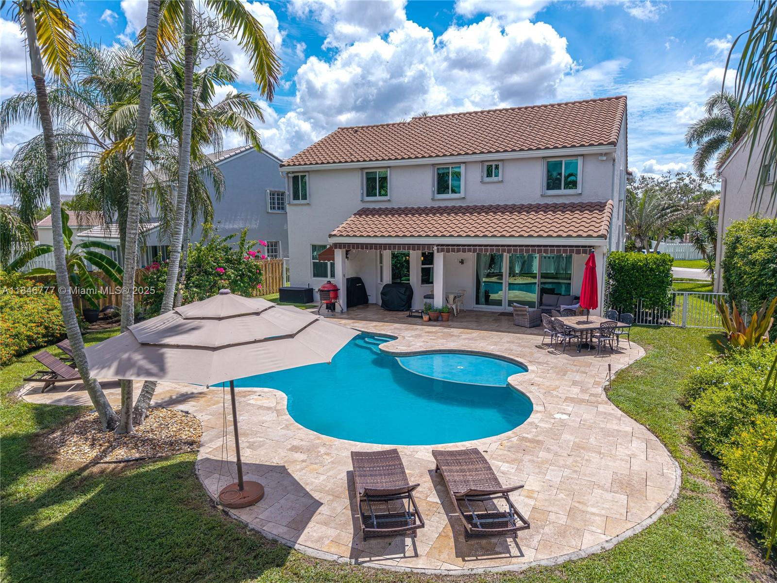 Welcome to your dream home! This beautiful 5-bedroom, 3.5-bath residence offers the perfect elegance and comfort. Enjoy peace of mind with a NEW ROOF and NEW IMPACT WINDOWS AND DOORS throughout. The spacious layout is ideal for both everyday living. This home features a gourmet kitchen with wood cabinets and stainless steal appliances. Resort-style POOL, PRIVATE and fully FENCED BACKYARD, covered patio, and child safety pool fence—perfect for entertaining. Serene lake view with no water access. Quiet cul-de-sac in a family-oriented community, The Falls. Gated community offers pool, playground and a basketball court. Roof 2022, Impact windows 2022, interior paint 2023, exterior paint 2022, AC 2023 condenser unit (outdoor)/2009 Evaporator Coil/Air Handler (indoor). All bedrooms are upstairs.