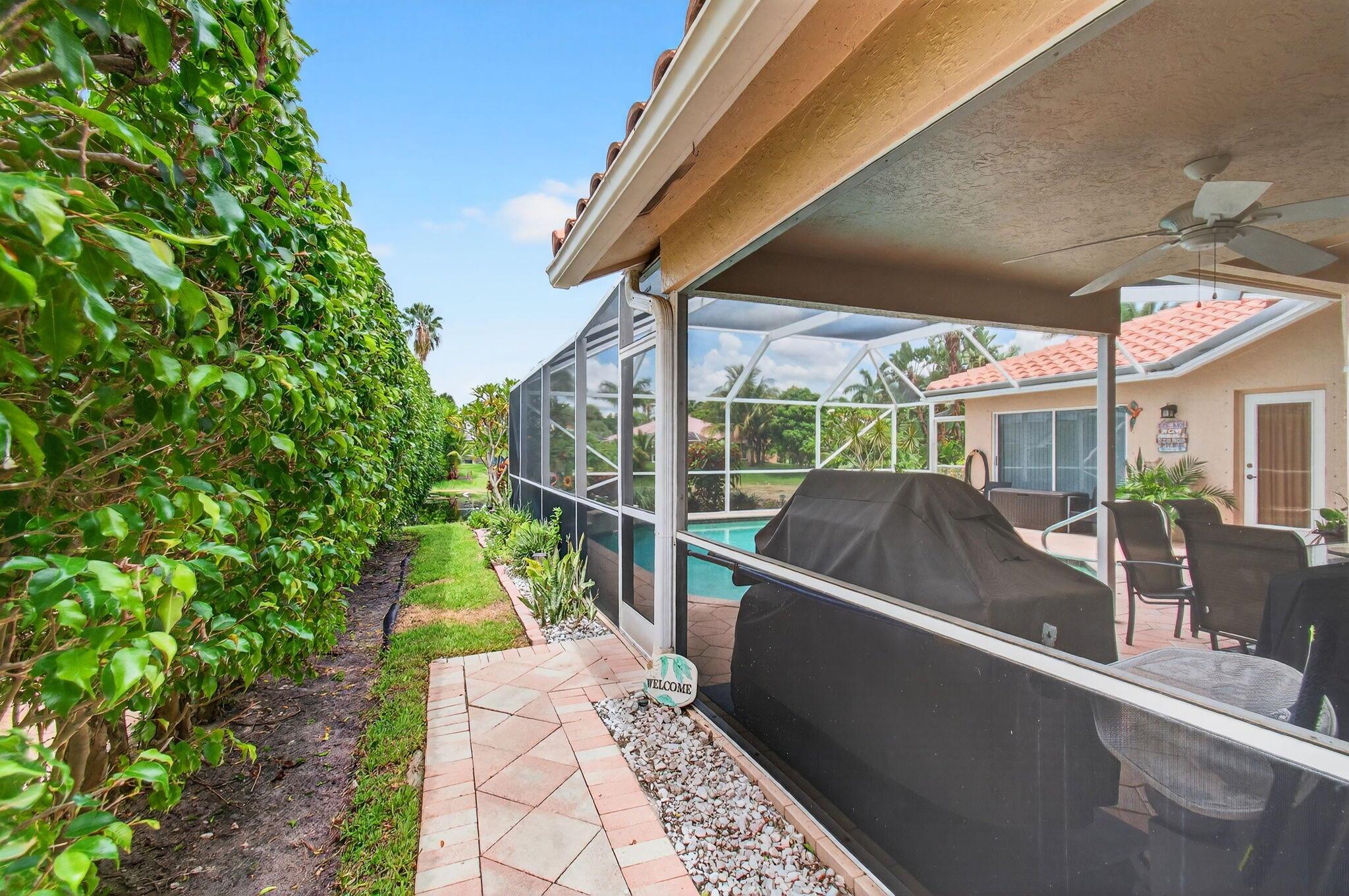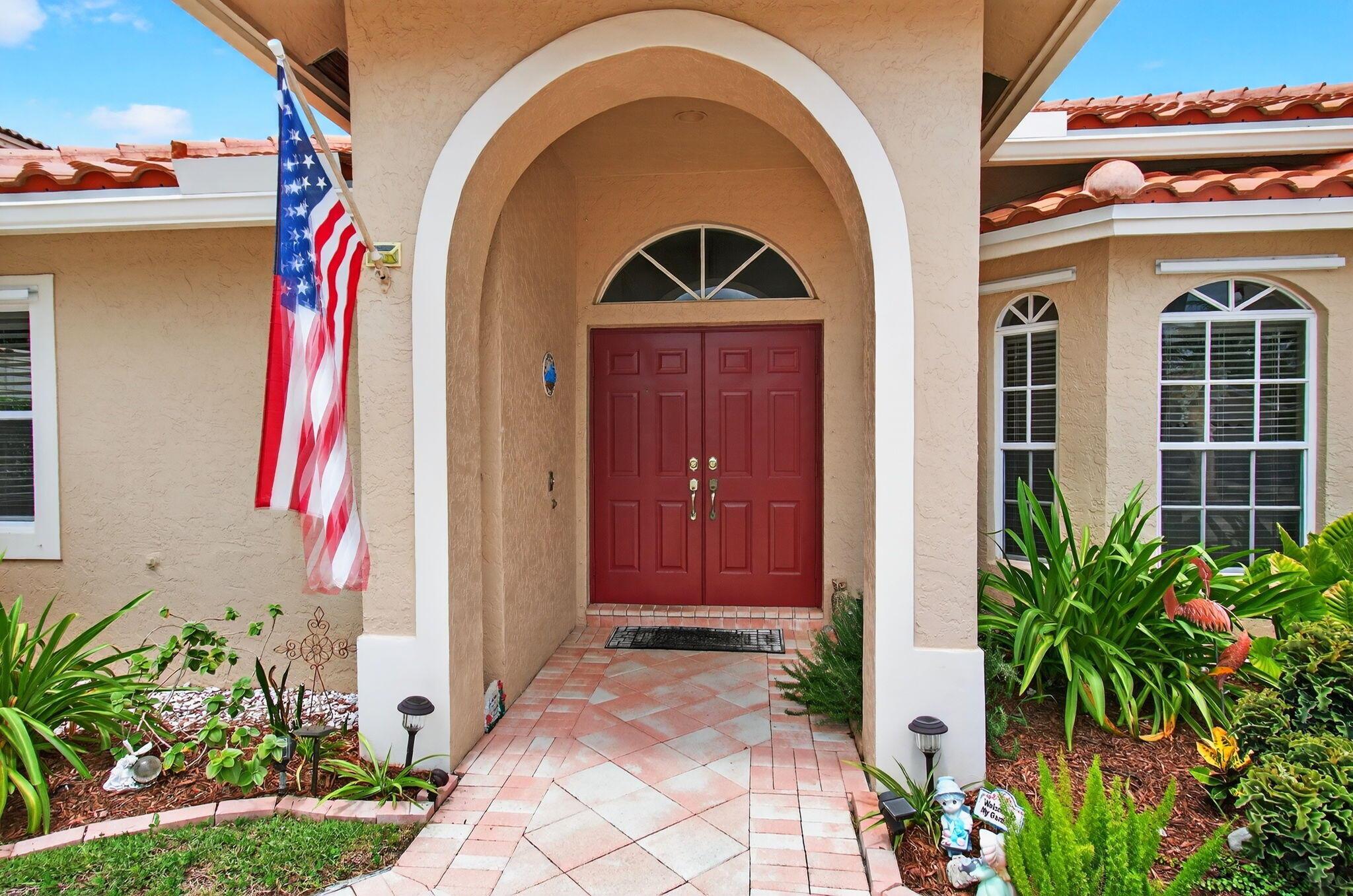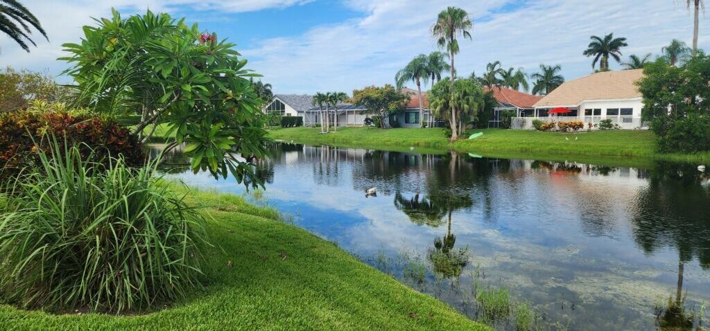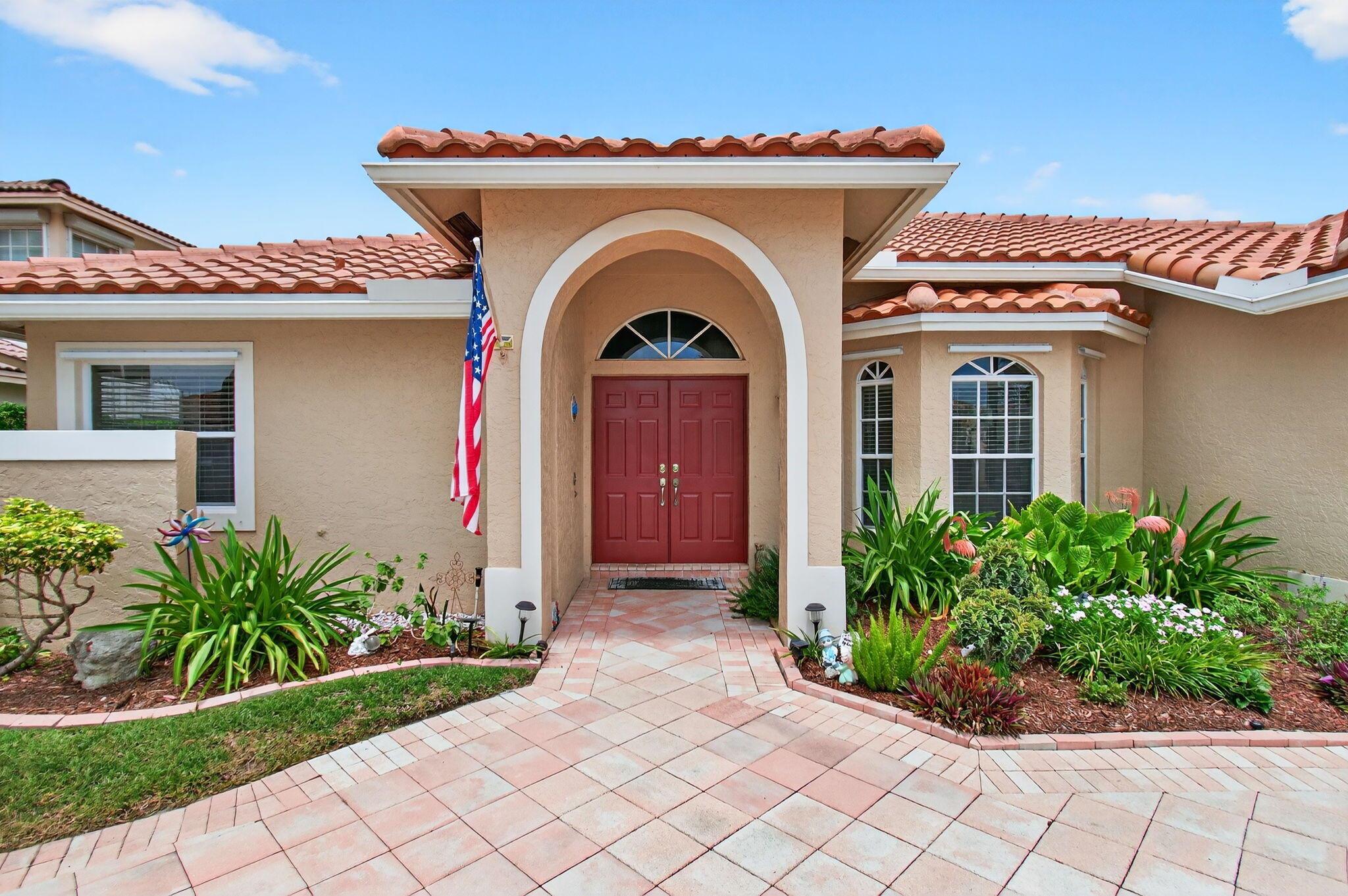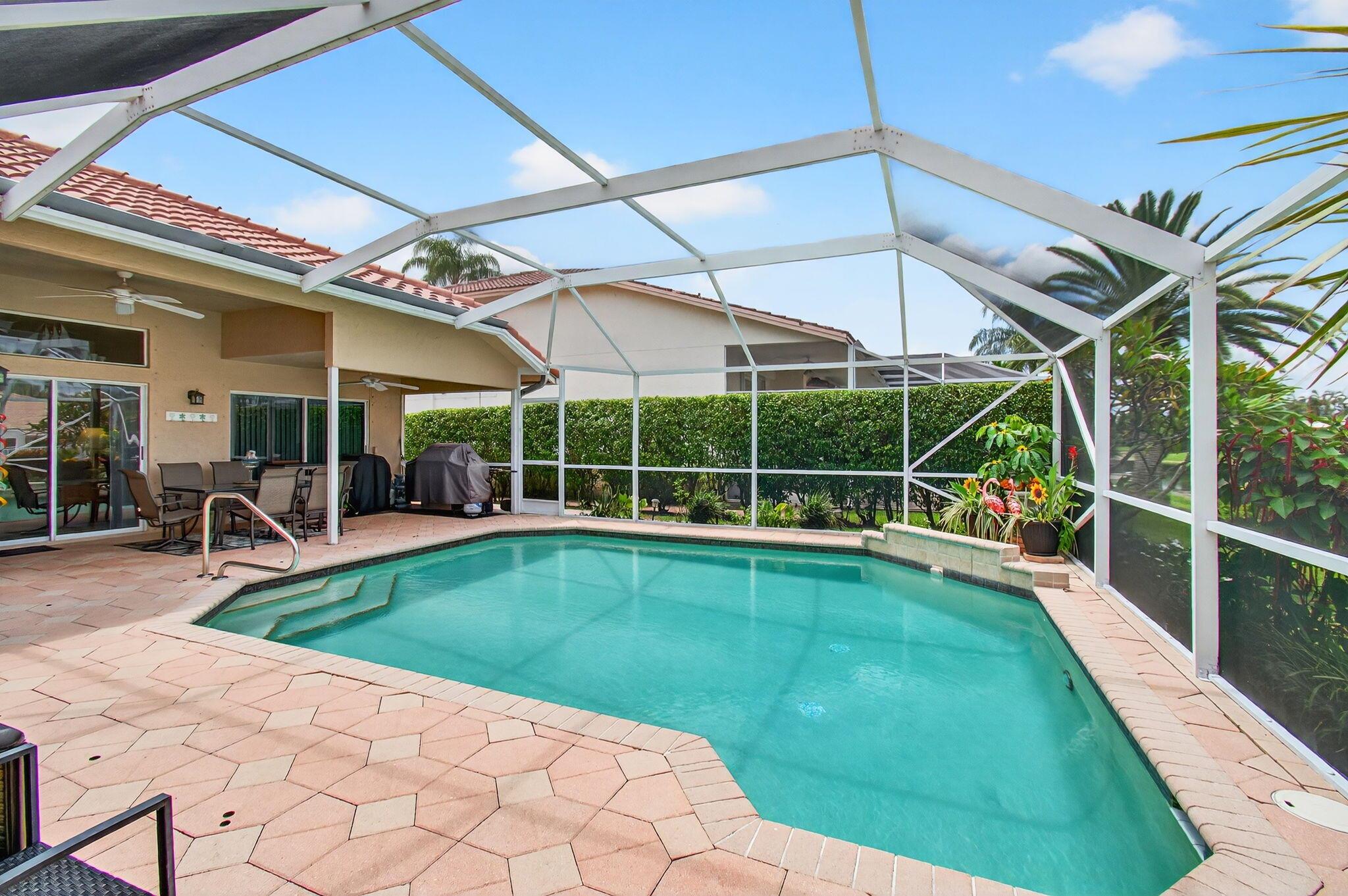 Rare opportunity to live in the boutique gated community of Boynton Waters. This beautifully maintained and updated 4 bedroom / 3 bath pool home. A new roof was installed Sept 2024 with a 15 year transferable warranty. Open floor plan features vaulted ceilings, crown molding and custom blinds. The gourmet kitchen features wood cabinetry, granite counters, slate appliances and a breakfast bar that opens to the family room. The oversized owner's suite boasts a walk-in closet and ensuite bath with a soaking tub, dual vanities, marble shower and floors plus sliding door access to the outdoor patio. The split floor plan offers privacy and the secondary bedroom features an ensuite handicap accessible bathroom.