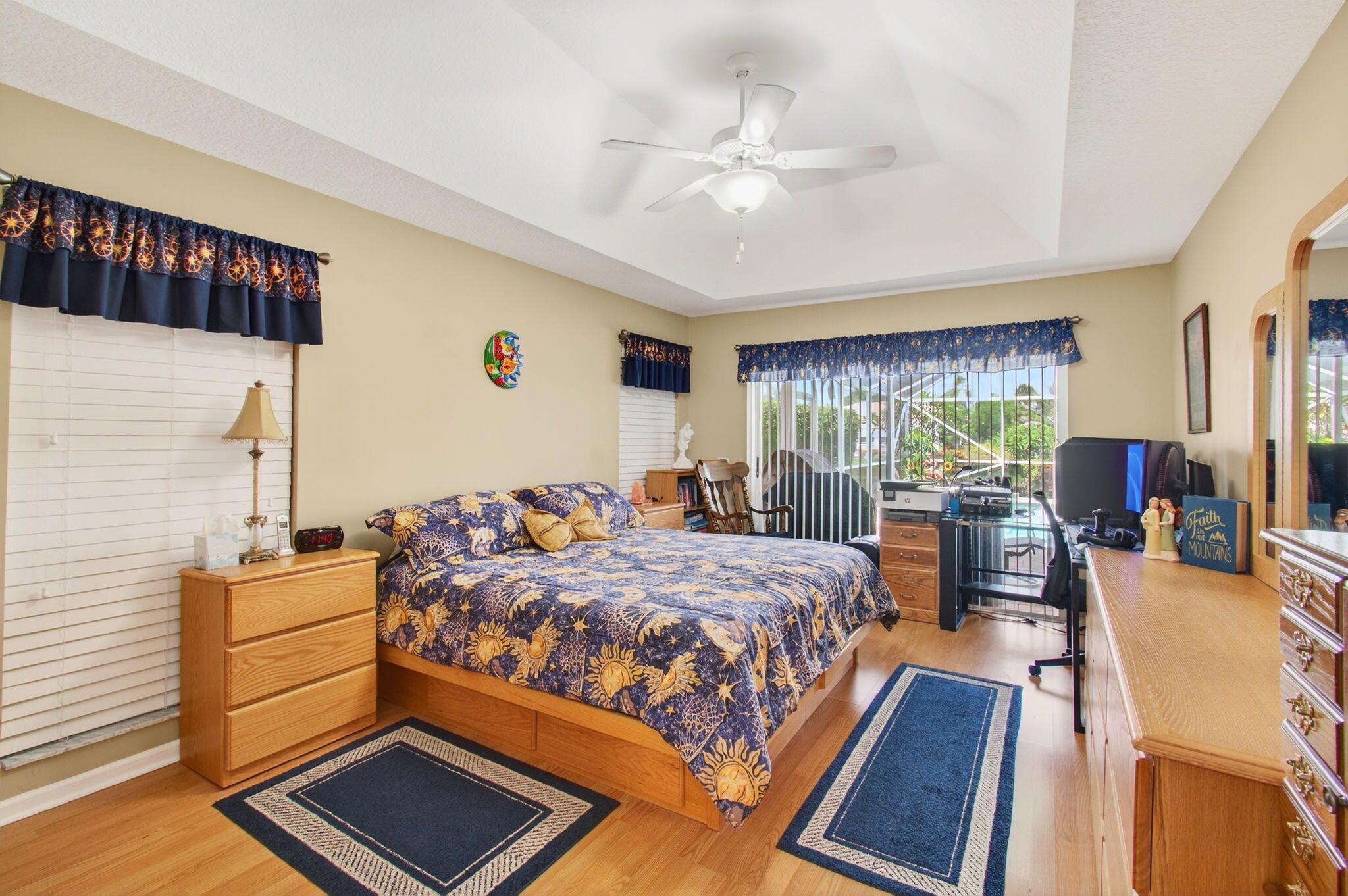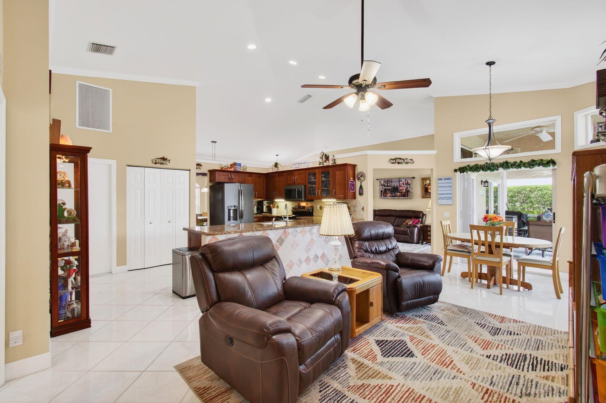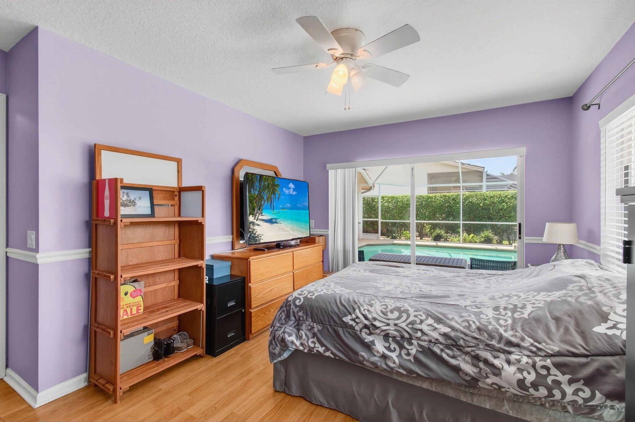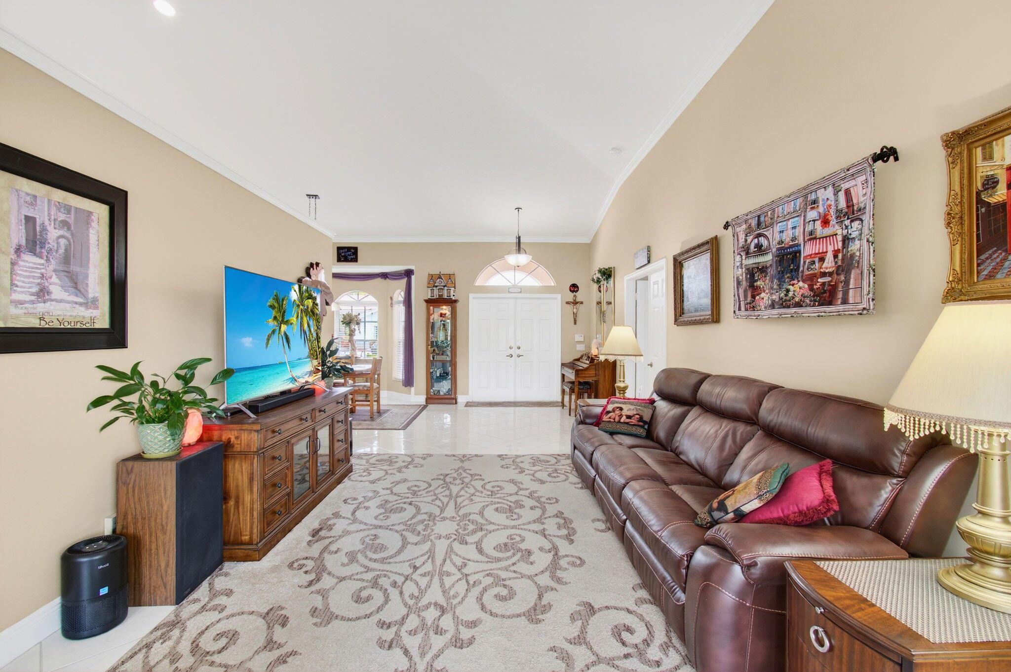 Rare opportunity to live in the boutique gated community of Boynton Waters. This beautifully maintained and updated 4 bedroom / 3 bath pool home. A new roof was installed Sept 2024 with a 15 year transferable warranty. Open floor plan features vaulted ceilings, crown molding and custom blinds. The gourmet kitchen features wood cabinetry, granite counters, slate appliances and a breakfast bar that opens to the family room. The oversized owner's suite boasts a walk-in closet and ensuite bath with a soaking tub, dual vanities, marble shower and floors plus sliding door access to the outdoor patio. The split floor plan offers privacy and the secondary bedroom features an ensuite handicap accessible bathroom.