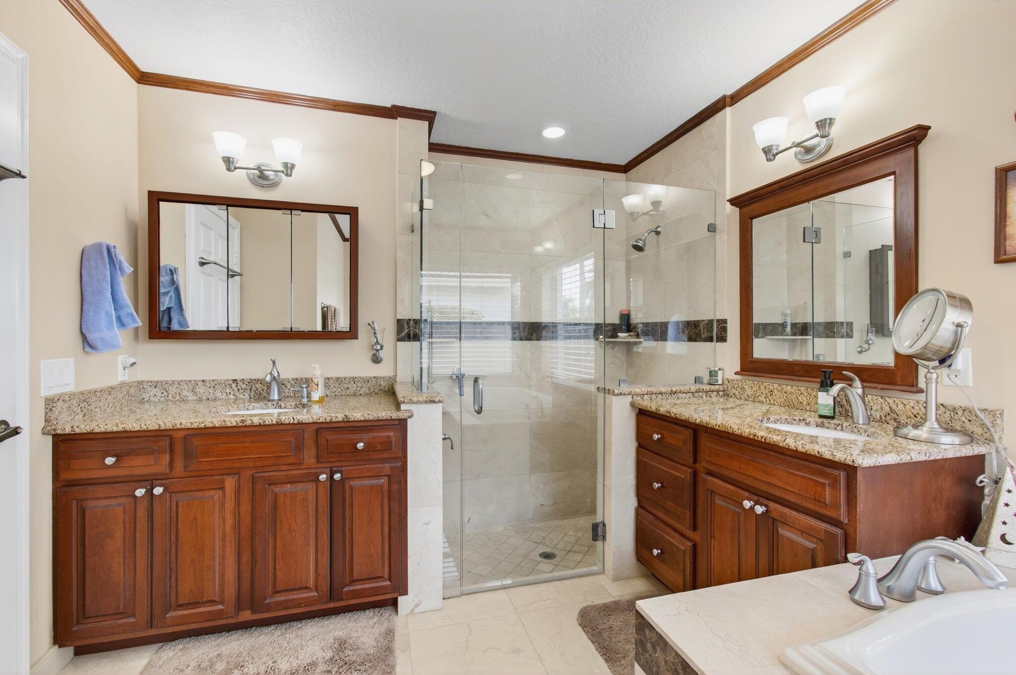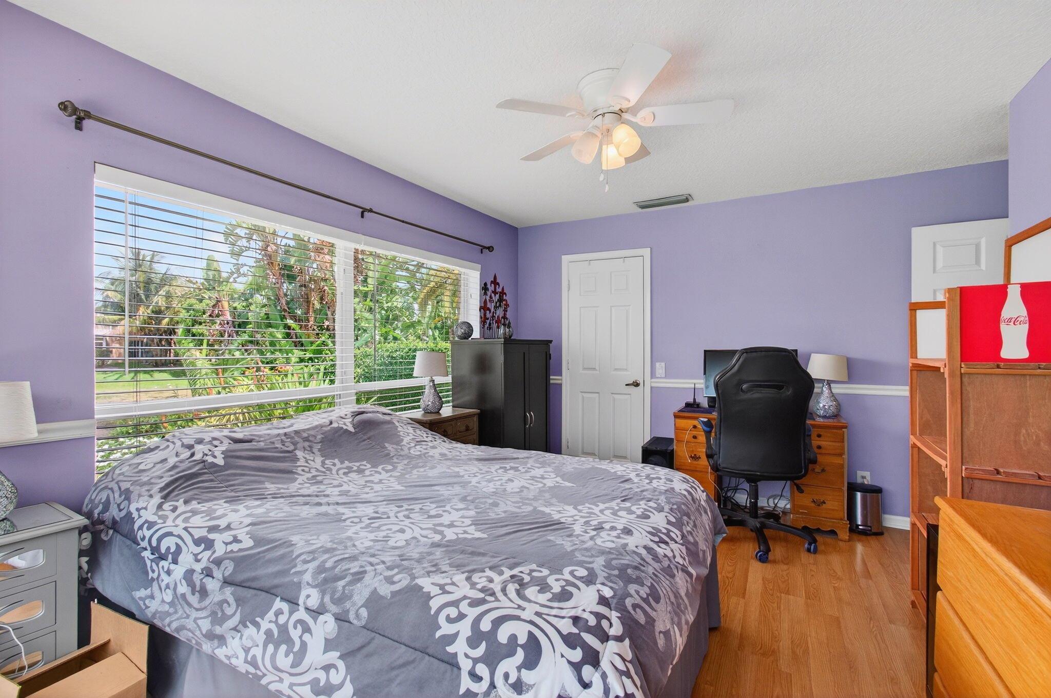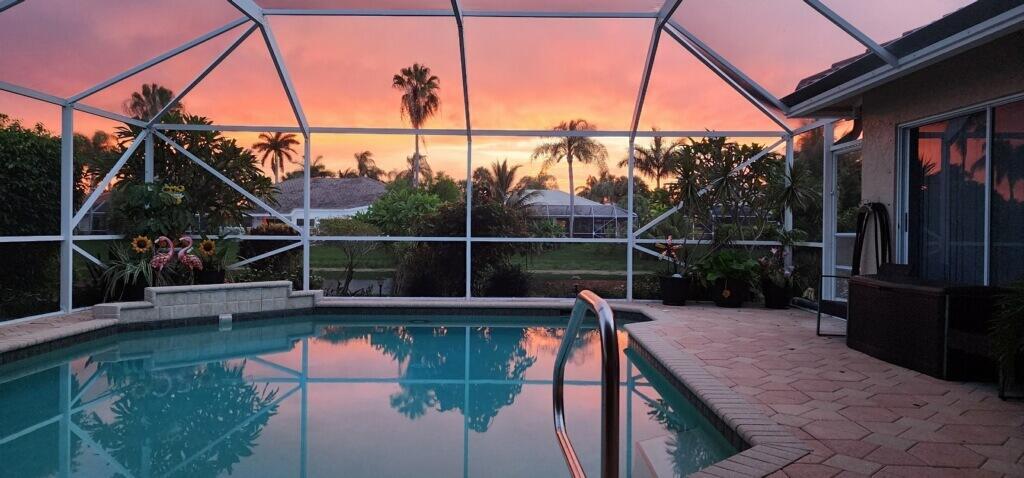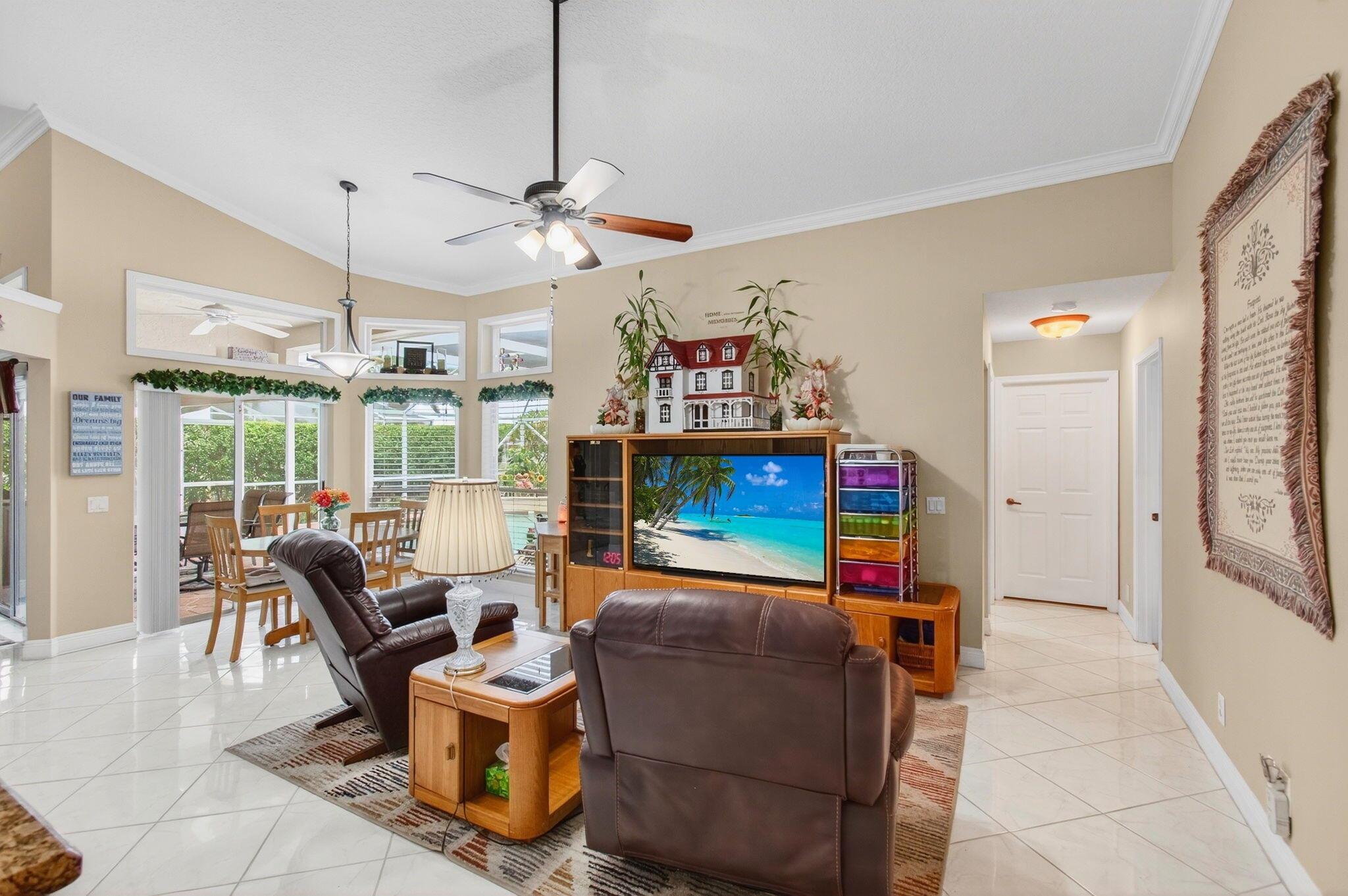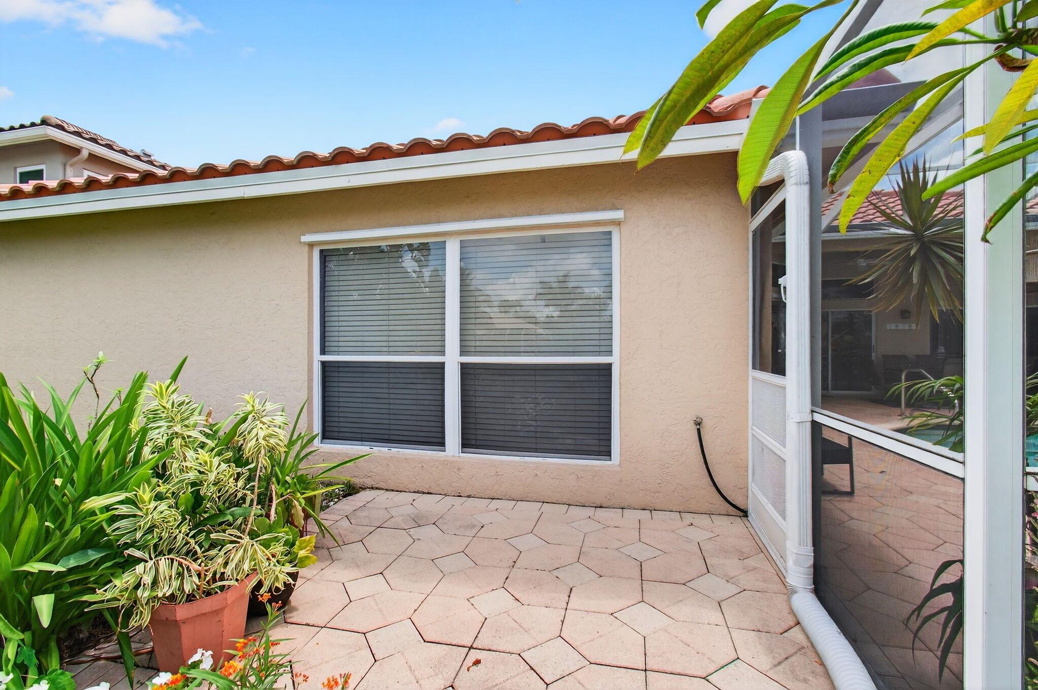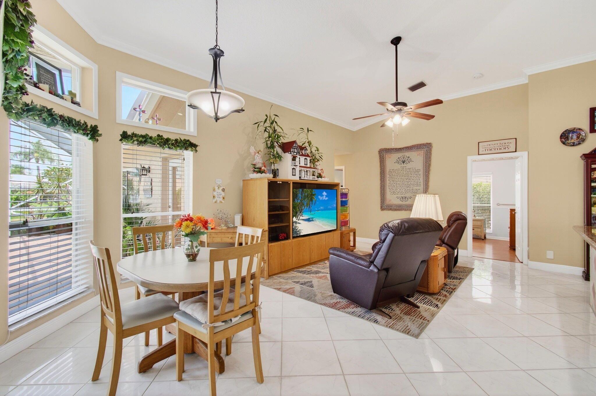 Rare opportunity to live in the boutique gated community of Boynton Waters. This beautifully maintained and updated 4 bedroom / 3 bath pool home. A new roof was installed Sept 2024 with a 15 year transferable warranty. Open floor plan features vaulted ceilings, crown molding and custom blinds. The gourmet kitchen features wood cabinetry, granite counters, slate appliances and a breakfast bar that opens to the family room. The oversized owner's suite boasts a walk-in closet and ensuite bath with a soaking tub, dual vanities, marble shower and floors plus sliding door access to the outdoor patio. The split floor plan offers privacy and the secondary bedroom features an ensuite handicap accessible bathroom.