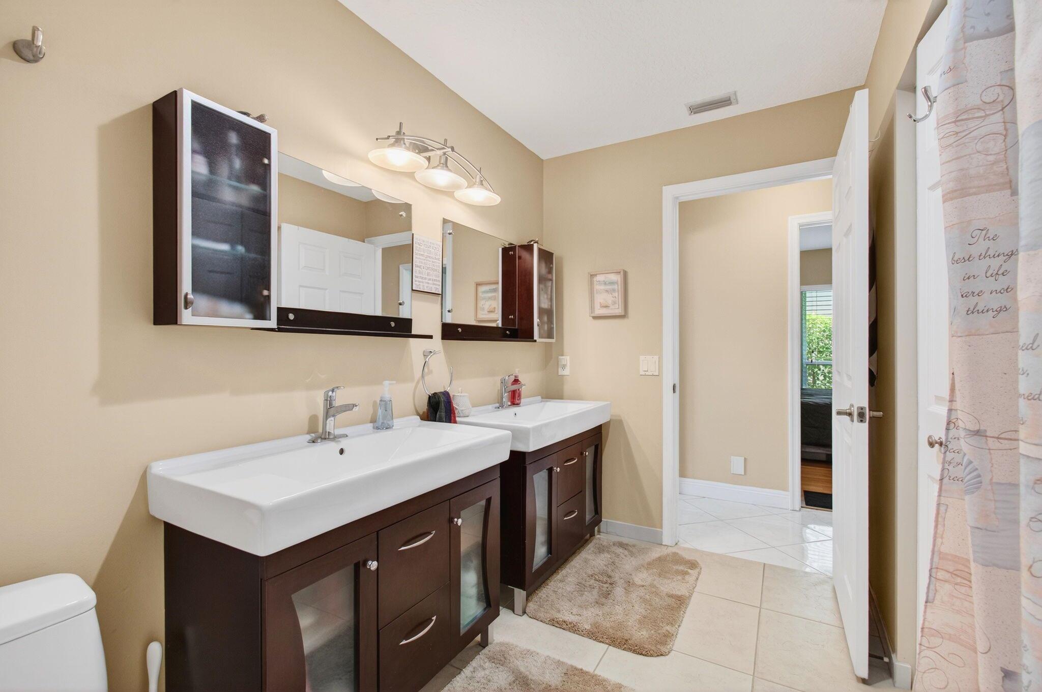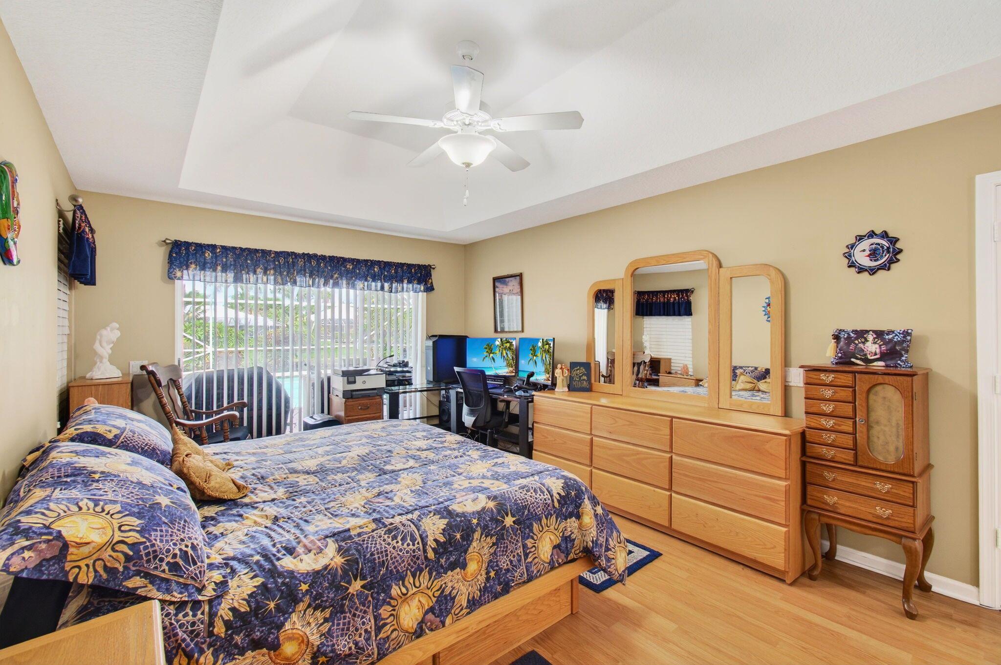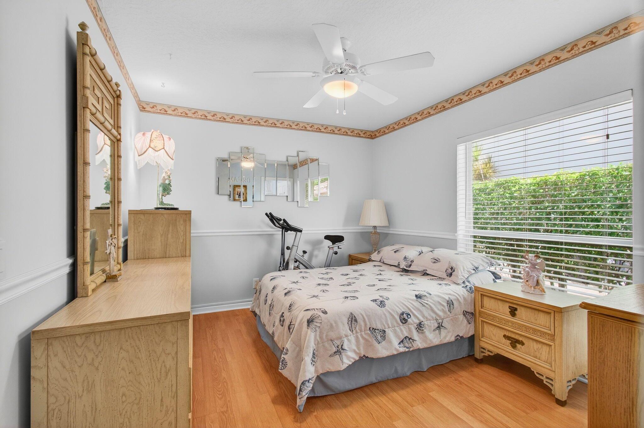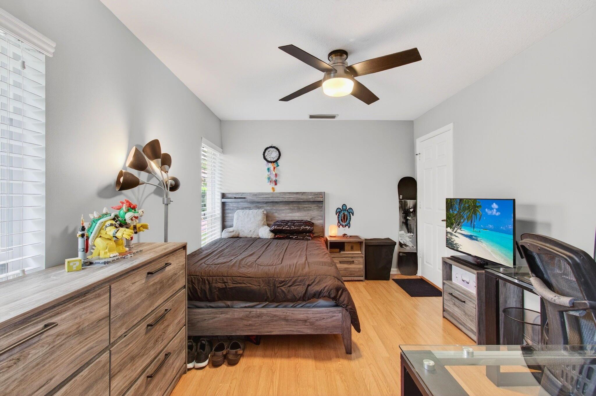 Rare opportunity to live in the boutique gated community of Boynton Waters. This beautifully maintained and updated 4 bedroom / 3 bath pool home. A new roof was installed Sept 2024 with a 15 year transferable warranty. Open floor plan features vaulted ceilings, crown molding and custom blinds. The gourmet kitchen features wood cabinetry, granite counters, slate appliances and a breakfast bar that opens to the family room. The oversized owner's suite boasts a walk-in closet and ensuite bath with a soaking tub, dual vanities, marble shower and floors plus sliding door access to the outdoor patio. The split floor plan offers privacy and the secondary bedroom features an ensuite handicap accessible bathroom.