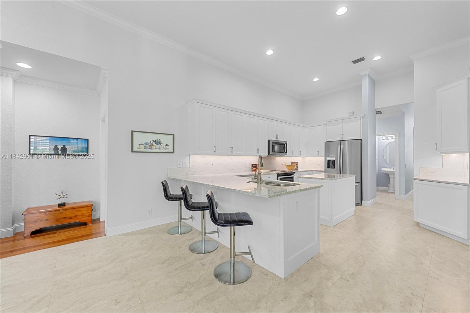 Nestled on a royal-palm cul-de-sac in gated Weston Hills Country Club, this fully renovated 4-bed and den, 3.5-bath single-story residence lives like new. A 2024 flat-tile roof, 2 new 2025 HVAC, and fresh landscaping deliver true turnkey ease. Italian tile stretches through open living areas while warm wood floors enrich each bedroom. The chef’s kitchen shines with quartz counters, stainless appliances, an island, and sleek cabinetry. All baths are updated; the primary suite spoils with a sitting area, dual walk-in closets, and a spa-inspired bath. A fully hedged backyard grants total privacy and room to design your dream pool or play space. Stroll to Hunter’s Pointe Park Weston Hills’ only soccer field, plus basketball court and playground just minutes away.