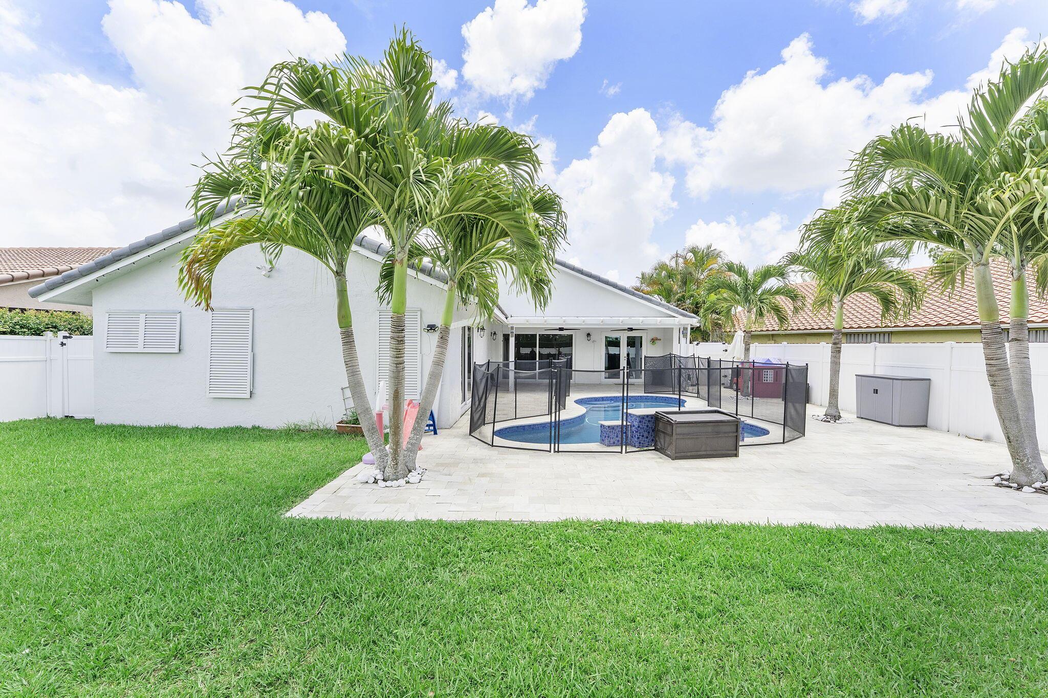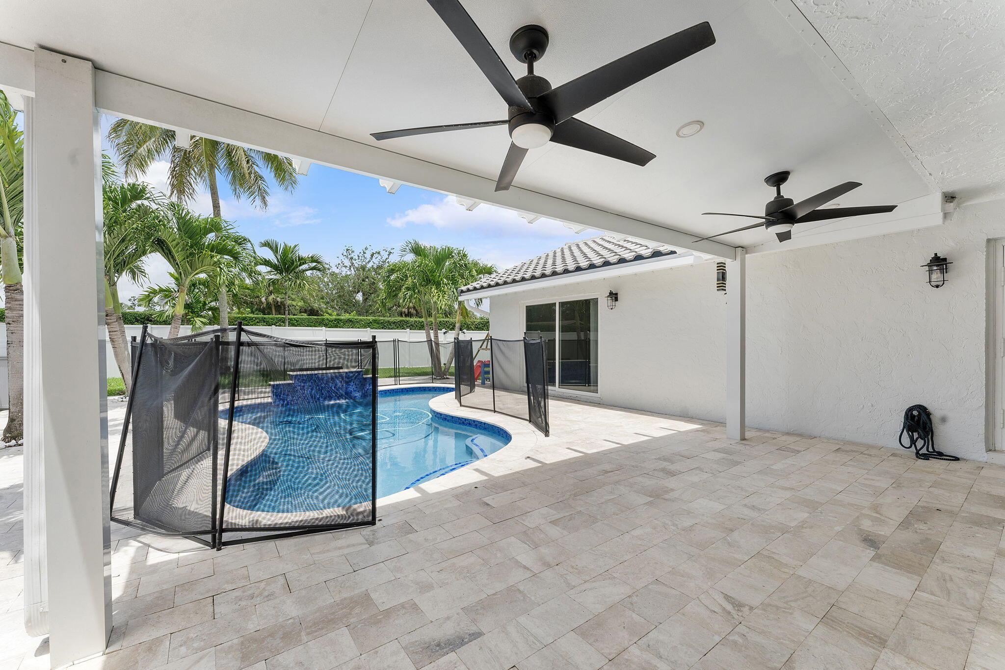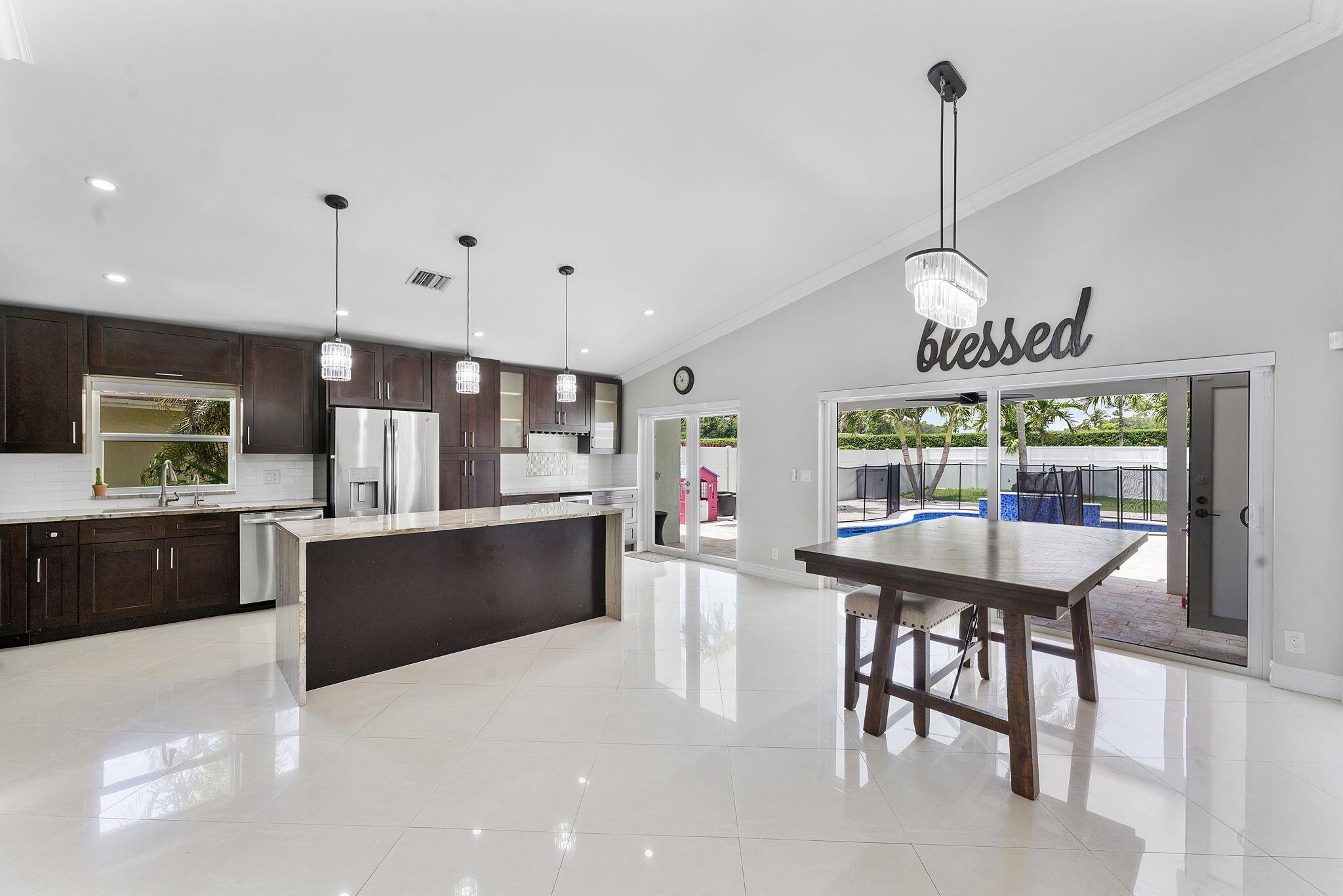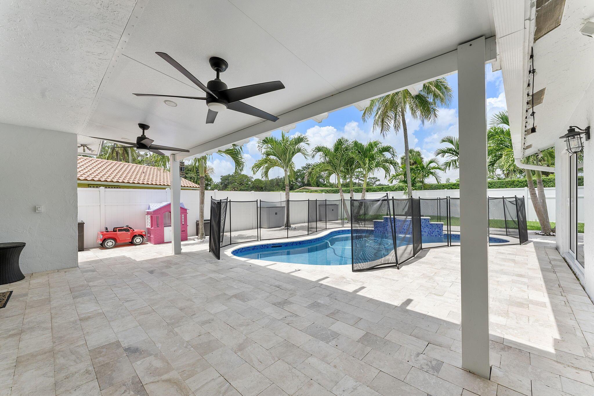 Welcome to this impressive 4-bedroom, 2.5-bathroom pool home with a 2-car garage, perfectly situated on an ultra-private lot just steps from top-rated Del Prado Elementary. Completely renovated from top to bottom with no expense spared, this stunning residence offers refined elegance and modern comfort in the heart of Central Boca Raton. Discover an open and airy layout with soaring vaulted ceilings and sleek porcelain tile flooring throughout. The spacious, chef-inspired kitchen is a true showstopper featuring quartz countertops with a waterfall edge, soft-close cabinetry, and premium stainless steel appliances. Enjoy indoor-outdoor living with a screened patio that opens to a lushly landscaped backyard oasis, complete with a sparkling tropical pool and fully fenced yard