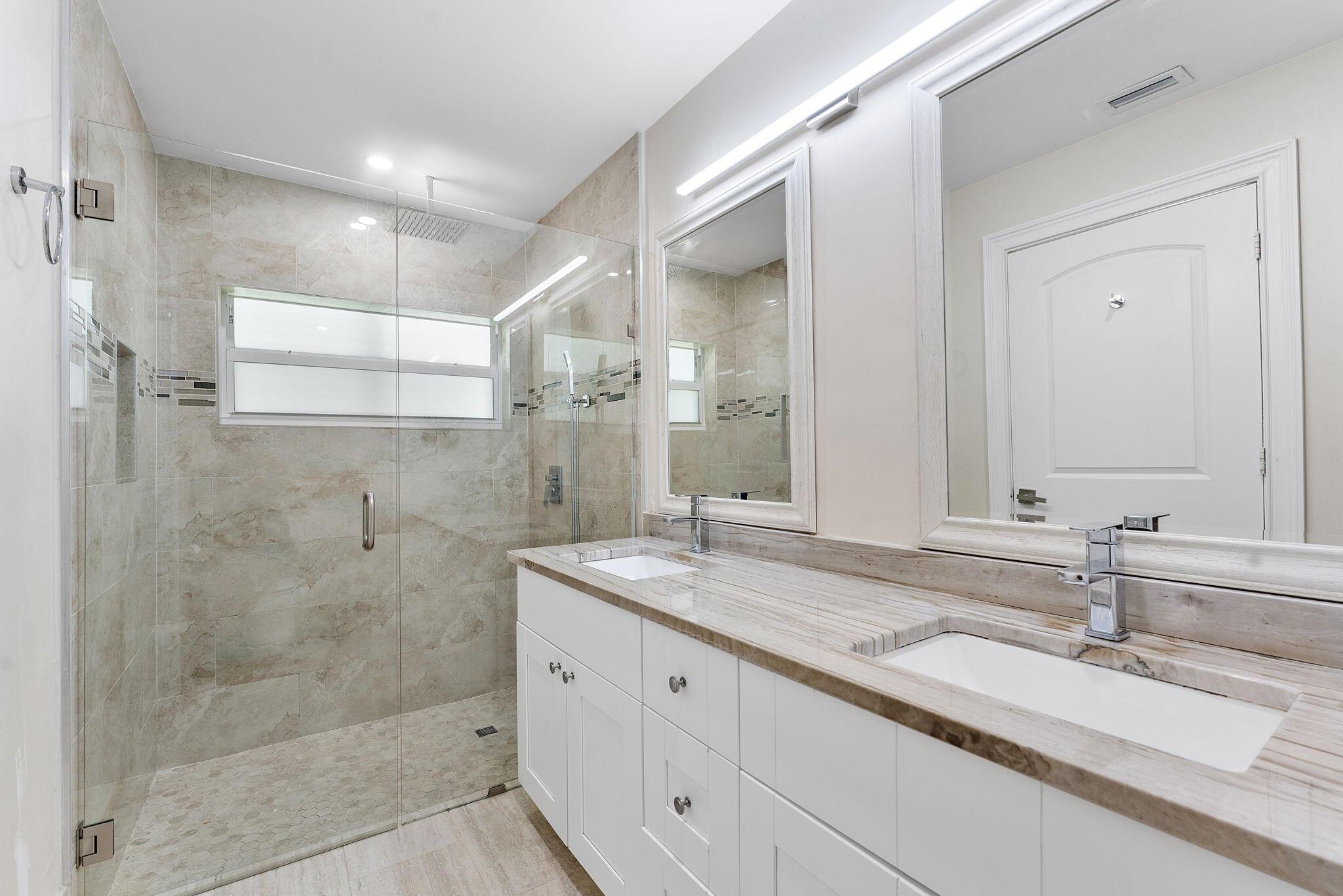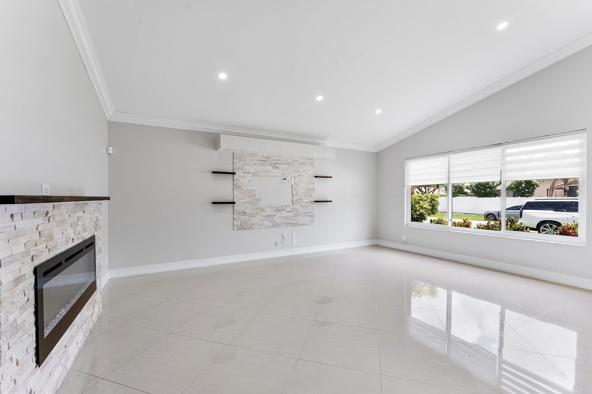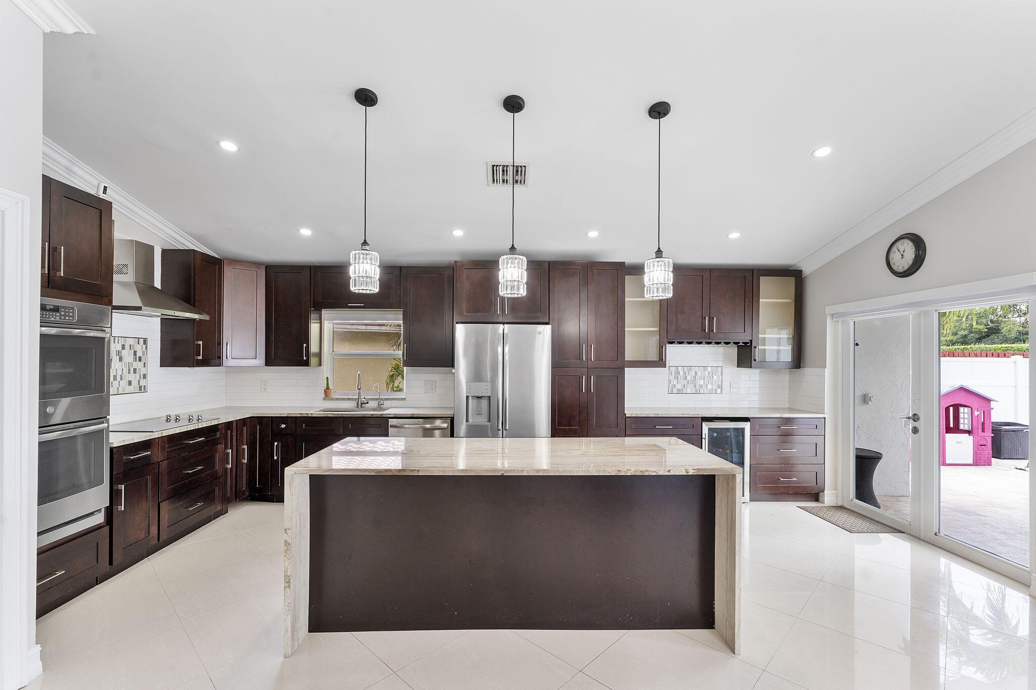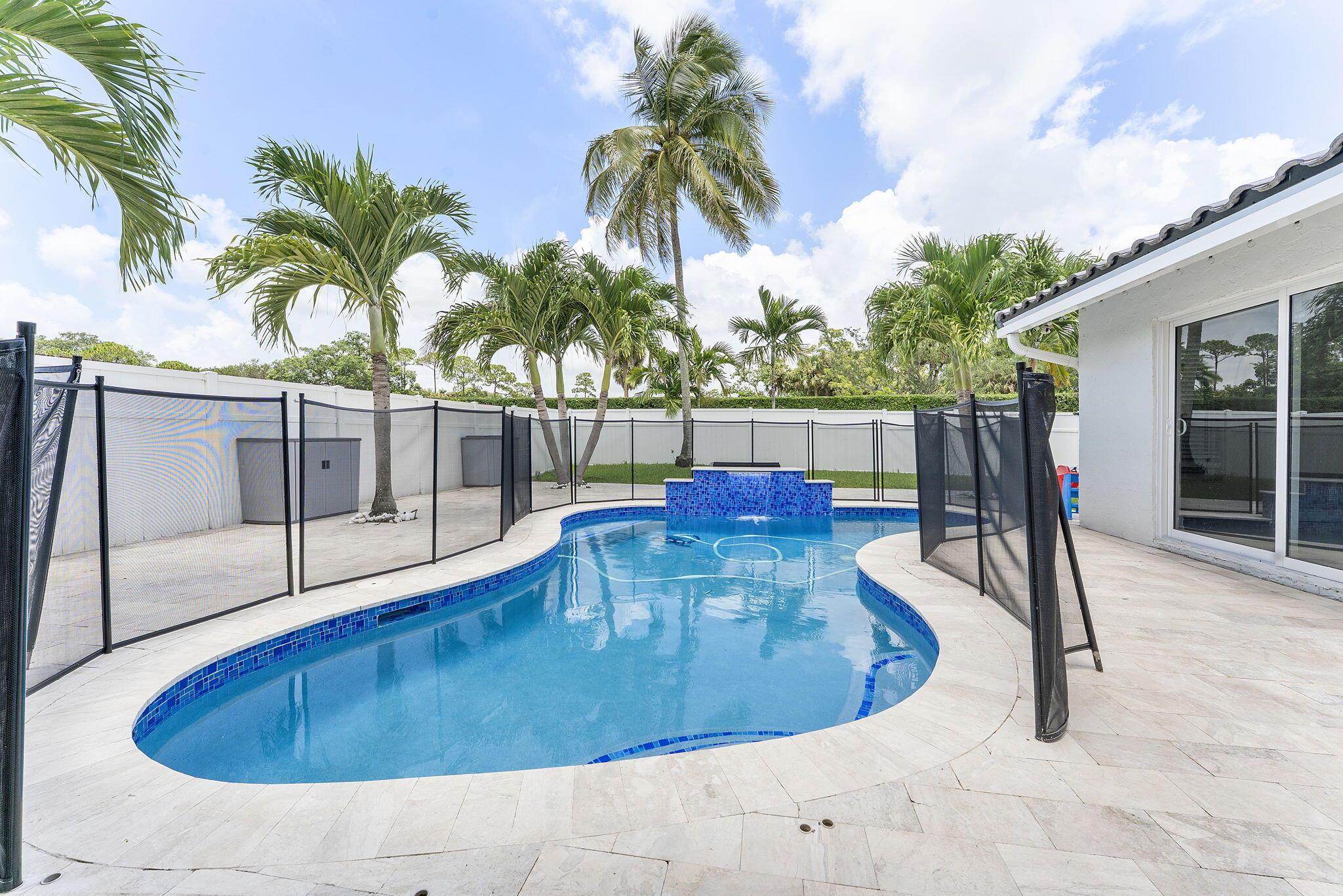 Welcome to this impressive 4-bedroom, 2.5-bathroom pool home with a 2-car garage, perfectly situated on an ultra-private lot just steps from top-rated Del Prado Elementary. Completely renovated from top to bottom with no expense spared, this stunning residence offers refined elegance and modern comfort in the heart of Central Boca Raton. Discover an open and airy layout with soaring vaulted ceilings and sleek porcelain tile flooring throughout. The spacious, chef-inspired kitchen is a true showstopper featuring quartz countertops with a waterfall edge, soft-close cabinetry, and premium stainless steel appliances. Enjoy indoor-outdoor living with a screened patio that opens to a lushly landscaped backyard oasis, complete with a sparkling tropical pool and fully fenced yard