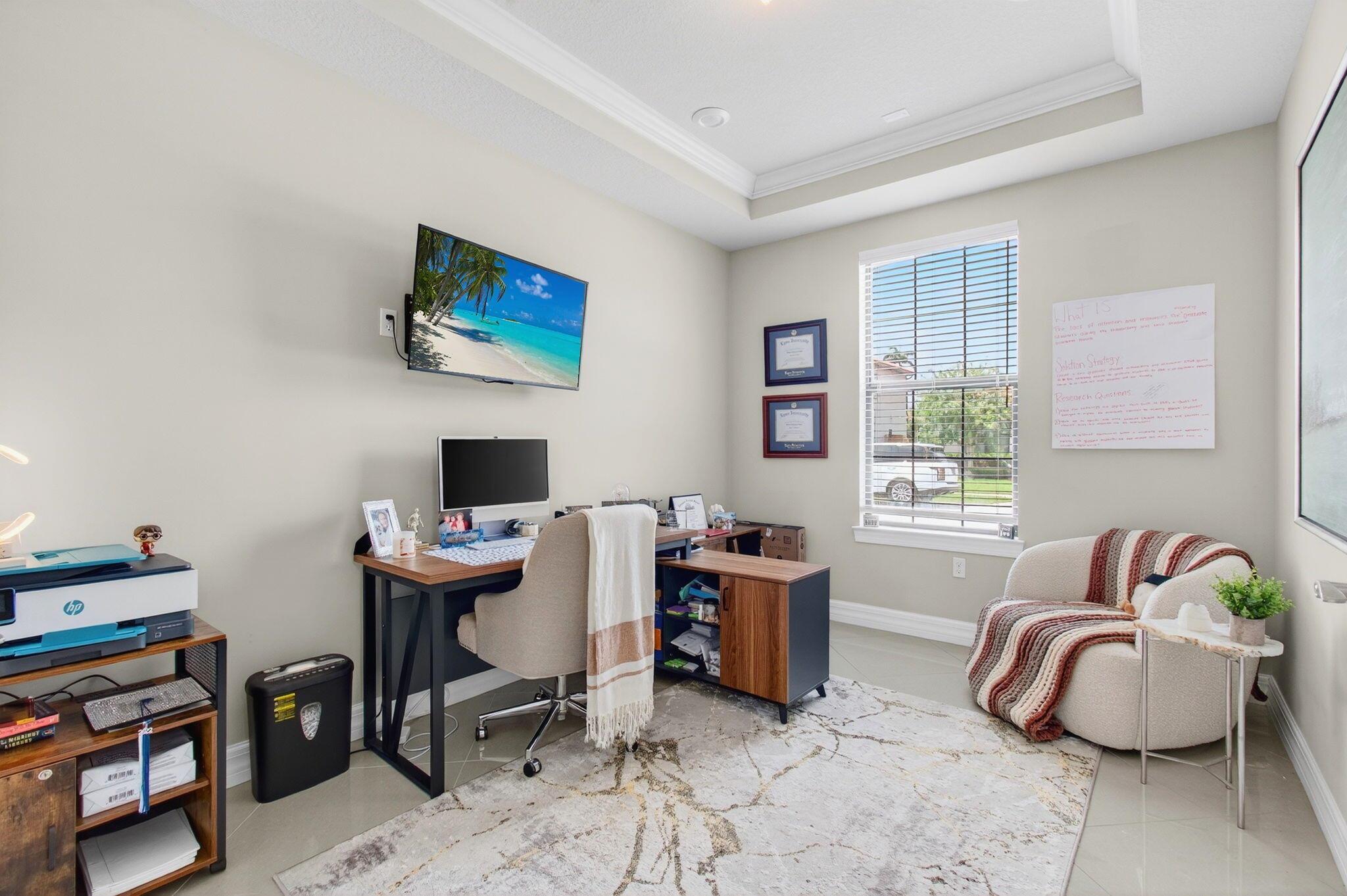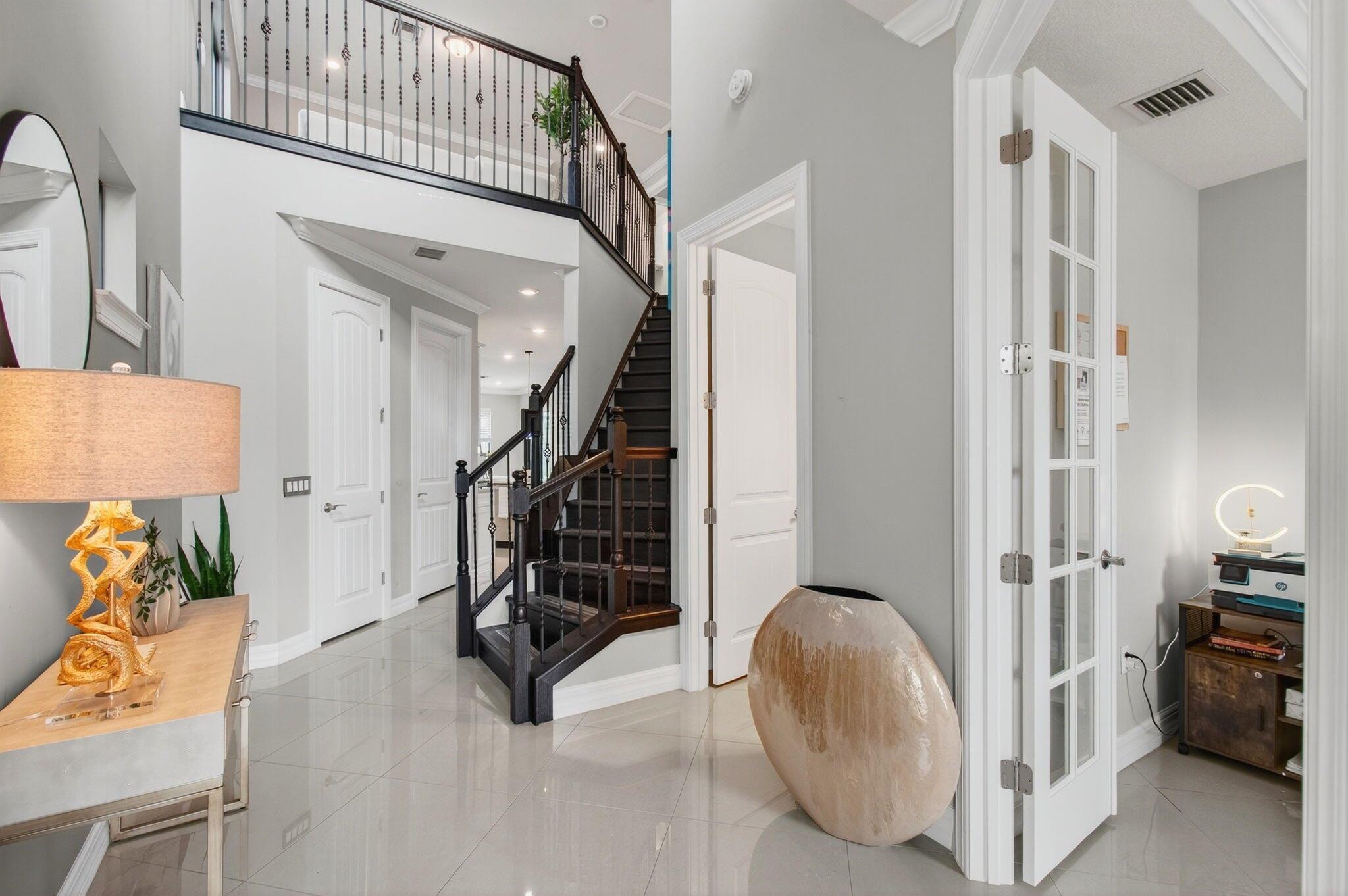 Welcome to this beautifully appointed 2018-built single family home located in the prestigious Fields at Gulf Stream Polo. This spacious 4-bedroom + office, 2.5-bathroom residence offers nearly 3,000 square feet of thoughtfully designed living space. The main level features sleek porcelain tile floors, an elegant office, and an open-concept kitchen that flows seamlessly into the living area with soaring volume ceilings. The gourmet kitchen is equipped with a large center island, walk-in pantry, and ample counter space--perfect for entertaining. Upstairs, you'll find a versatile loft along with all four generously sized bedrooms. Impact windows and doors throughout the home provide peace of mind and energy efficiency. Step outside to your private backyard oasis, where a south-facing​​‌​​​​‌​‌​​​​‌‌​‌​​​​‌‌​​‌‌​​‌‌ fenced