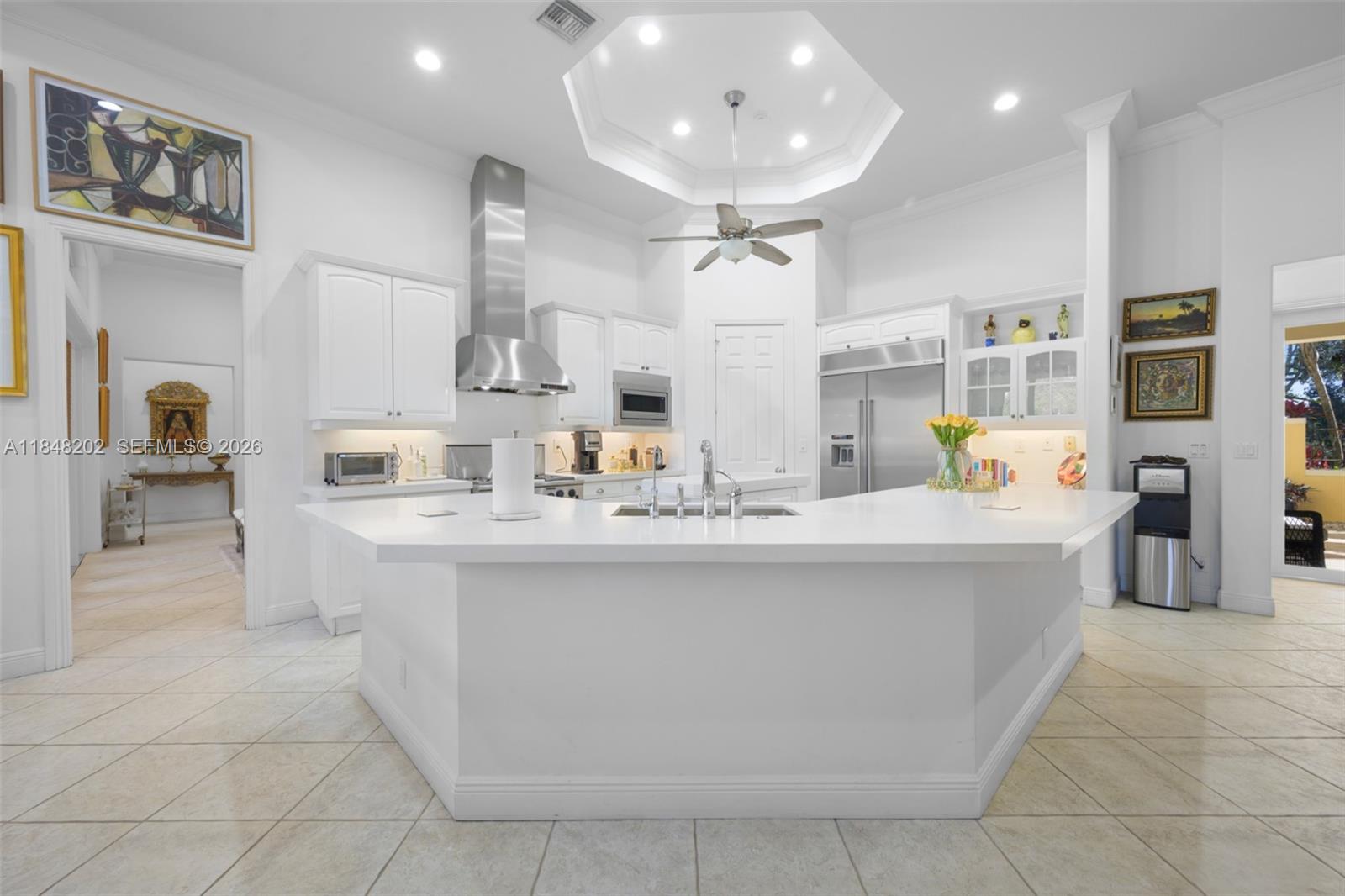 Gated 2.24 acre estate in exclusive Sunshine Ranches offering unmatched privacy, space, and tropical luxury. This 7 bedroom, 6.5 bath hacienda style residence (including a den) also features a separate office, wood and tile flooring, crown molding, and generous living areas filled with natural light. The fully fenced grounds are a true tropical paradise professionally landscaped with over $300K in mature palms and exotic plants, plus over $20K in custom outdoor lighting. Outdoor highlights include an expansive travertine deck, scenic walking trails, and a tiki hut overlooking a serene private lagoon. Additional features include a 4 car garage, whole house generator, 500 gallon underground propane tank, and security cameras. A rare find in prestigious Southwest Ranches.