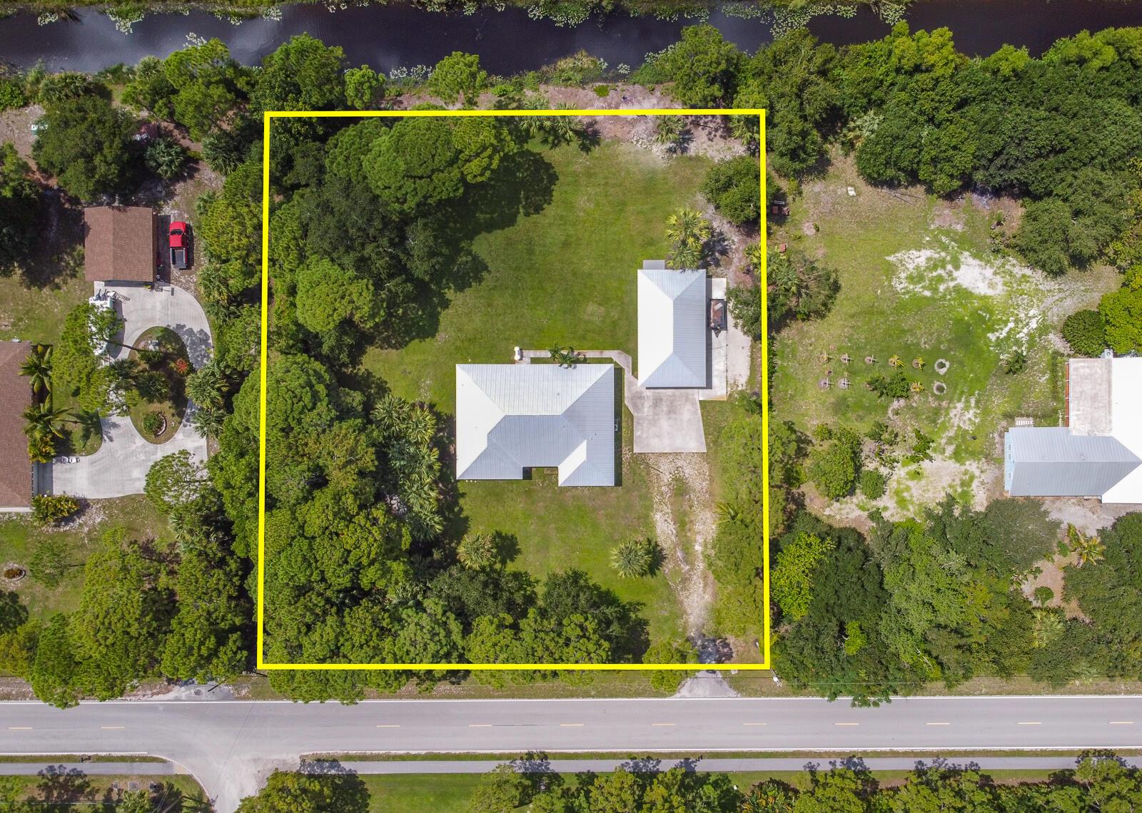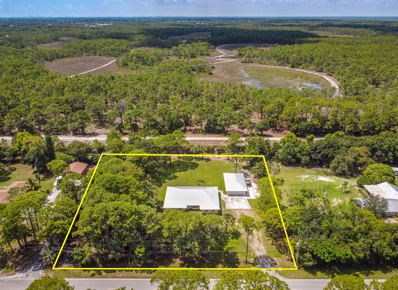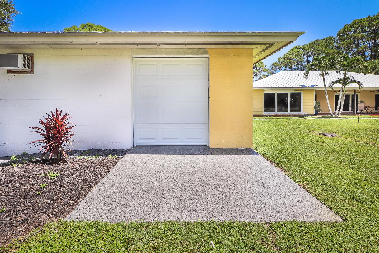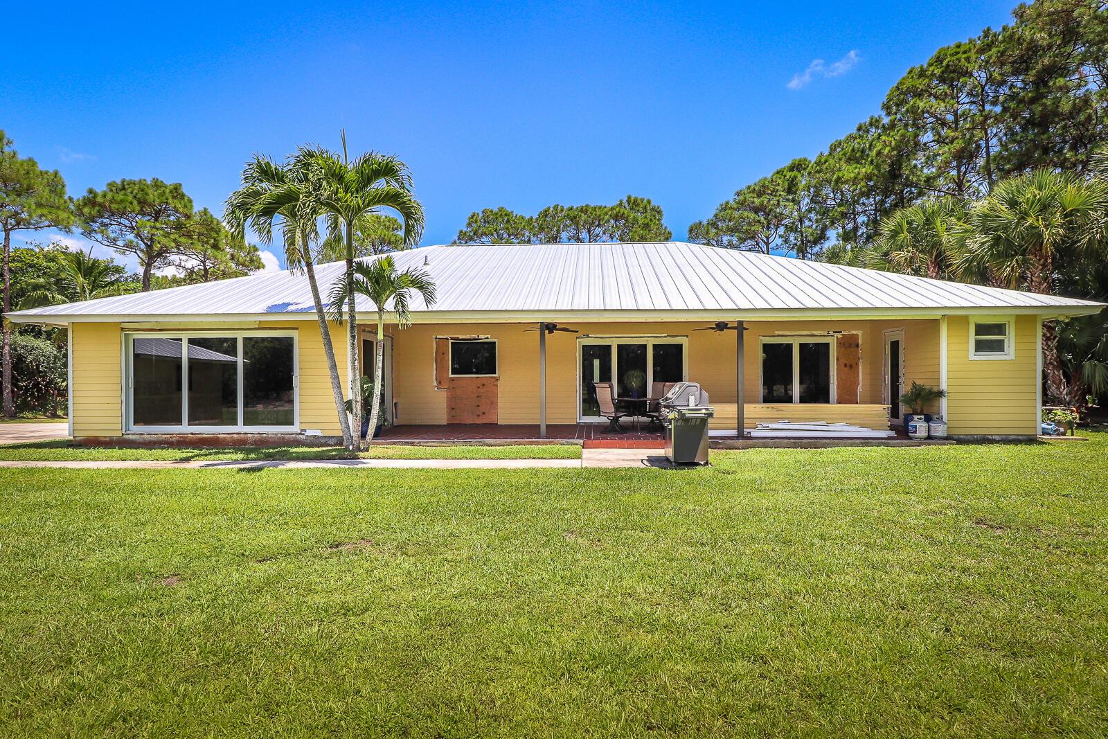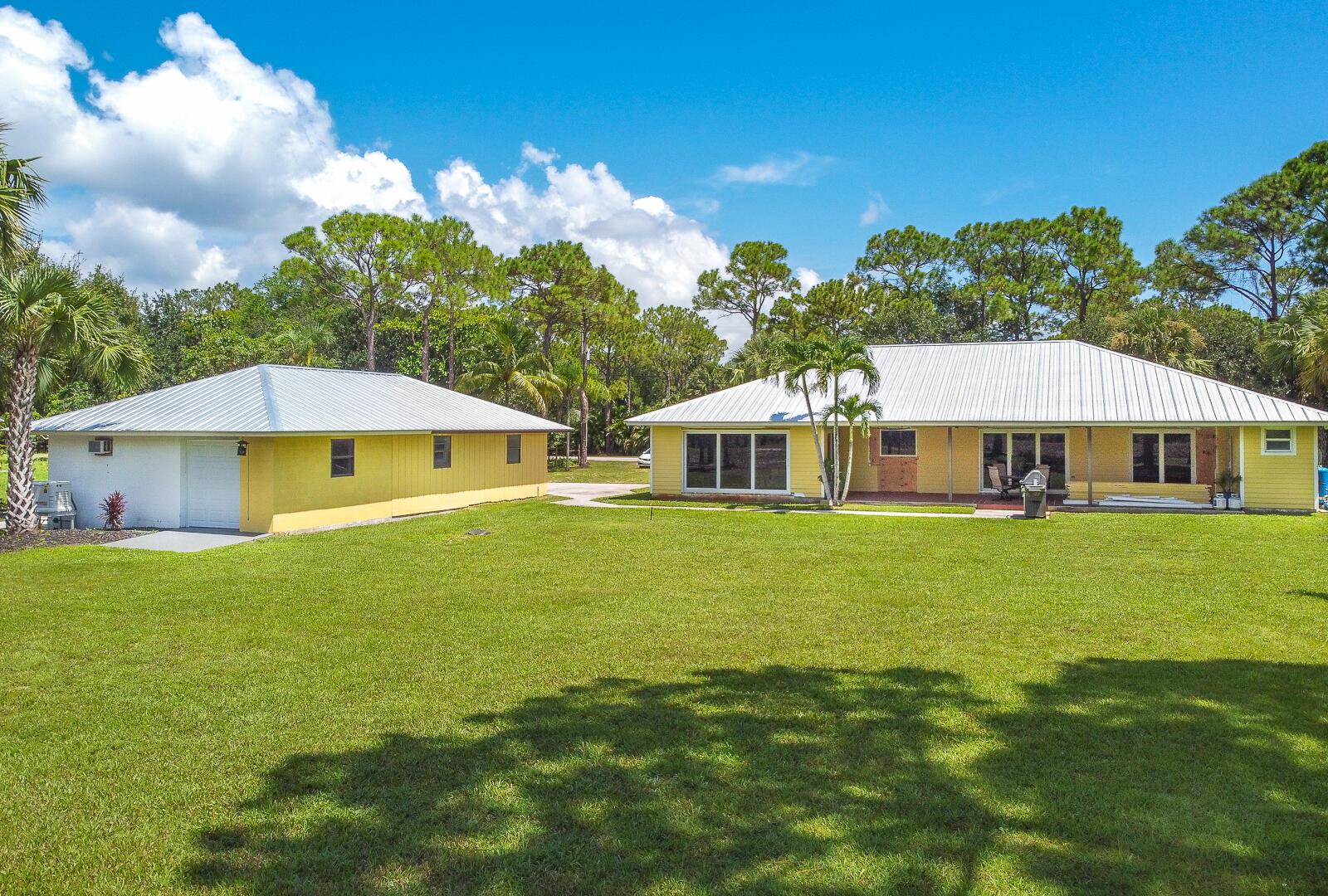 This 4BR/3BA home with a detached 24'x45' garage is the perfect project home - situated on one of the nicest properties in Palm Beach Country Estates: a RARE 1.34-acre lot on a paved road that backs up to a canal and 10,000-acre nature preserve. The interior has been partially gutted down to the studs - ready for new drywall, kitchen, electrical, flooring, etc. Many improvements already installed: NEW metal roof on both house and garage in 2023; NEW 26kW Generac whole-house generator with 1,000 gallon buried propane tank stubbed out for additional future hookups; NEW PGT hurricane impact sliders and cabana door. Two of the three bathrooms are newly-updated.