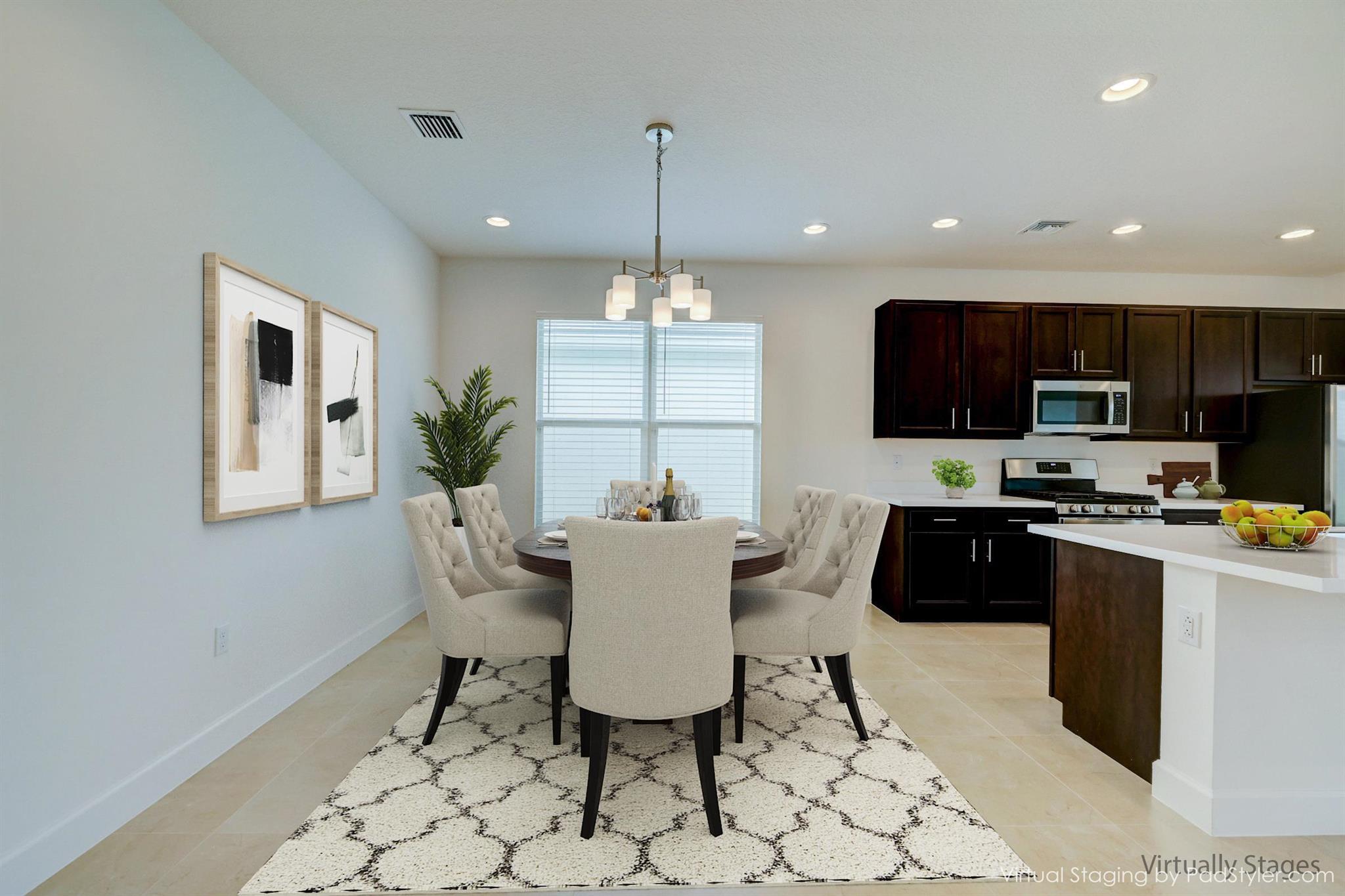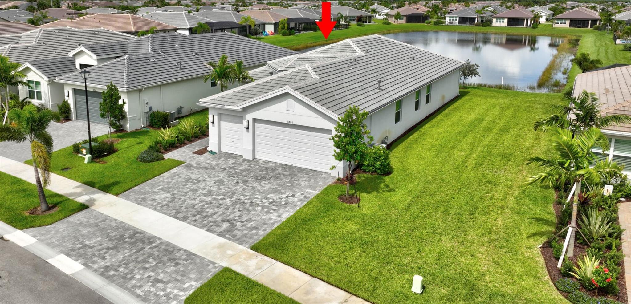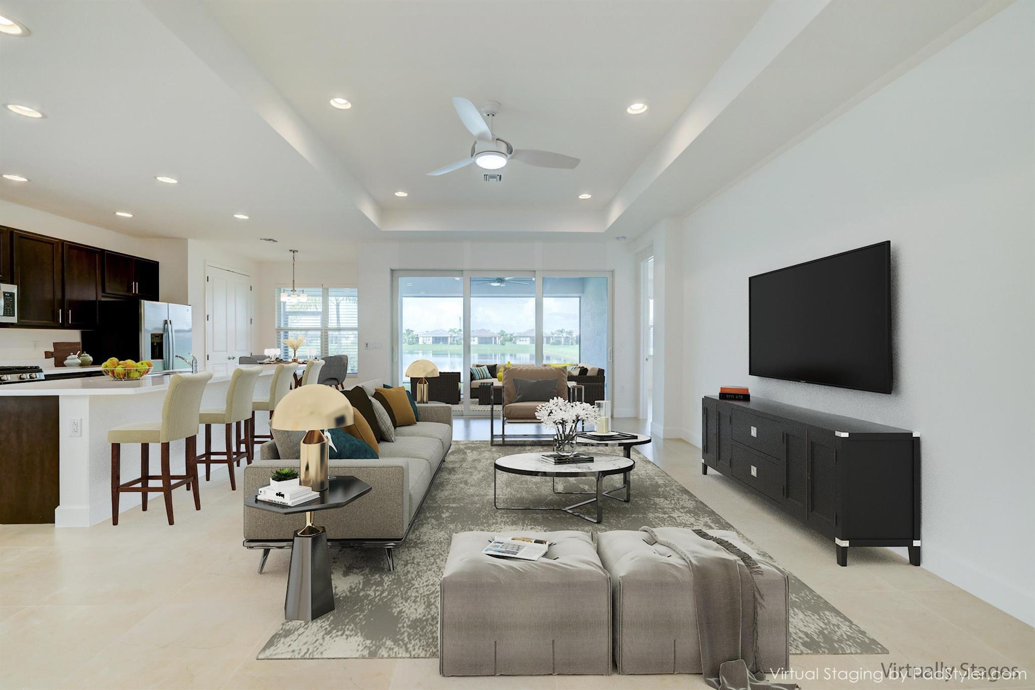 Experience resort-style living in the esteemed Valencia Grove at Riverland, where luxury and comfort are woven into every detail of this exceptional lakefront Palazzo model. Built in 2021 on a coveted oversized lakefront lot, this home invites you to embrace an active 55+ lifestyle in a vibrant, amenity-rich community. Step inside to discover a thoughtfully designed floor plan, offering three spacious bedrooms, two and a half baths, and a versatile den, perfect as a fourth bedroom or home office. Porcelain flooring extends throughout. The heart of the home is the kitchen/dining room and breakfast area, open concept floor plan. Kitchen, with stainless steel appliances, elegant QUARTZ countertops, wood cabinetry, and a generous pantry, making it an entertainer's dream.