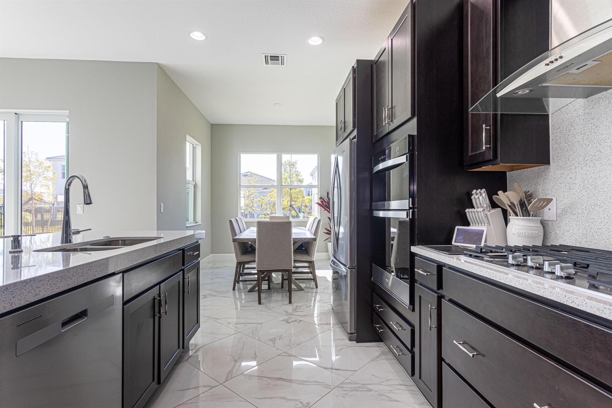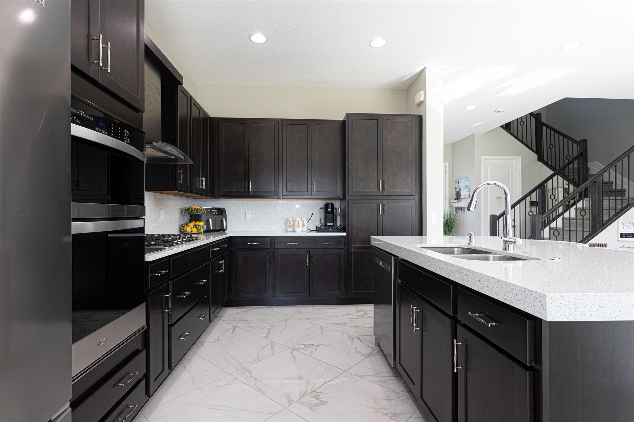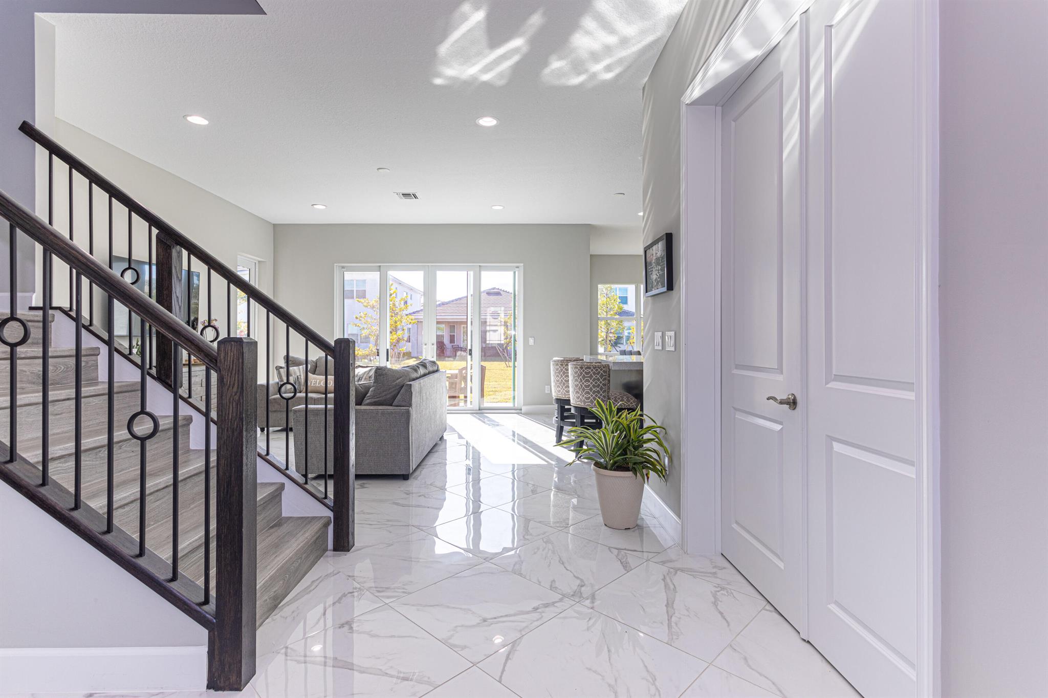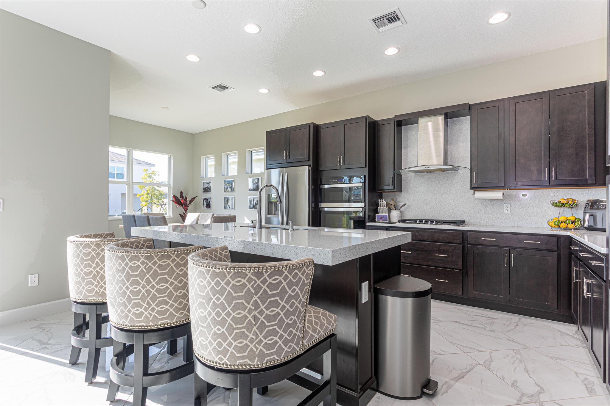 Tons of upgrades on this solid build. Large format porcelain tile throughout 1st floor, Nicely appointed kitchen area with quartz countertops, chefs island, stainless steel appliances, elegant gas cooktop and recess lighting. Formal dining area, Lots of windows and sliding doors provide exceptional lighting in all areas. Large backyard with pool and outdoor activities potential. Laundry room upstairs. Large primary bedroom with tub and separate shower. Community has state of the art pool area that wakes you feel on a resort. Tennis courts, miles and miles of trails. You have to come and see it