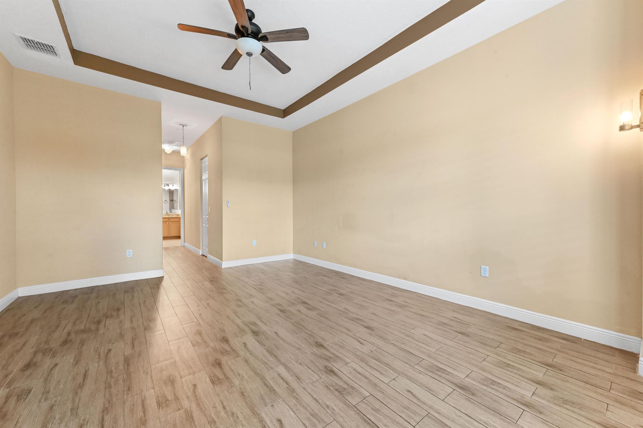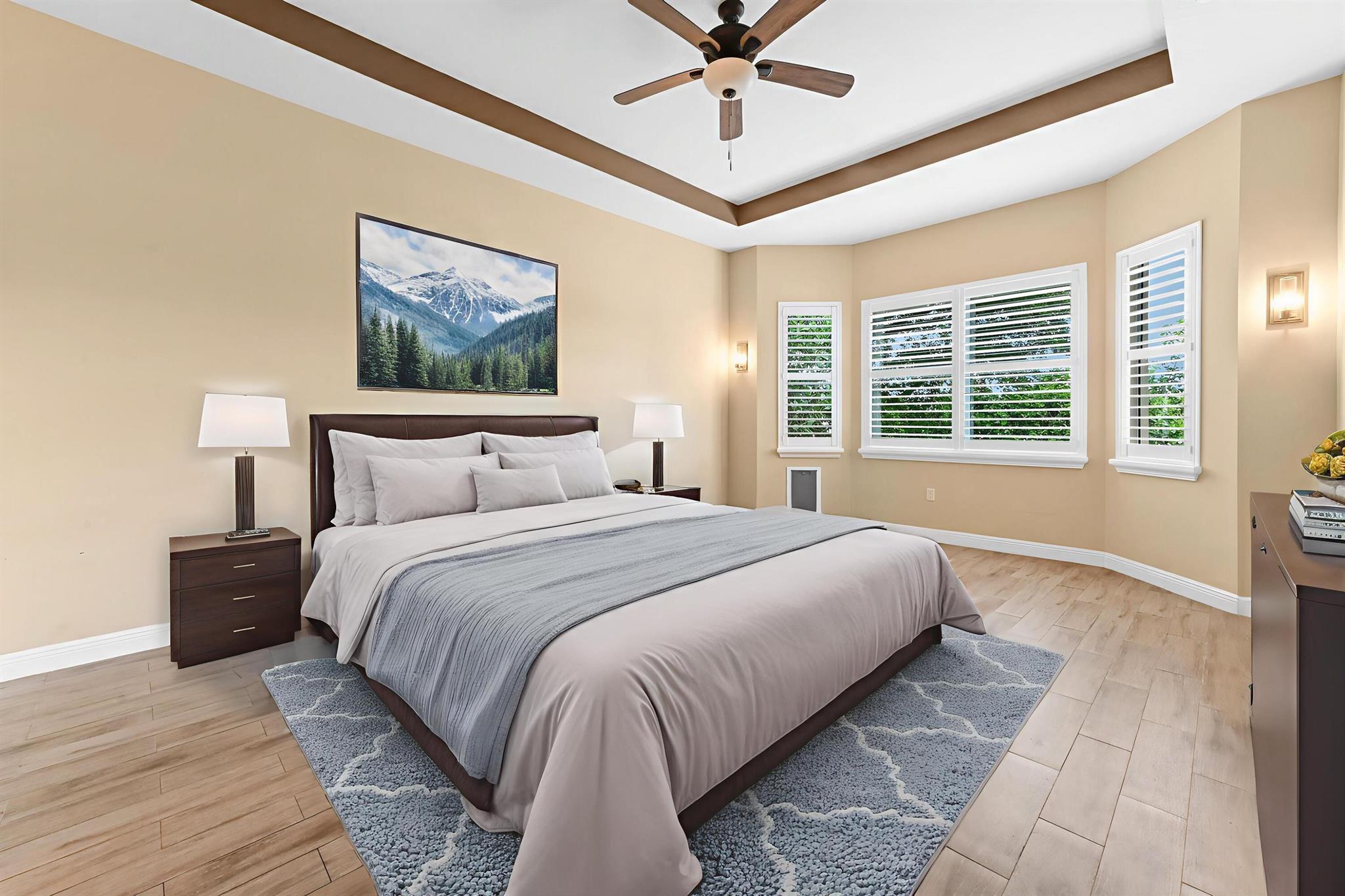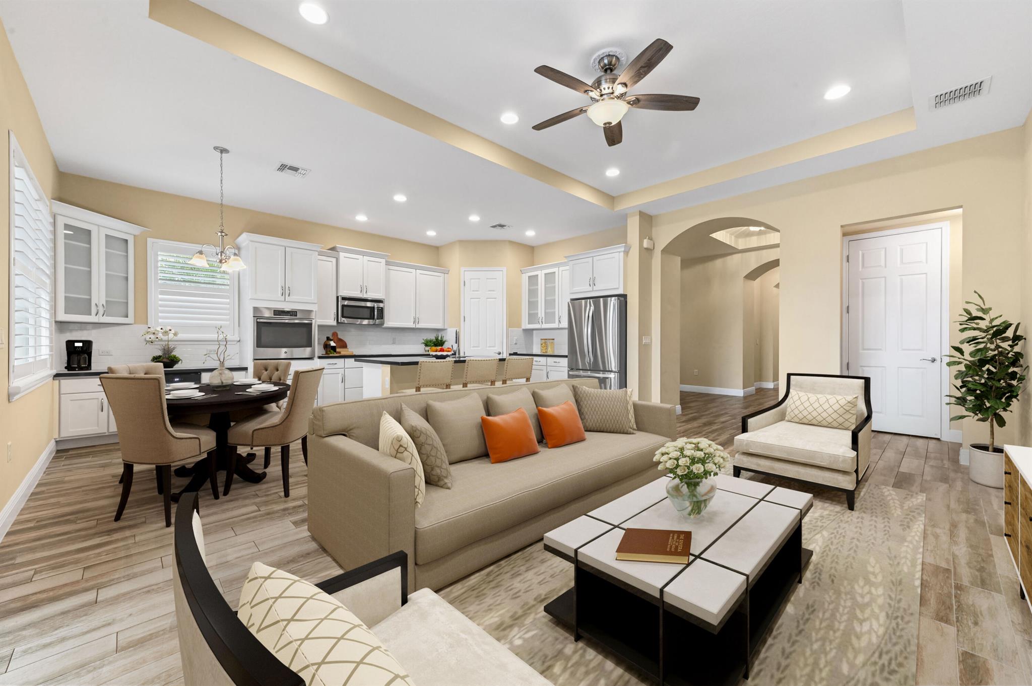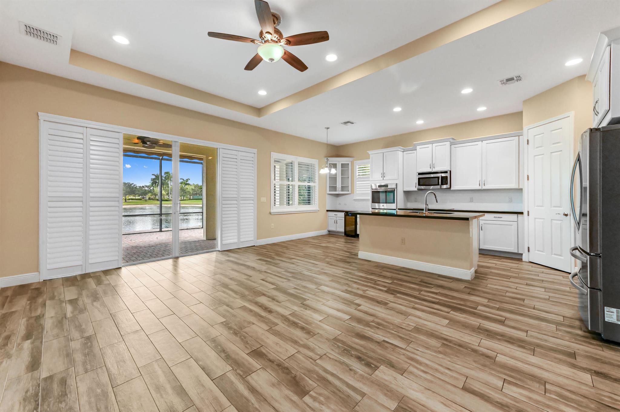 Stunning lakefront gem with a privately fenced yard and oversized screened lanai with picture-perfect water views, boasting 4 beds and 2.5 baths. The home features a massive main bedroom retreat with walk-in closets, formal dining room, and a wide great room that flows into a chef's dream open kitchen. Highlights include an eat-in breakfast nook, black quartz center island, brand new top-of-the-line stainless appliances, triple-door fridge, new induction cooktop paired with a sleek wall oven, temperature-controlled built-in wine storage, complete with white custom cabinetry, and a walk-in pantry. The primary suite is oversized, with an ensuite spa-style bathroom and a huge walk-in shower.