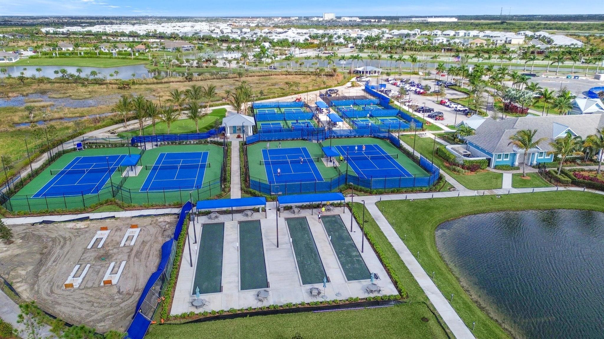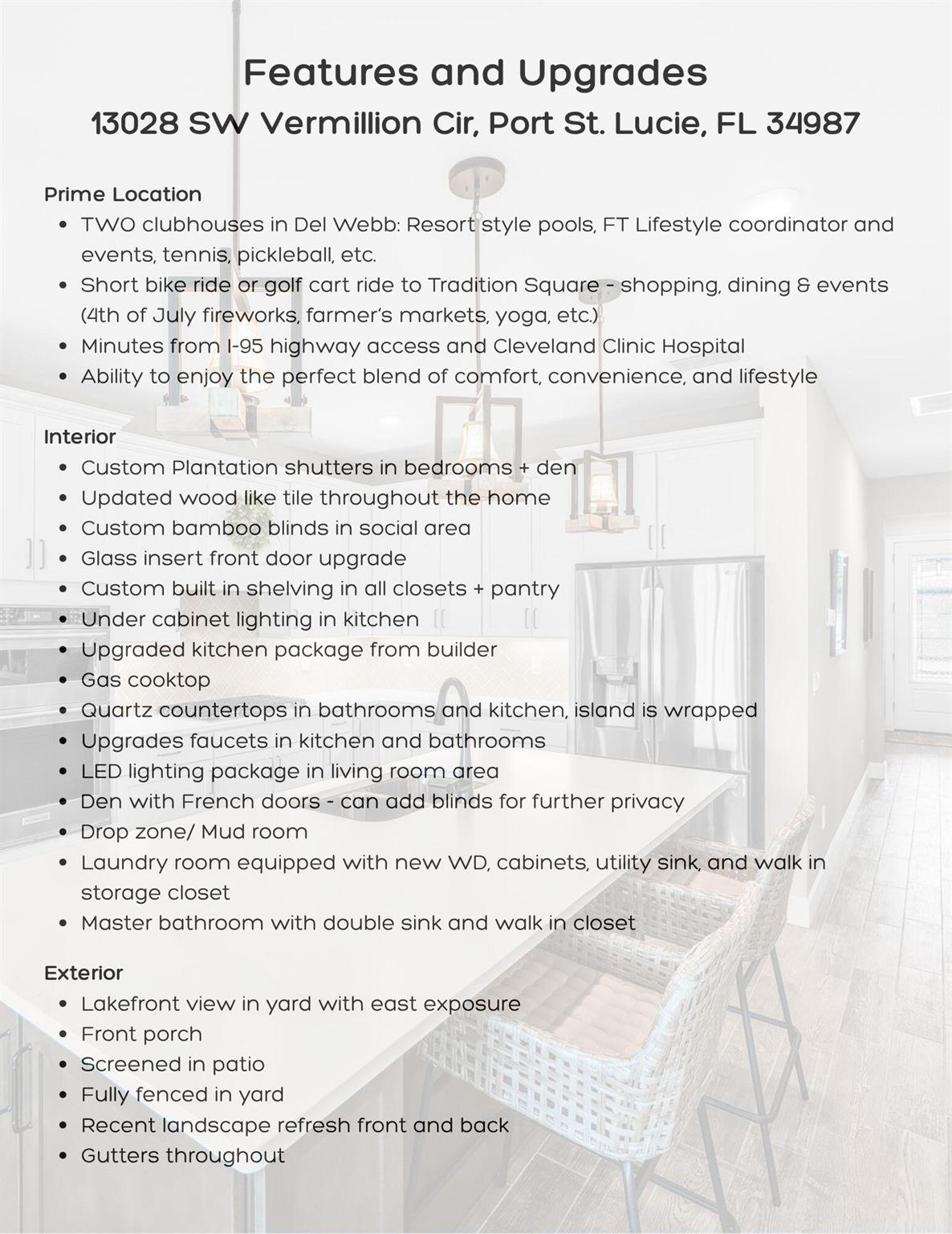 Lakefront Luxury in Del Webb at Tradition! This beautifully appointed 2-bedroom + den, 2-bath home offers peaceful east-facing lake views and a highly upgraded interior designed for comfort and style. Step inside to wood-look tile flooring throughout, quartz countertops, upgraded kitchen package with gas cooktop, and custom closet built-ins. French doors enclose the den, perfect for a home office, media room, or guest overflow. Enjoy custom plantation shutters, bamboo blinds, under-cabinet lighting, LED living room package, and a glass-insert front door for extra charm. The spacious Mud/Laundry room includes new washer/dryer, cabinetry, utility sink, and a walk-in storage closet. Outside, unwind on the screened patio, take in the sunrise over the lake, or enjoy the fully fenced yard!