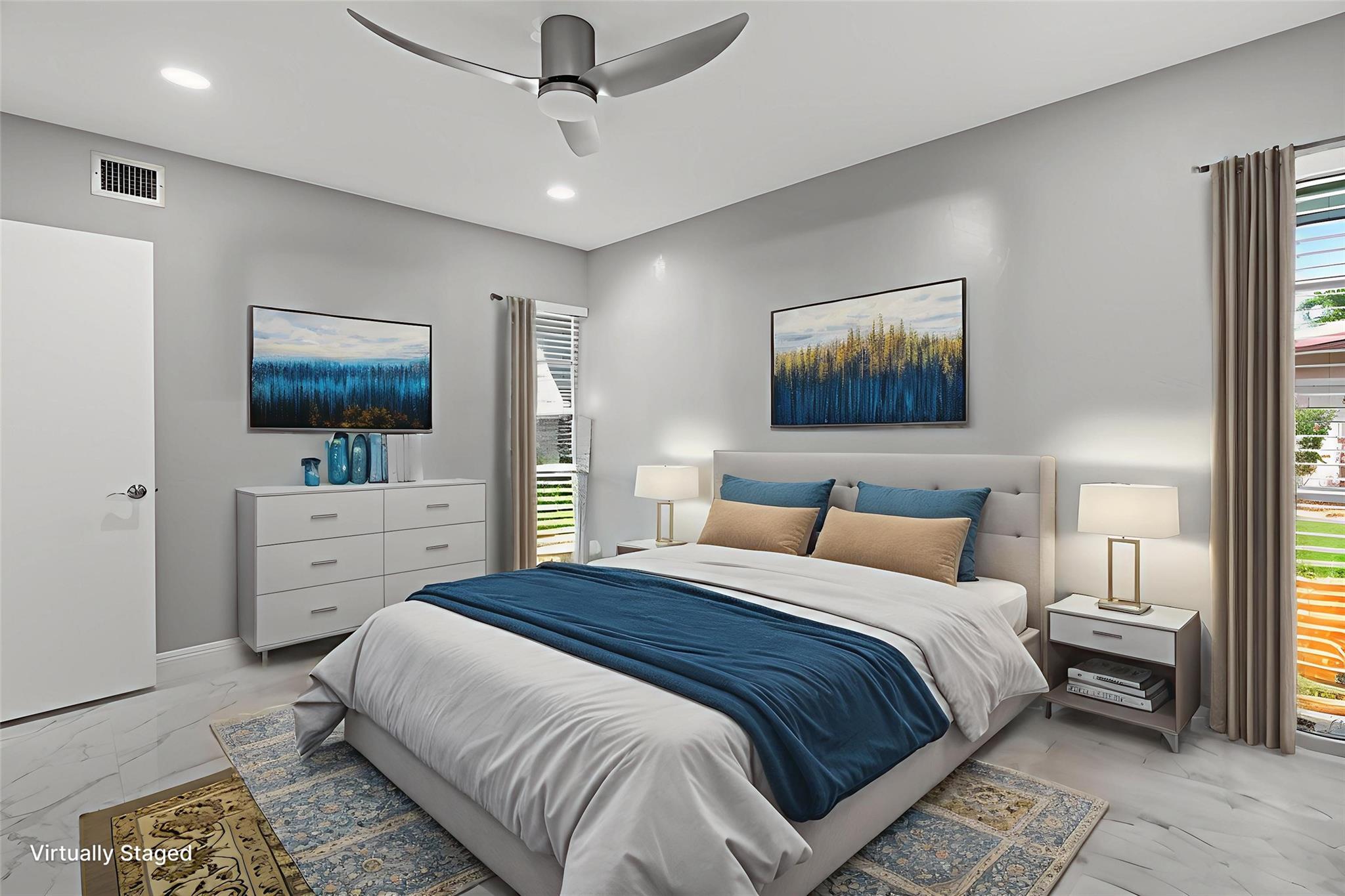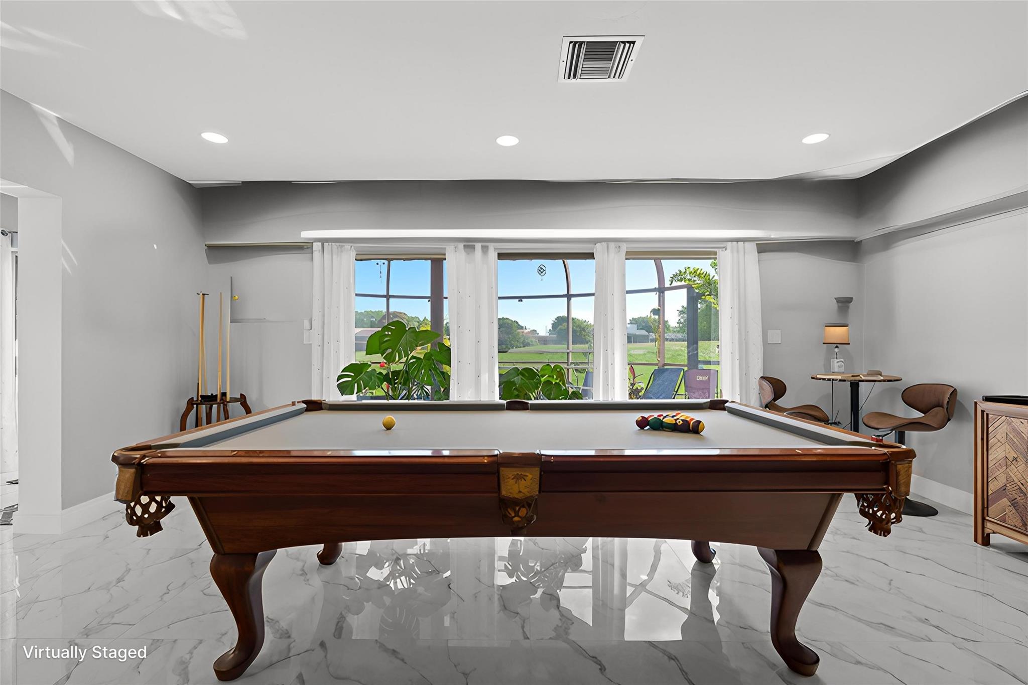 Welcome to your dream home in the prestigious WOODLANDS COMMUNITY! This remodeled 3/2 residence offers over 2,400 sq ft of luxurious living space on a spacious 0.28-acre lot. From the moment you arrive, you'll be captivated by the modern finishes, split floor plan, and rare 4-car garage—perfect for car enthusiasts or extra storage. Step inside to discover gleaming 24x24 MARBLE TILE FLOORS, WHITE SHAKER CABINETRY, and QUARTZ COUNTERTOPS throughout. The CHEF'S KITCHEN features stainless steel appliances and a breakfast nook. The expansive great room flows seamlessly into a game room and formal dining area, creating a versatile space for gatherings. Enjoy peace of mind with a 2019 ROOF, updated electric, Wi-Fi smart home setup and 2 zone a/c. The screened lanai offers a tranquil retreat.
