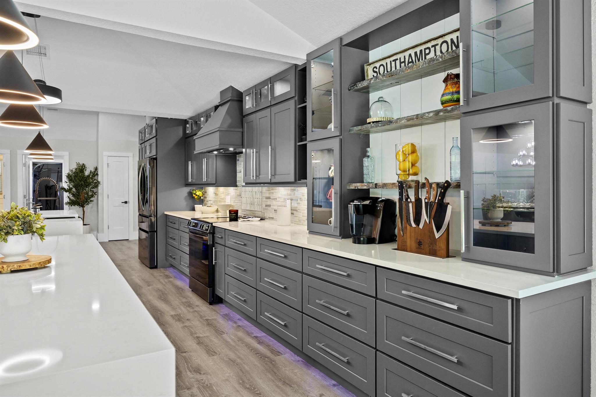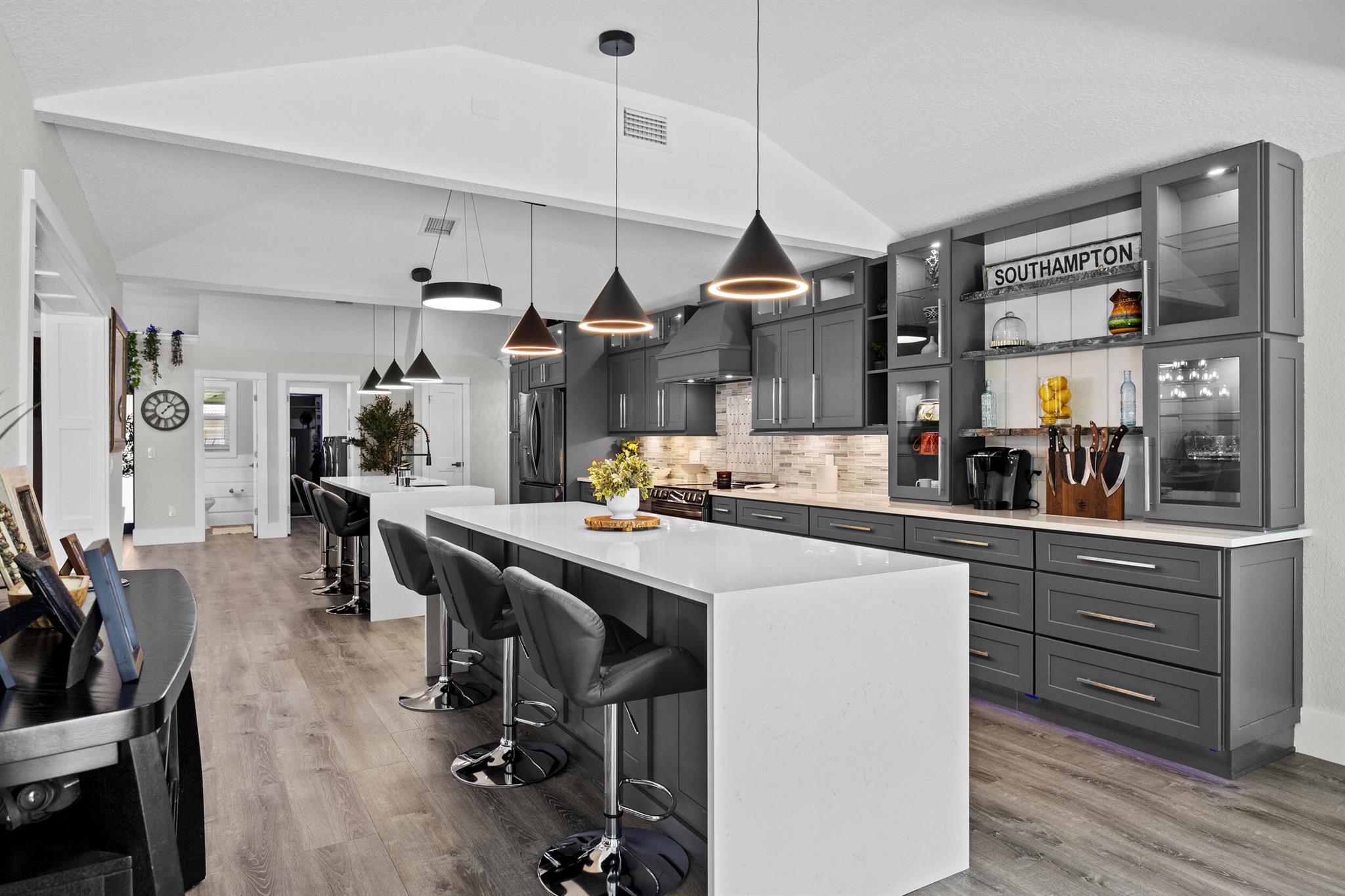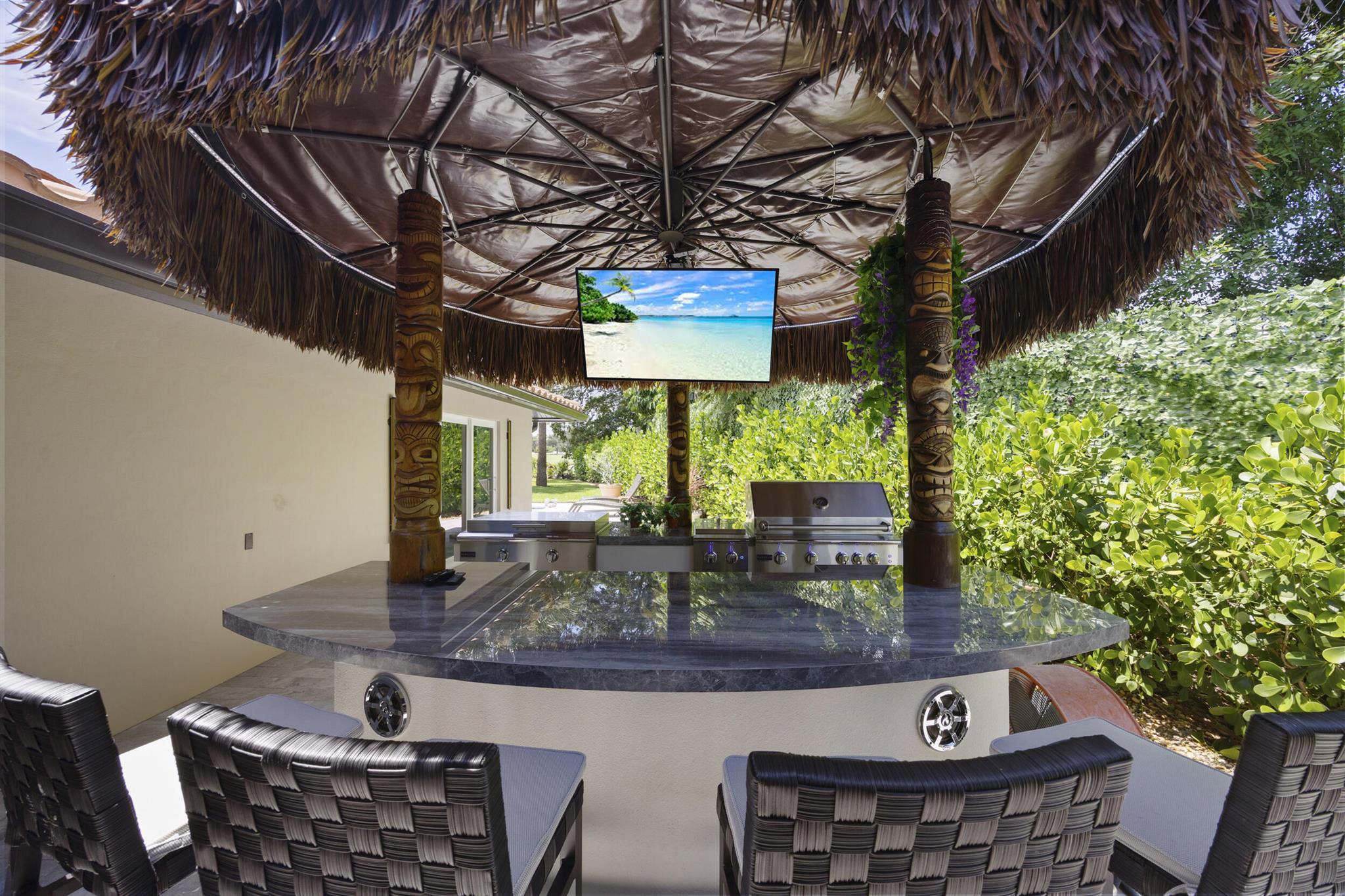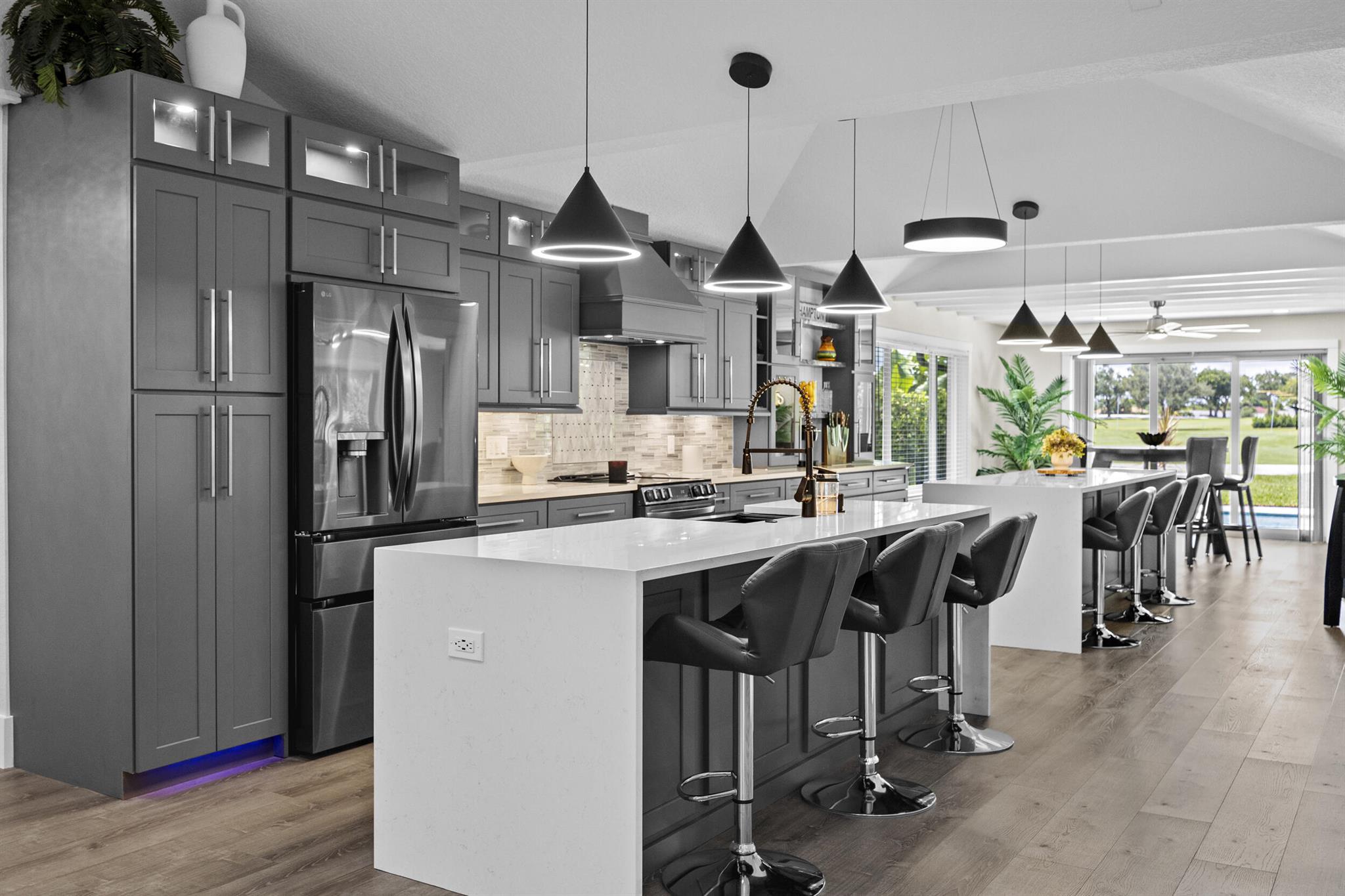 Luxury living at its finest! Completely renovated 3-bedroom, 2.5-bath home Enjoy expansive golf course views that stretch across the fairway, all while preserving your privacy and seclusion. This stunning residence features shaker cabinets, two expansive kitchen islands with quartz waterfall edges, and brand-new high-end appliances. Enjoy year-round comfort with two new A/C units and elegant hi-end laminate flooring throughout. Entertain effortlessly with a built-in bar, extensive new landscaping, and an outdoor tiki hut equipped with a grill, griddle, refrig. and wine cooler. Plus, a BRAND-NEW POOL with a sun shelf, perfect for soaking up the Florida sunshine! For energy efficiency and storm protection, this home features impact windows and doors all around. Membership not required.