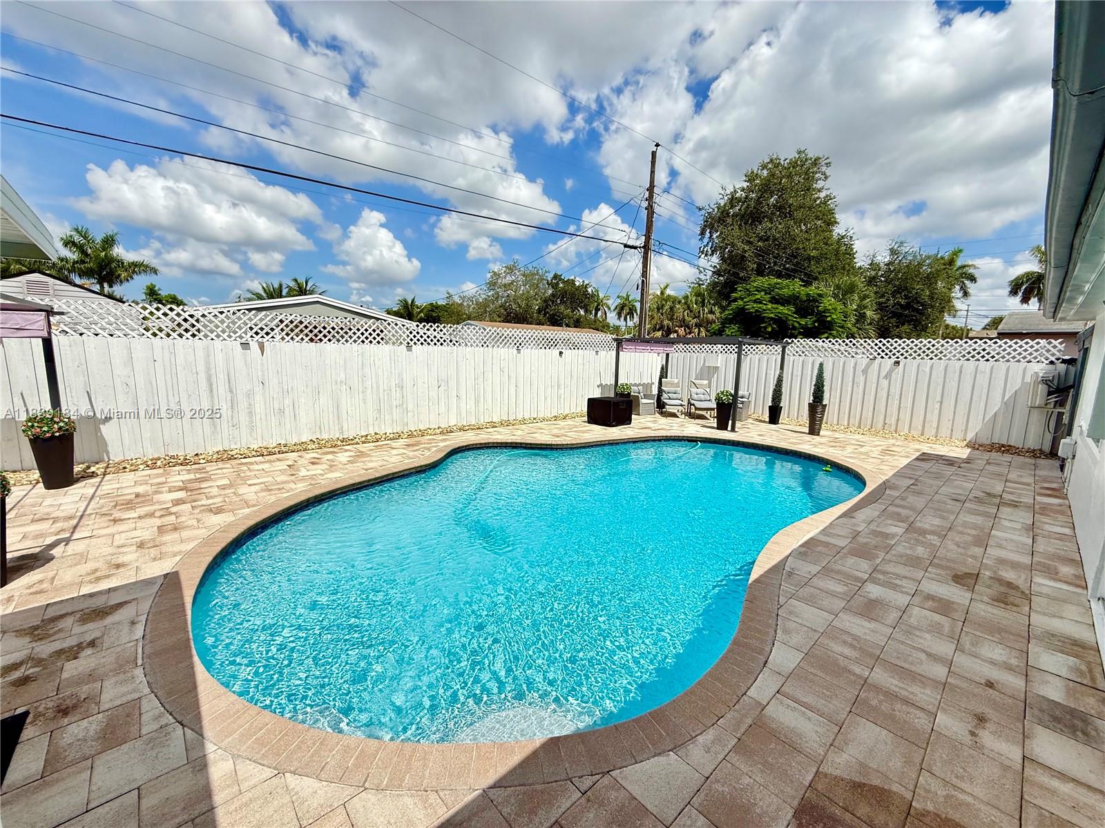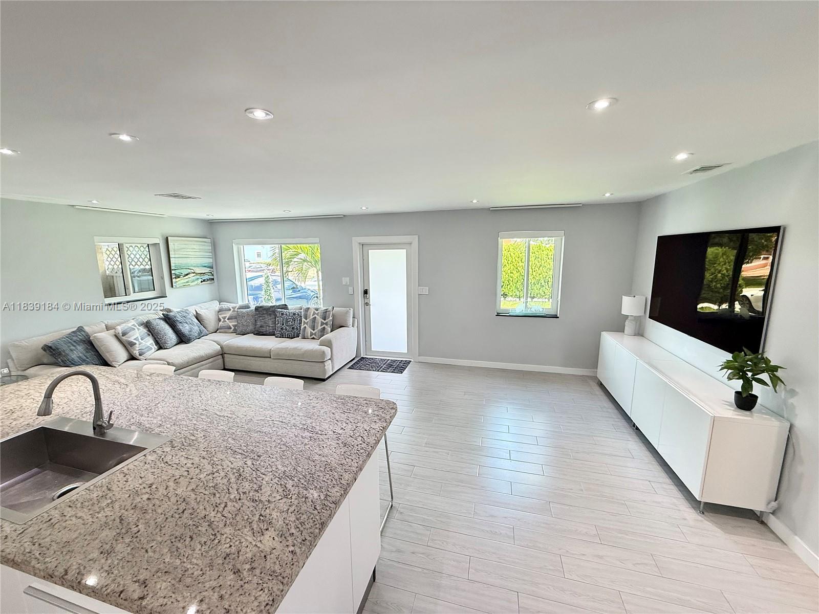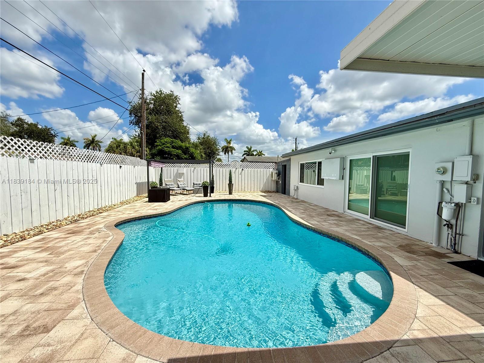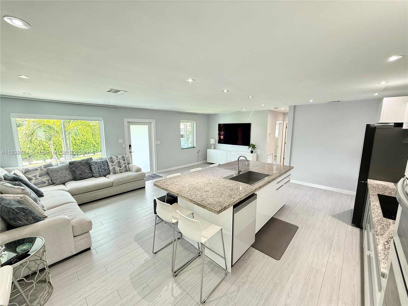 This luxuriously stunning one-story residence has been fully remodeled top to bottom with no expense spared. Features include a newer roof, brand-new flooring, modern tankless water heater, and impact windows and doors. The showstopping open kitchen offers a massive striking stone island, sleek cabinetry, and elite state-of-the-art appliances. Bedrooms include custom built-in closets, and the spa-inspired bathrooms feel like a five-star retreat, complete with jetted tub, frameless showers, TVs, and modern vanities. Freshly painted inside and out with a new, upgraded A/C system. Step outside to a private reimagined backyard oasis with a resurfaced pool, new elegant stone deck, and resort pergolas. Elite modern design and finishes throughout, luxury living at its finest—truly move-in ready!