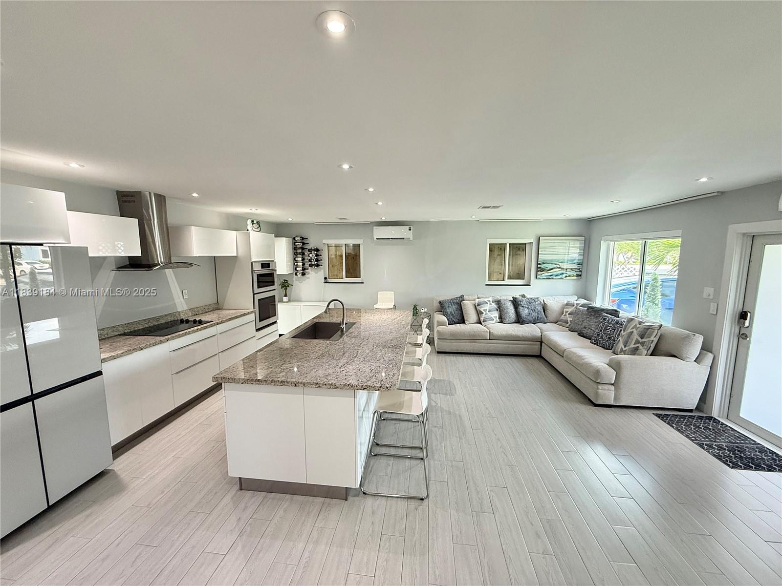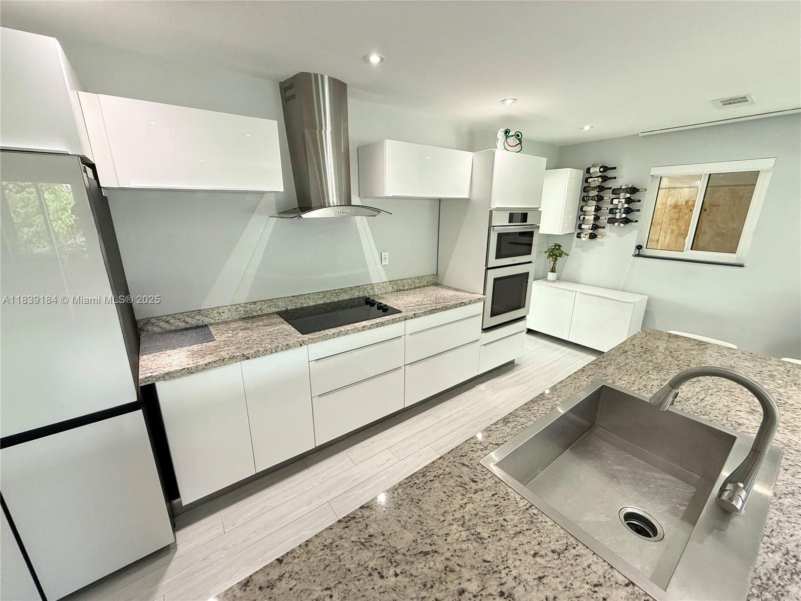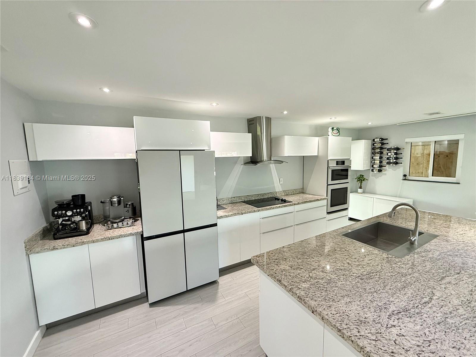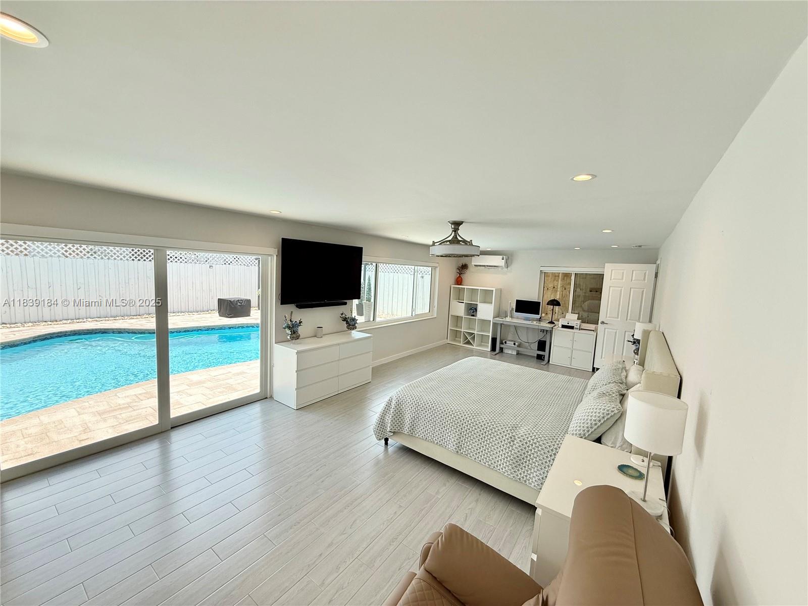 This luxuriously stunning one-story residence has been fully remodeled top to bottom with no expense spared. Features include a newer roof, brand-new flooring, modern tankless water heater, and impact windows and doors. The showstopping open kitchen offers a massive striking stone island, sleek cabinetry, and elite state-of-the-art appliances. Bedrooms include custom built-in closets, and the spa-inspired bathrooms feel like a five-star retreat, complete with jetted tub, frameless showers, TVs, and modern vanities. Freshly painted inside and out with a new, upgraded A/C system. Step outside to a private reimagined backyard oasis with a resurfaced pool, new elegant stone deck, and resort pergolas. Elite modern design and finishes throughout, luxury living at its finest—truly move-in ready!