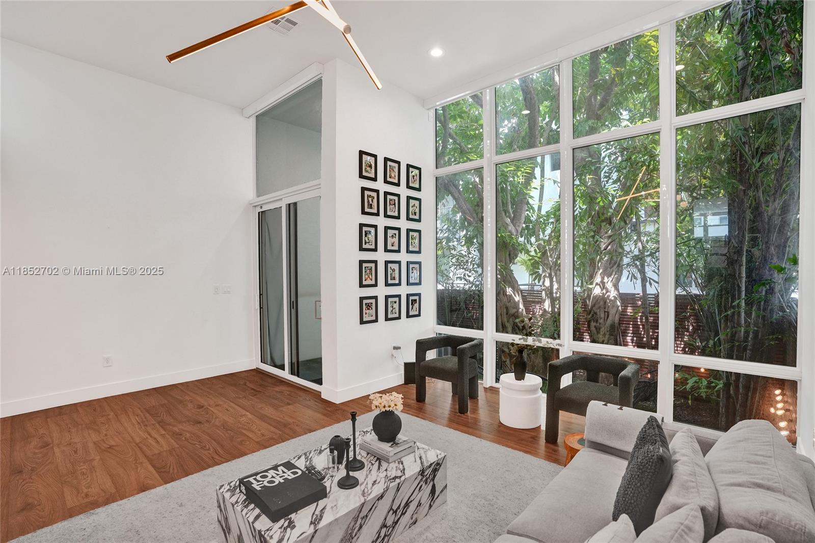 Beautifully updated tri-level townhouse in The Habitat, an exclusive 5-unit boutique community tucked away on a quiet, gated cul-de-sac. Soaring vaulted ceilings and floor-to-ceiling impact windows fill the open-concept living space with natural light. Enjoy seamless indoor-outdoor living with a private garden courtyard, spacious entertaining terrace, and access to a shared community pool. Features include a 2-car garage with tesla charger, updated interiors, and hurricane-impact windows throughout.