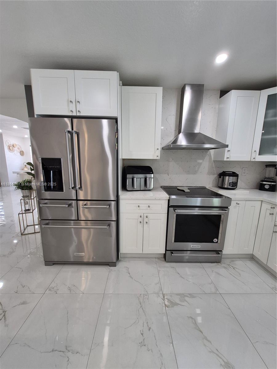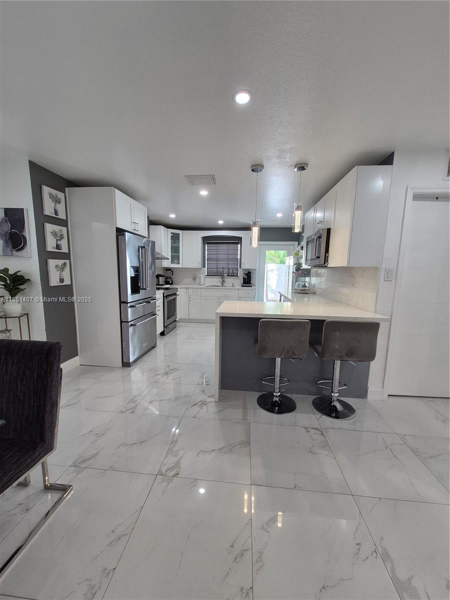 Your Dream Home Awaits! Stunning 3-Bedroom Gem with Modern Touches This single-family home has everything you've been dreaming of! Gorgeous kitchen. Quartz rainfall countertop, chic glass cabinet doors, stainless steel appliances, glass counter stove, wine cooler that'll make your dinner parties legendary. Pendant lights over your dinning room and kitchen counter. Luxury bathrooms. The master suite bathroom has a dreamy jacuzzi tub, double vanity. The second bathroom rocks a floating vanity and a rainfall shower. This home has solar panels, a brand new AC. The backyard is perfect BBQs, surrounded by tropical bottle palm trees. Private fenced-in. LED lighting, Stunning stone fireplace,24 x24 porcelain tile. Brick paver back yard Zebra window blinds and more.