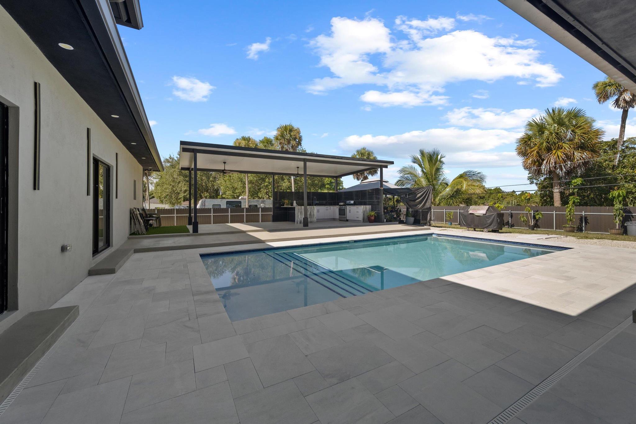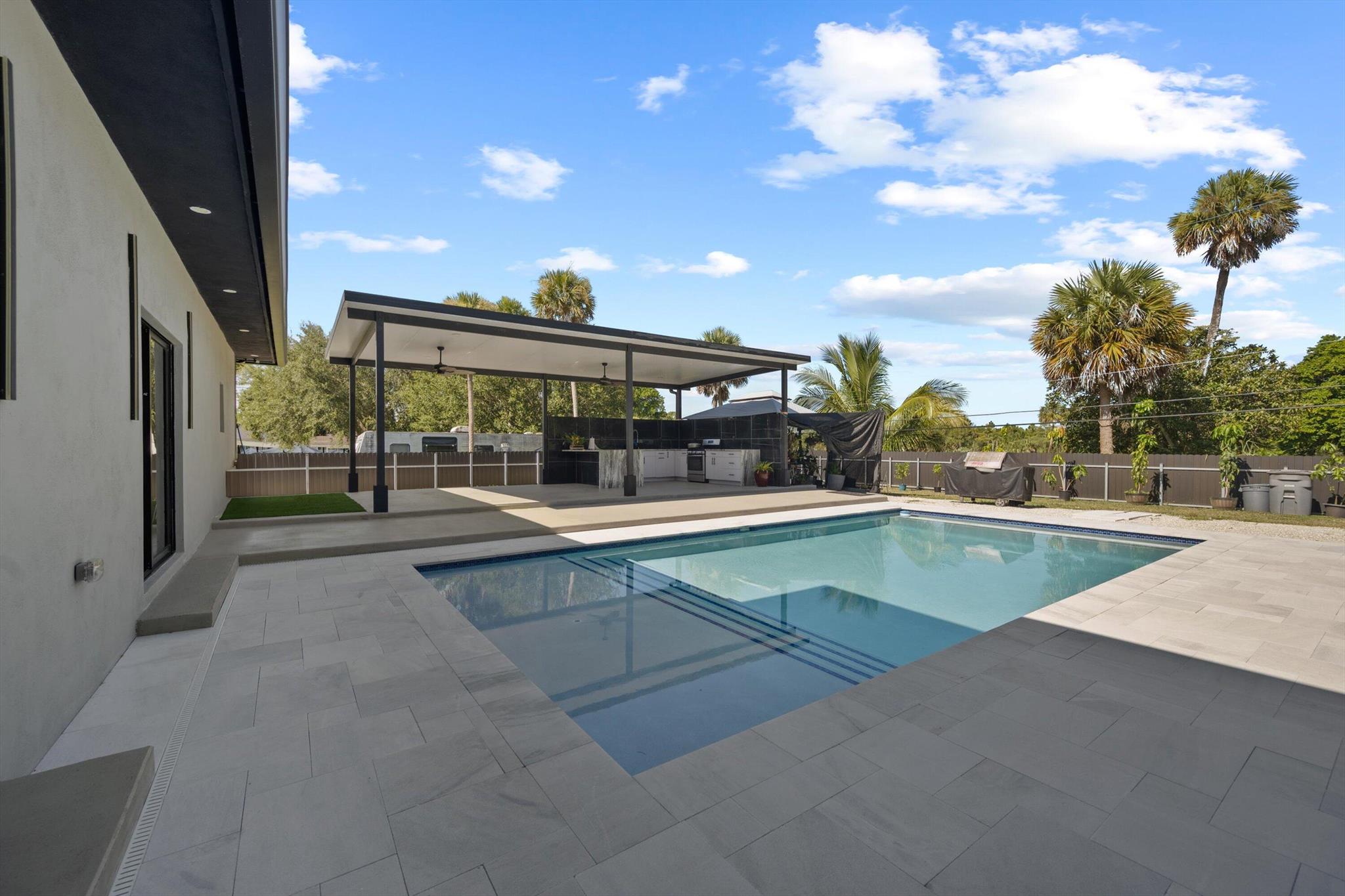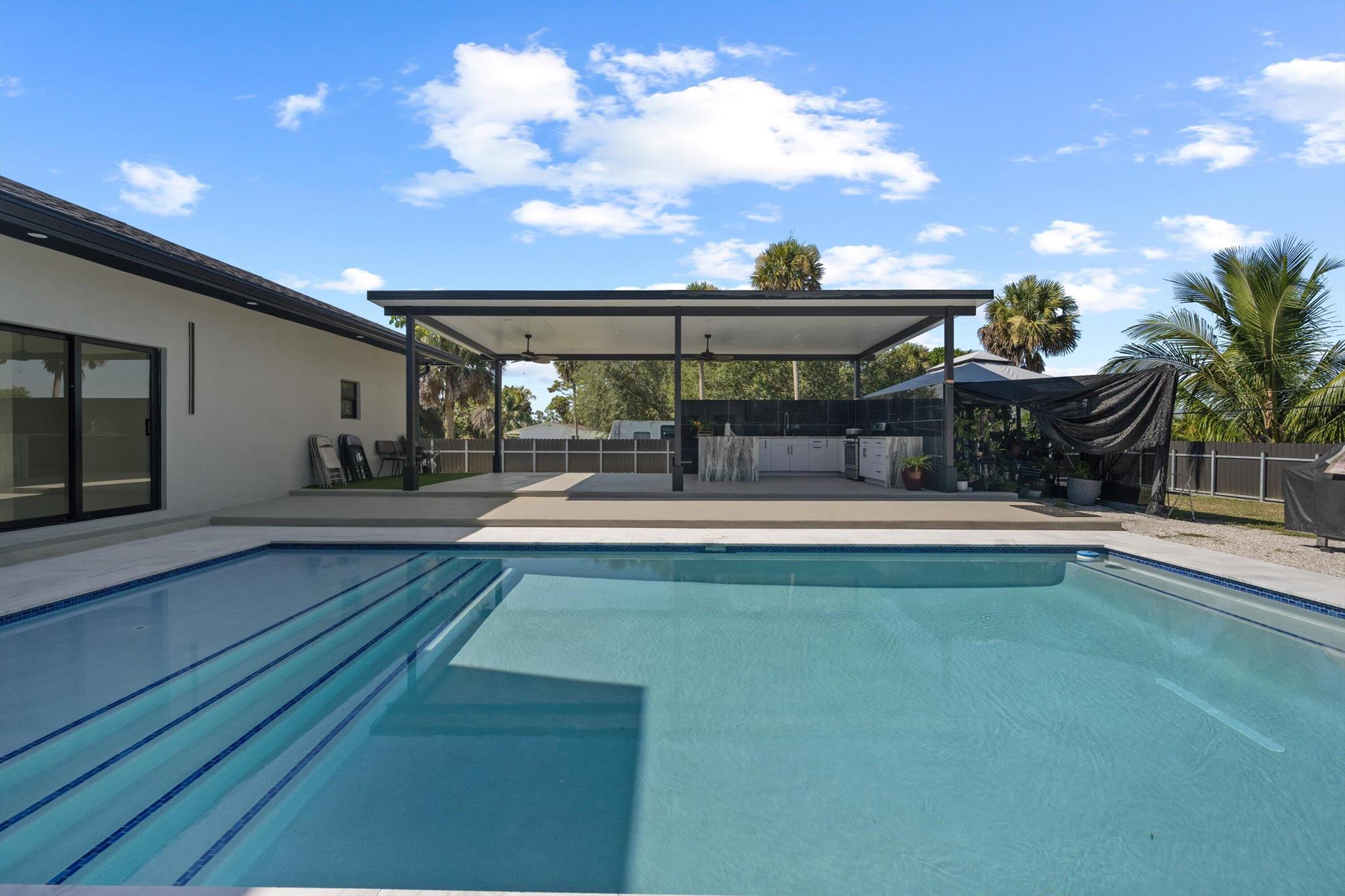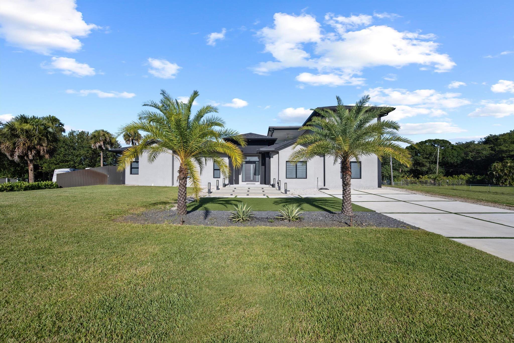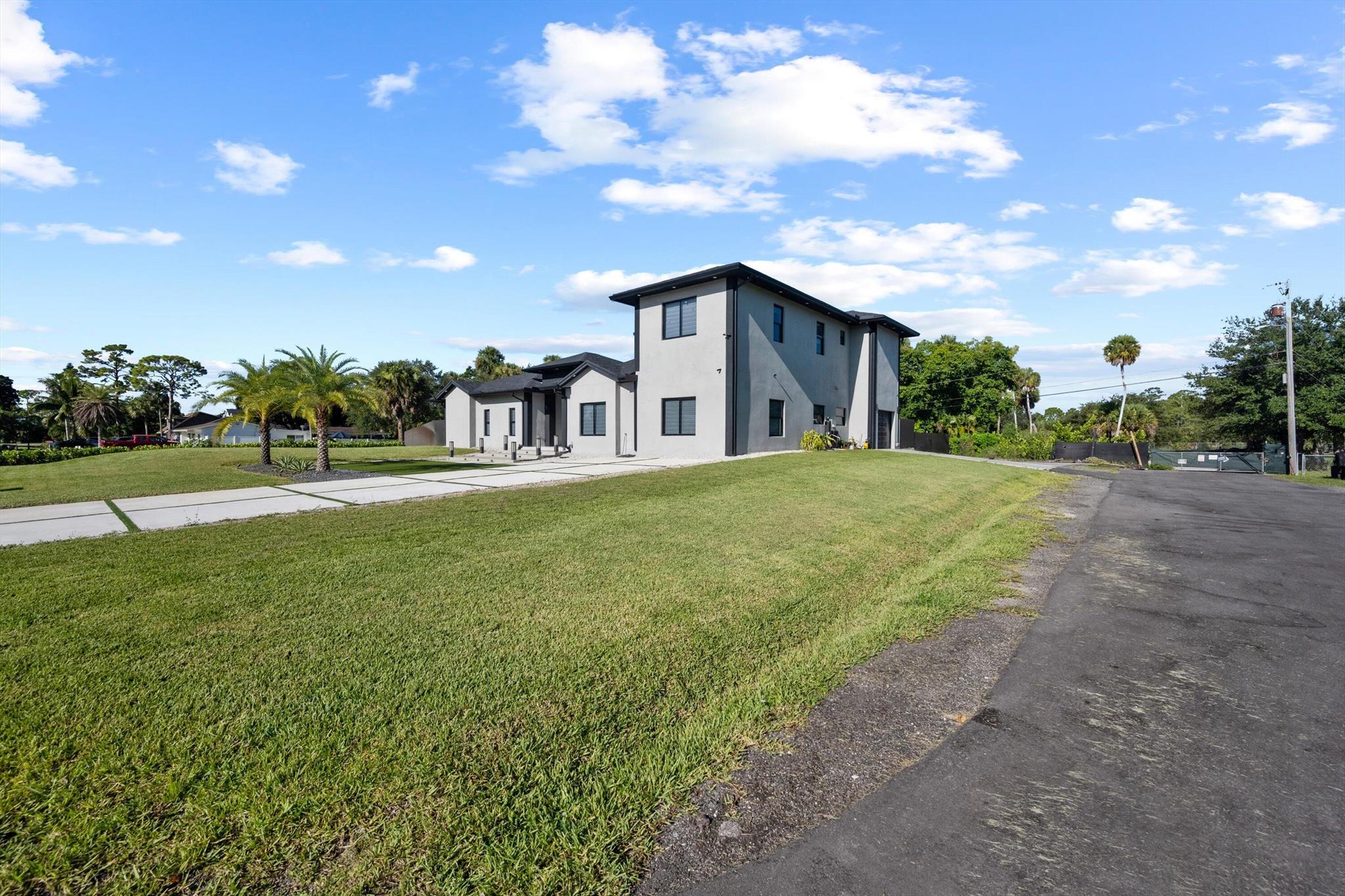 Experience modern living in this newly constructed, stunning 2-story estate in Palm Beach Farms. Set on a generous 0.61-acre lot, this home offers 4 spacious bedrooms, 3 luxurious bathrooms, a dedicated office upstairs, and a 1-car garage. Paved access roads provide added convenience, while the main-floor primary suite is perfectly designed for today's lifestyle. Impact windows and a full security system add comfort and functionality. A large balcony overlooks the lush grounds and pool, offering a peaceful retreat. Enjoy resort-style living in your private backyard oasis, complete with an oversized pool and a pavilion with a full summer kitchen--ideal for entertaining.