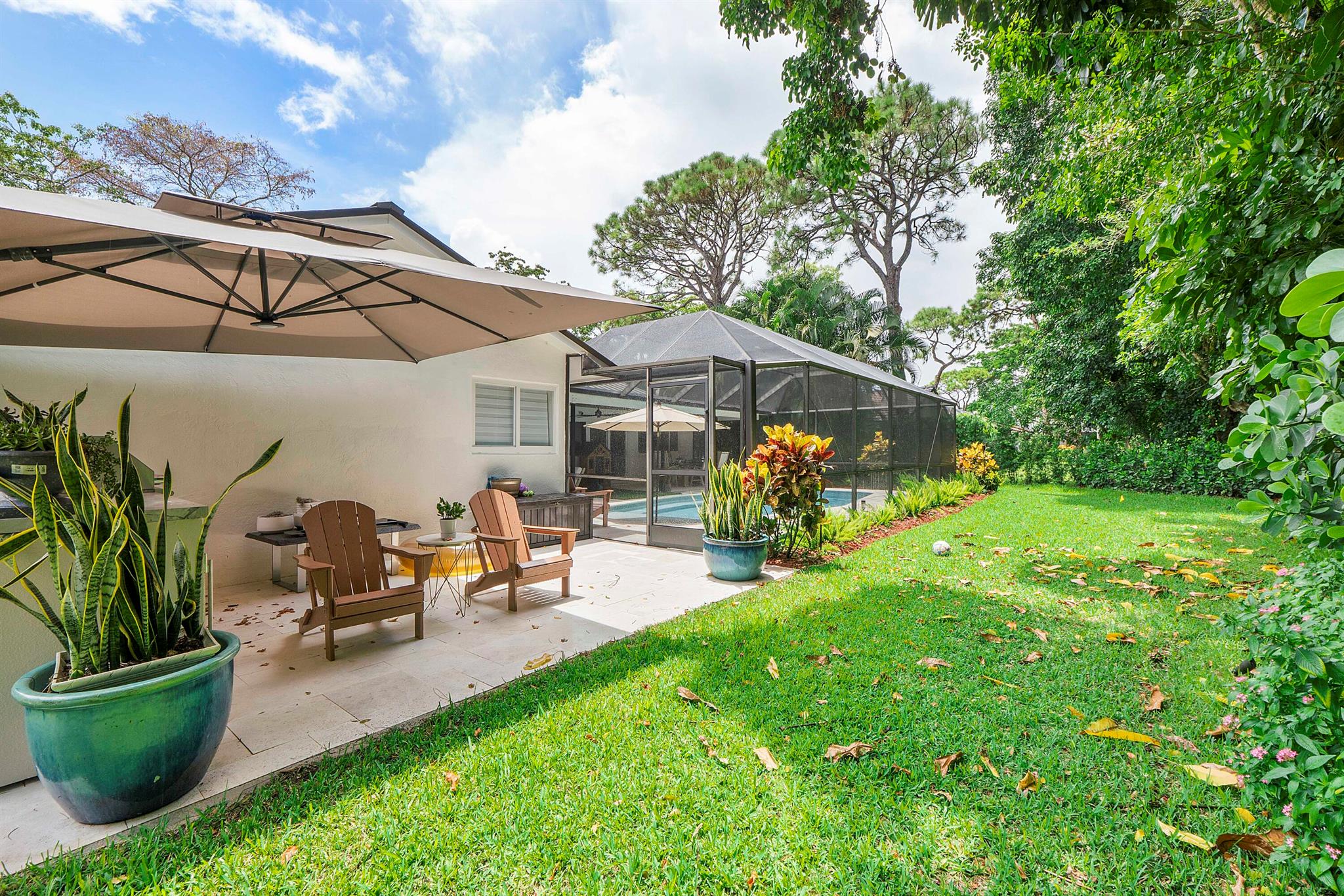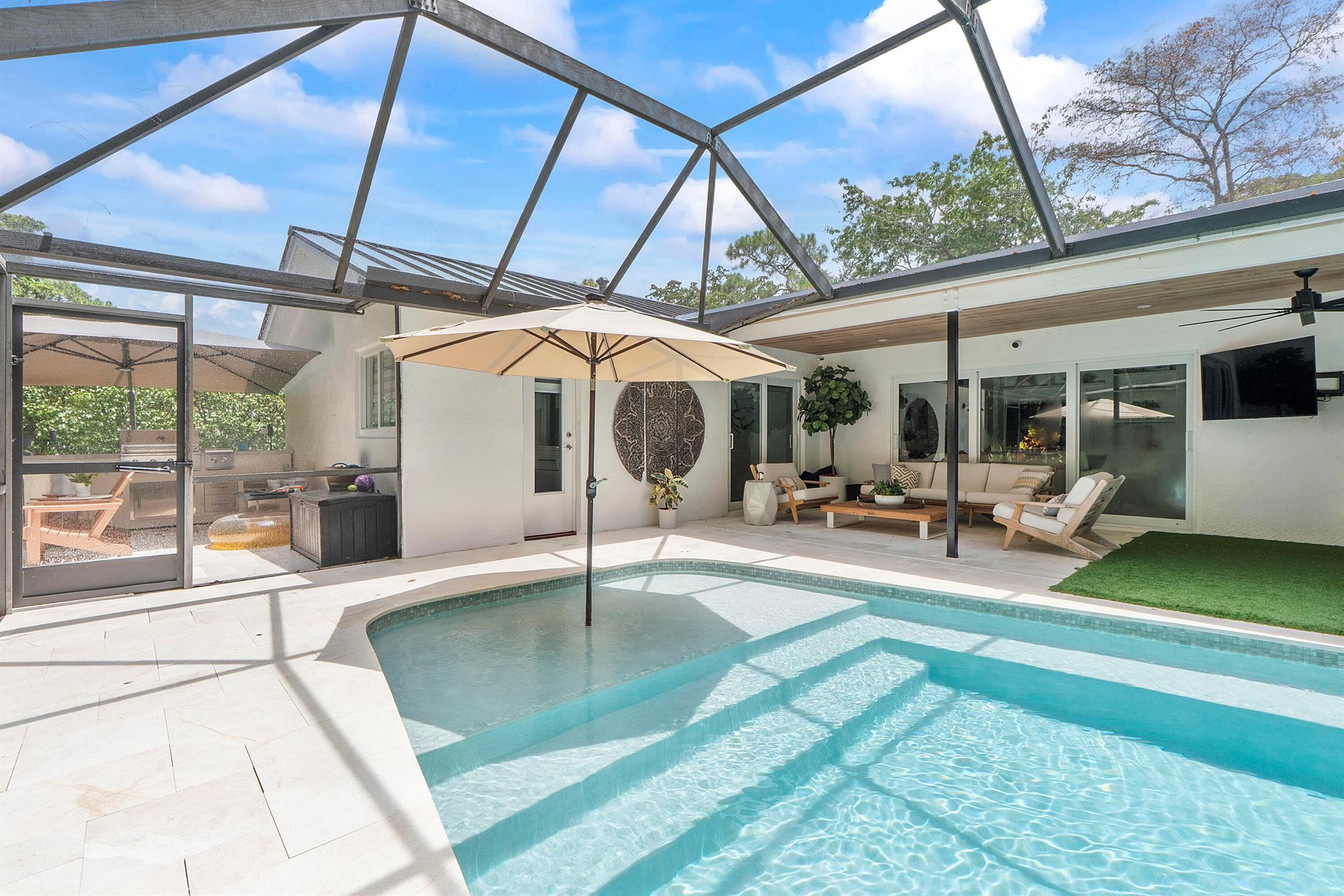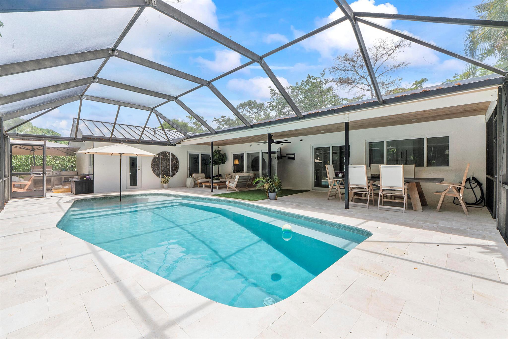 Leave daydreams behind and embrace a serene, tranquil lifestyle in your own private, oasis nestled within the prestigious tree-lined streets of Boca Raton's most picturesque neighborhoods, Millpond. Tucked away on a quiet cul-de-sac street, this fully renovated 4-bedroom, 2.5 bath home spans 2,370 sq. ft. and is perfectly positioned to capture sweeping views of the new sparkling saltwater pool with summer kitchen nestled against lush landscaping and a private community park.The 2025 metal roof is not just a bold design feature, but offers a 50-year lifespan, superior energy efficiency and the best insurance rates. Full-impact windows and doors provide added safety and storm protection, giving you lasting peace of mind.
