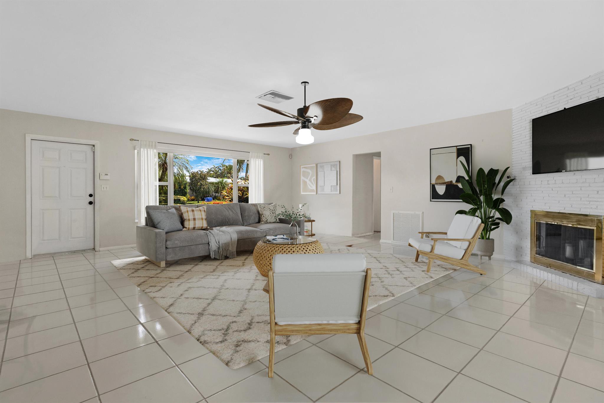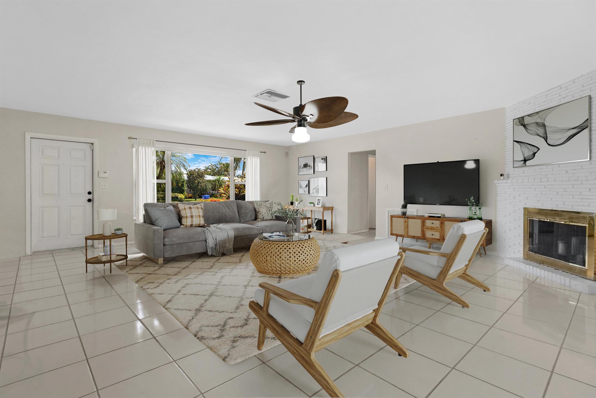 Live where others vacation in this primely located 2-bedroom, 2-bathroom home. EAST of Federal Highway and just half a mile from beautiful Pompano Beach! Inside, you'll find an airy open-concept floorplan that connects the living, dining, and kitchen--perfect for both entertaining and everyday living. The sun drenched Florida room offers peaceful views of the private pool, while a cozy fireplace adds unbeatable charm. Neutral tile flooring throughout, and elegant pendant lighting over the snack bar. The primary bedroom boasts custom closet built-ins and an en suite bath, while the second bedroom provides generous space and comfort. A sleek side-by-side washer and dryer are conveniently located in the garage. The lushly landscaped lot and circular driveway add practicality and...