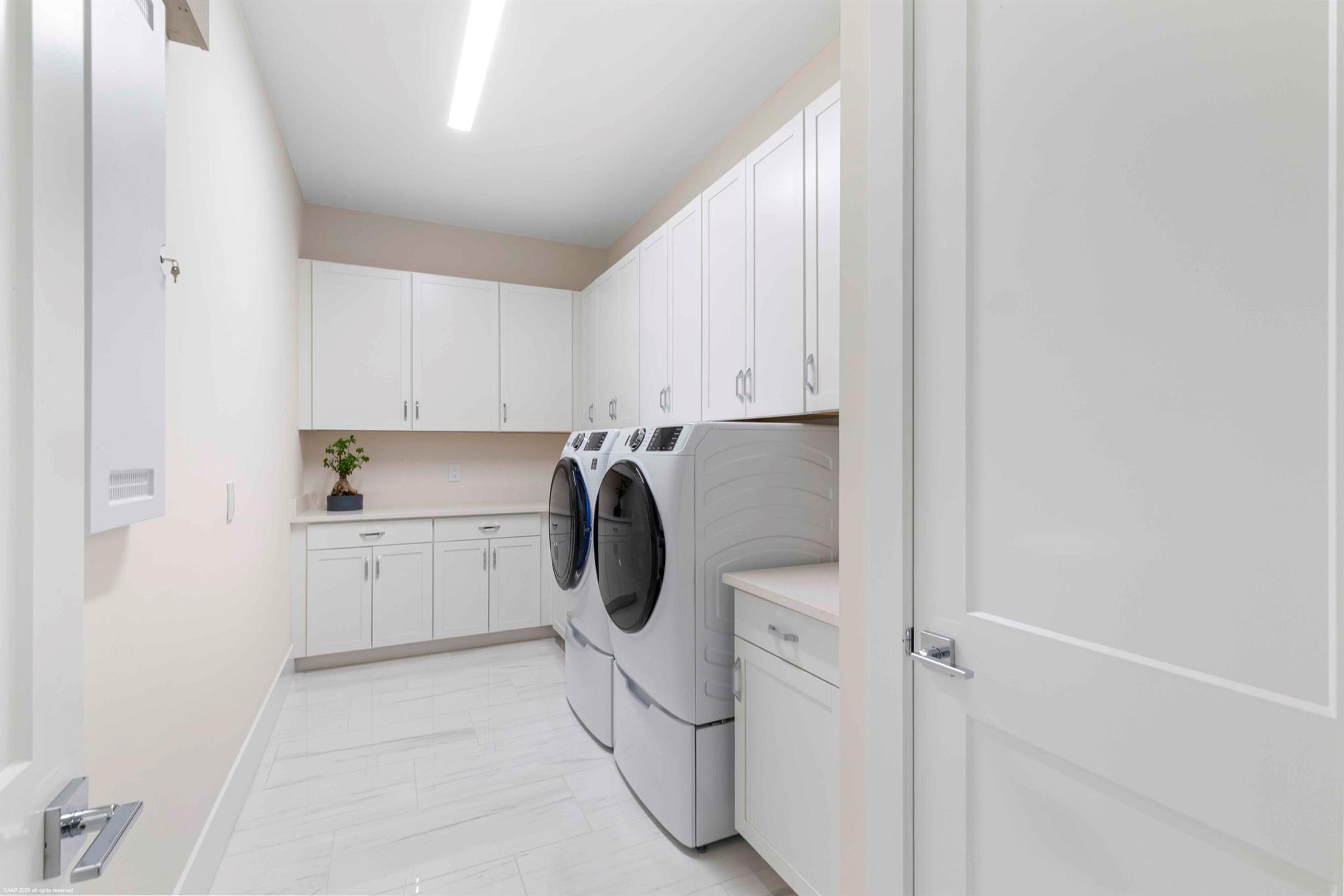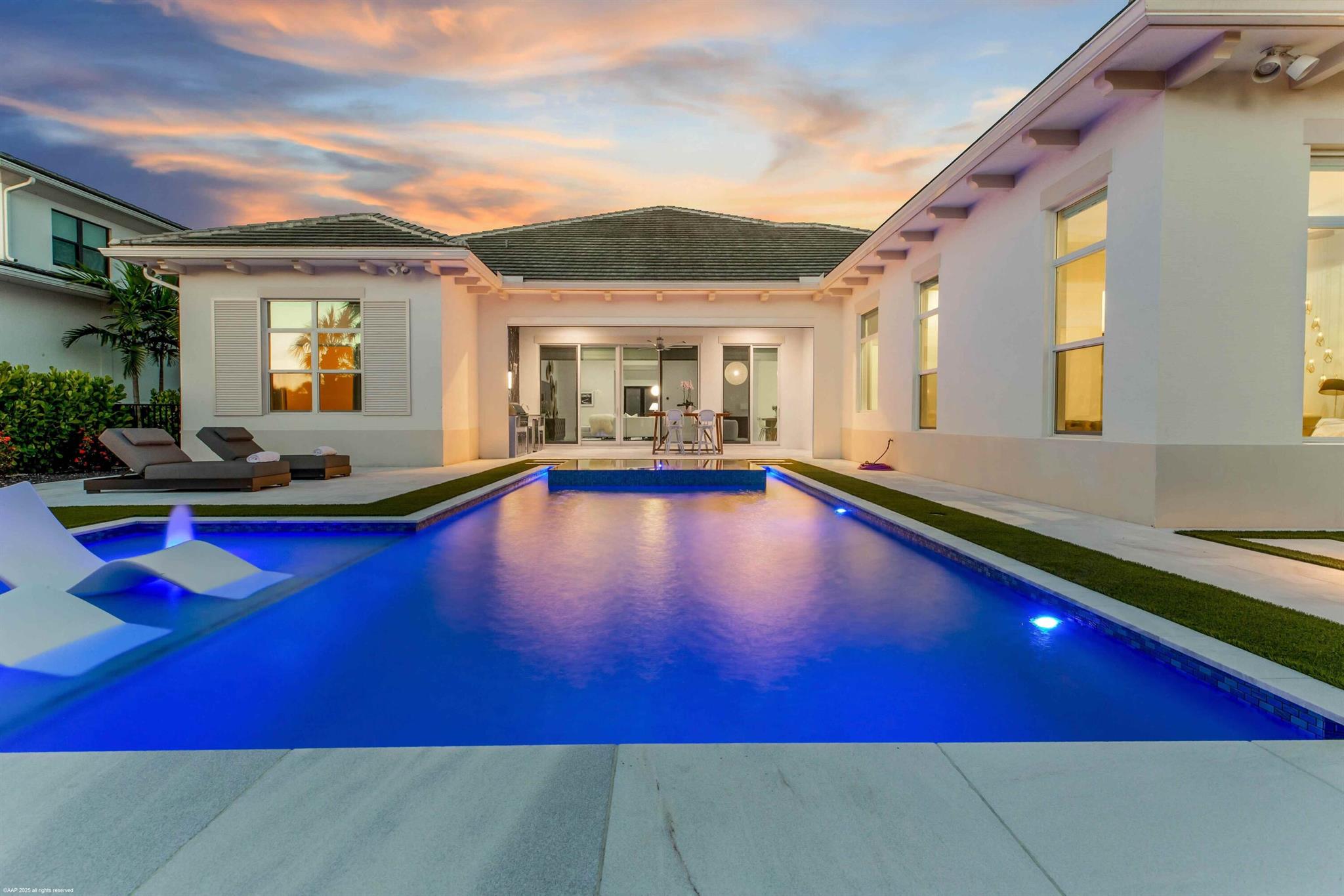Experience refined Florida living in this exquisite 5-bedroom, 4.5-bathroom Barbados V estate home by Kenco, perfectly positioned in one of Palm Beach Gardens' newest gated communities- Coral Isles at Avenir. Designed for both elegance and comfort, this single-story home offers exceptional craftsmanship, a thoughtful open-concept layout, and an outdoor oasis that rivals any resort. From the moment you arrive, the home's striking curb appeal sets the tone. A paver driveway leads to the spacious 3-car garage, while lush tropical landscaping, enhanced by professional landscape lighting, welcomes you to the front entry with brand new impact rated, double front doors. Inside, soaring ceilings, expansive windows with electronic shades, Lutron lighting, & designer finishes create an