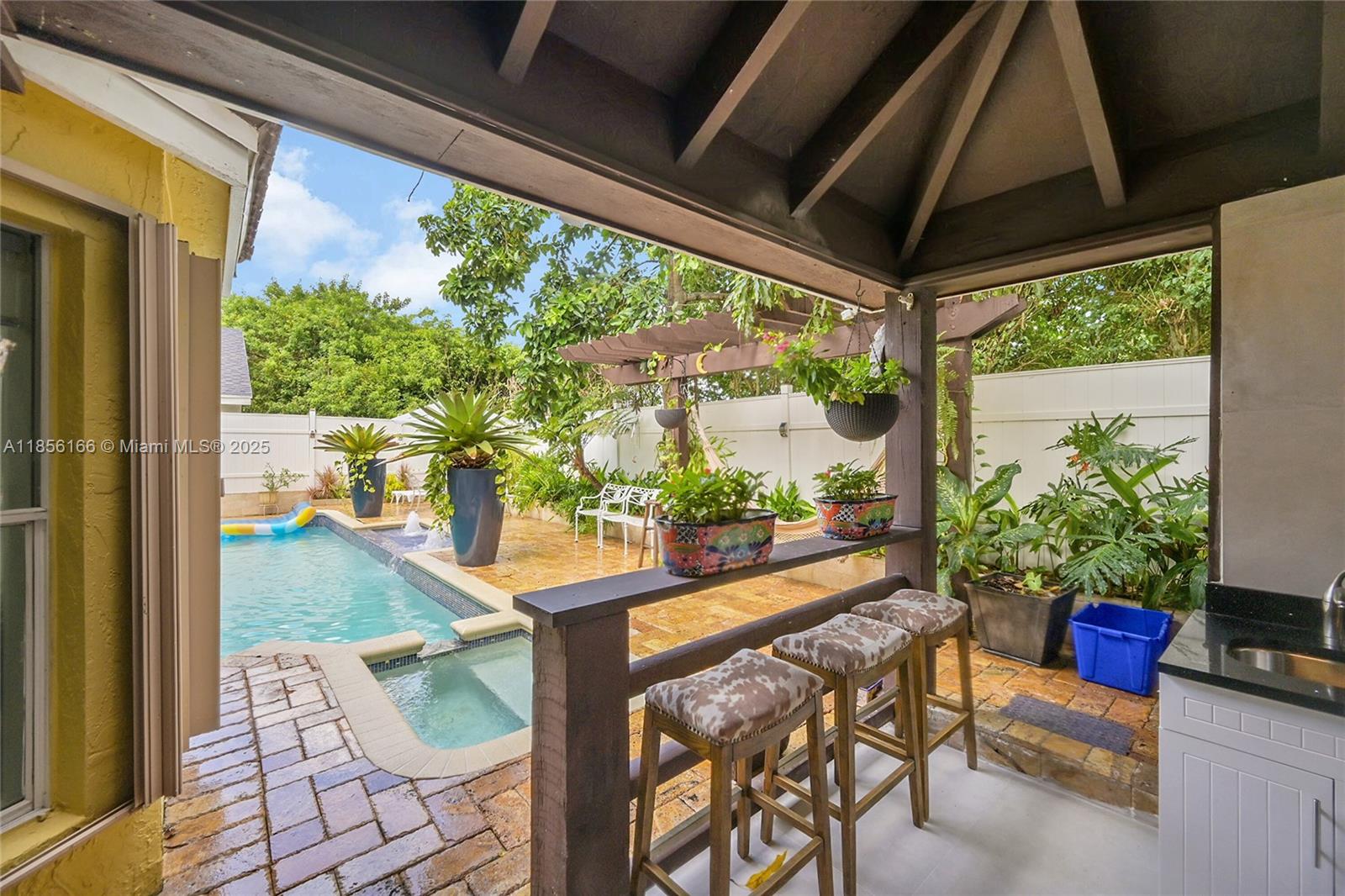 Beautifully upgraded 4-bedroom (2 suites), 3.5-bath home with vaulted ceilings, crown moldings, plantation shutters, and hardwood floors throughout. Spa-style bathrooms with rain showers and jets; master bath with Italian marble floors and walls. Chef’s kitchen with newer appliances,Sub-zero refrigerator, waterfall quartz island, hot tower, tankless water Heater. Outdoor summer kitchen with Alfresco BBQ grill/with Rotisserie, pizza oven, under wood-paneled patio ceiling. Oversized pool with spa blower, spa bench with jets, marble pool deck, and tropical fruit trees.Also featuring are hurricane shutters, brick driveway, oversized garage with custom closet, upgraded half bath, mud room, and hi-hat lighting throughout. HOA offers tennis courts, pickleball courts, and kids playground.