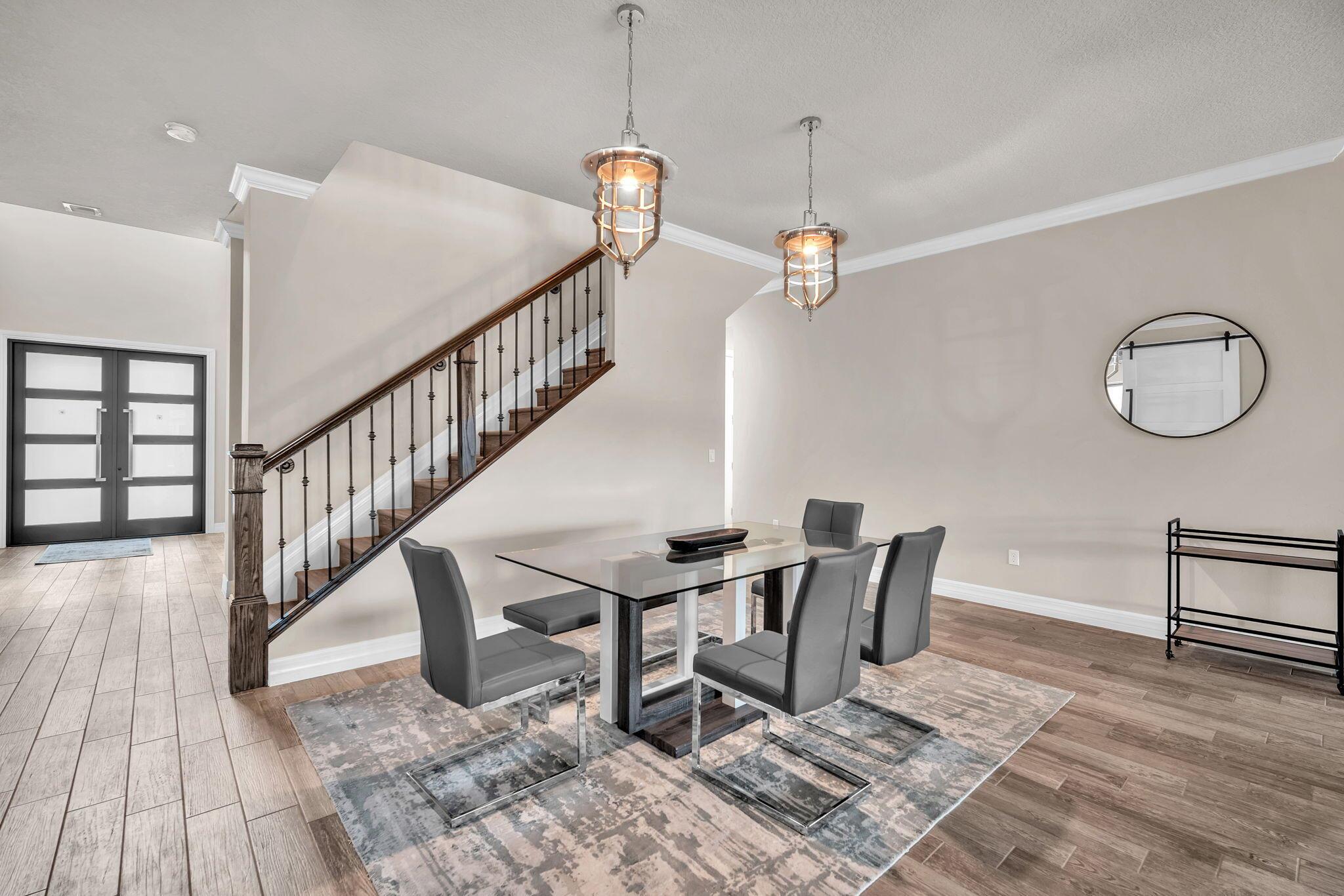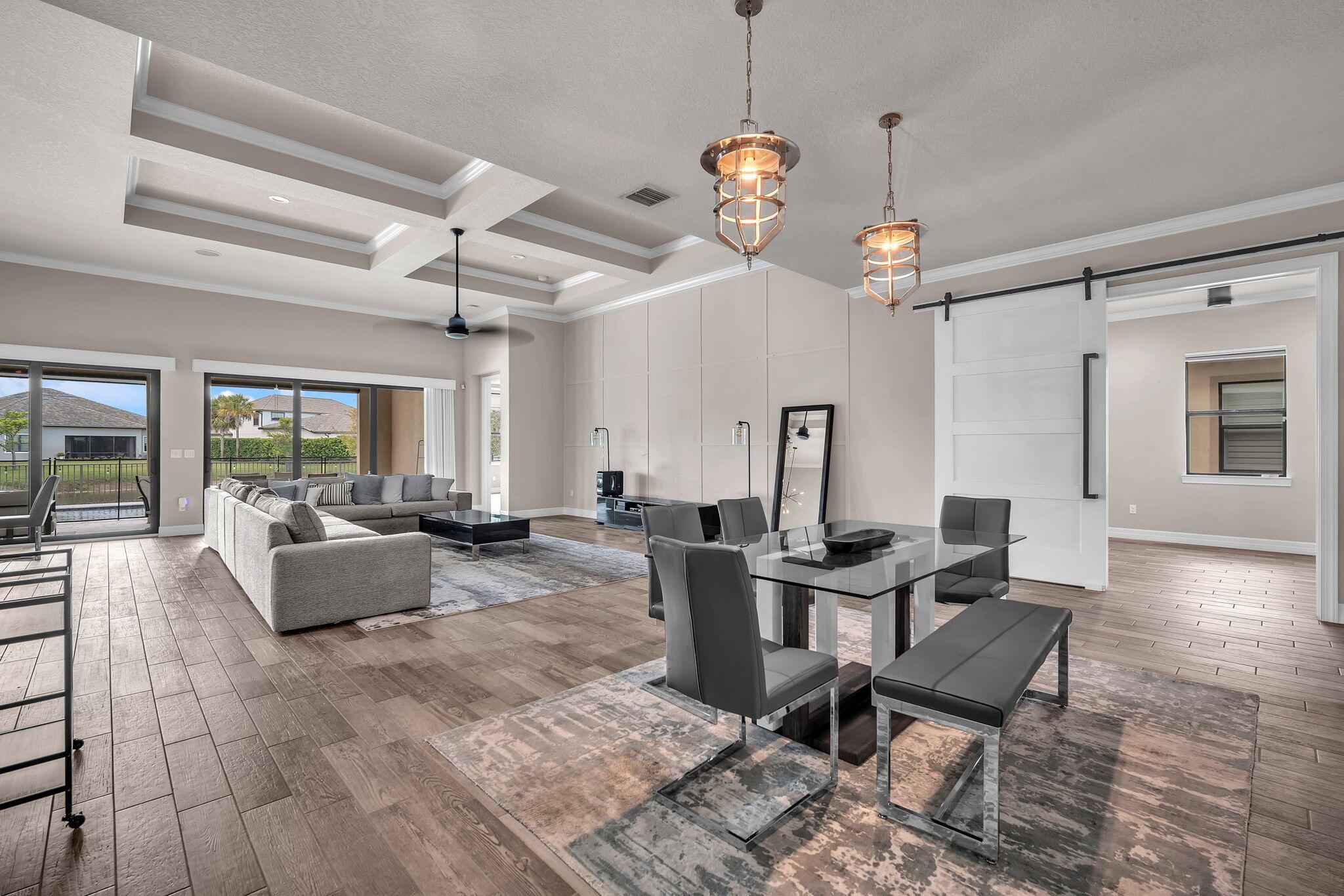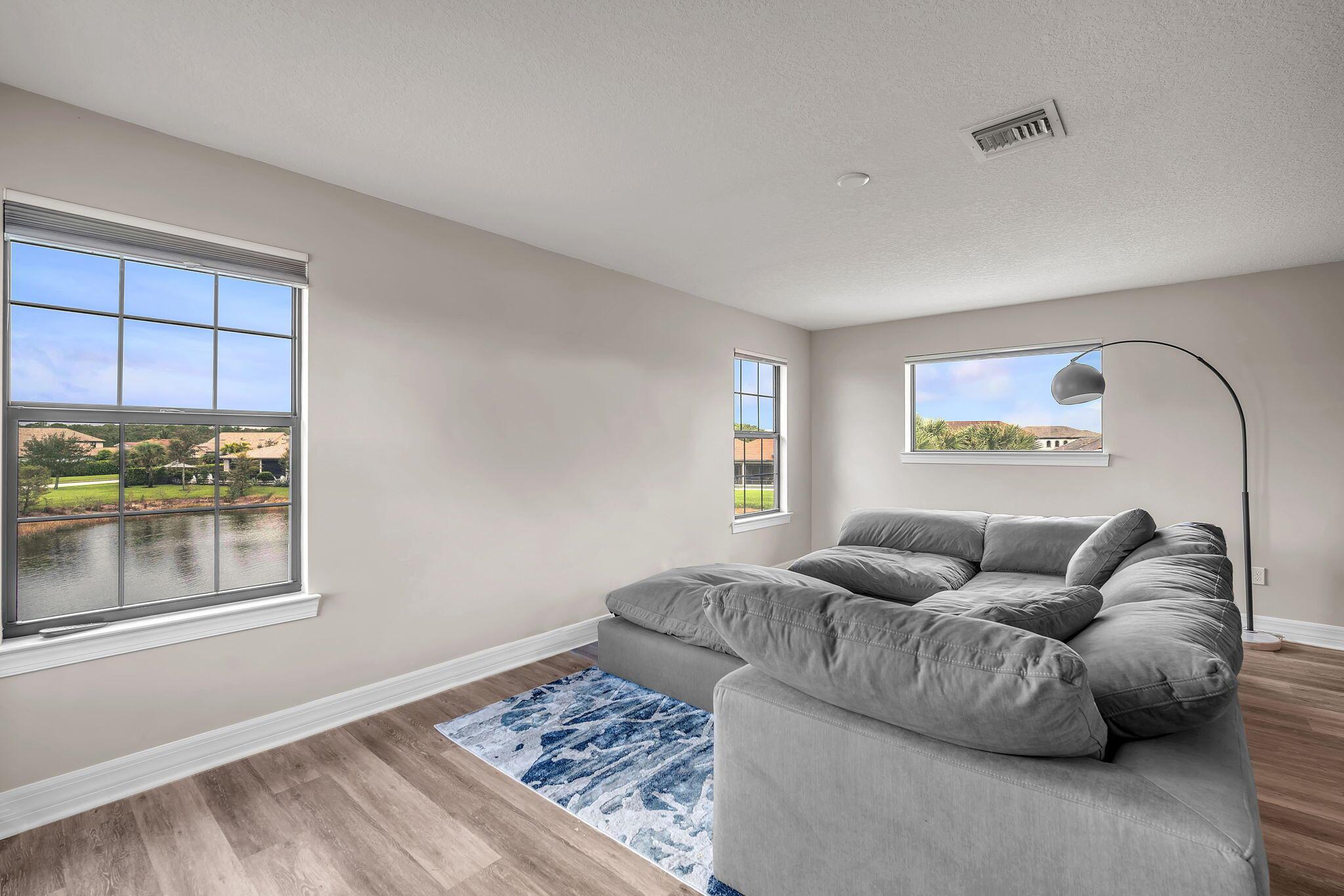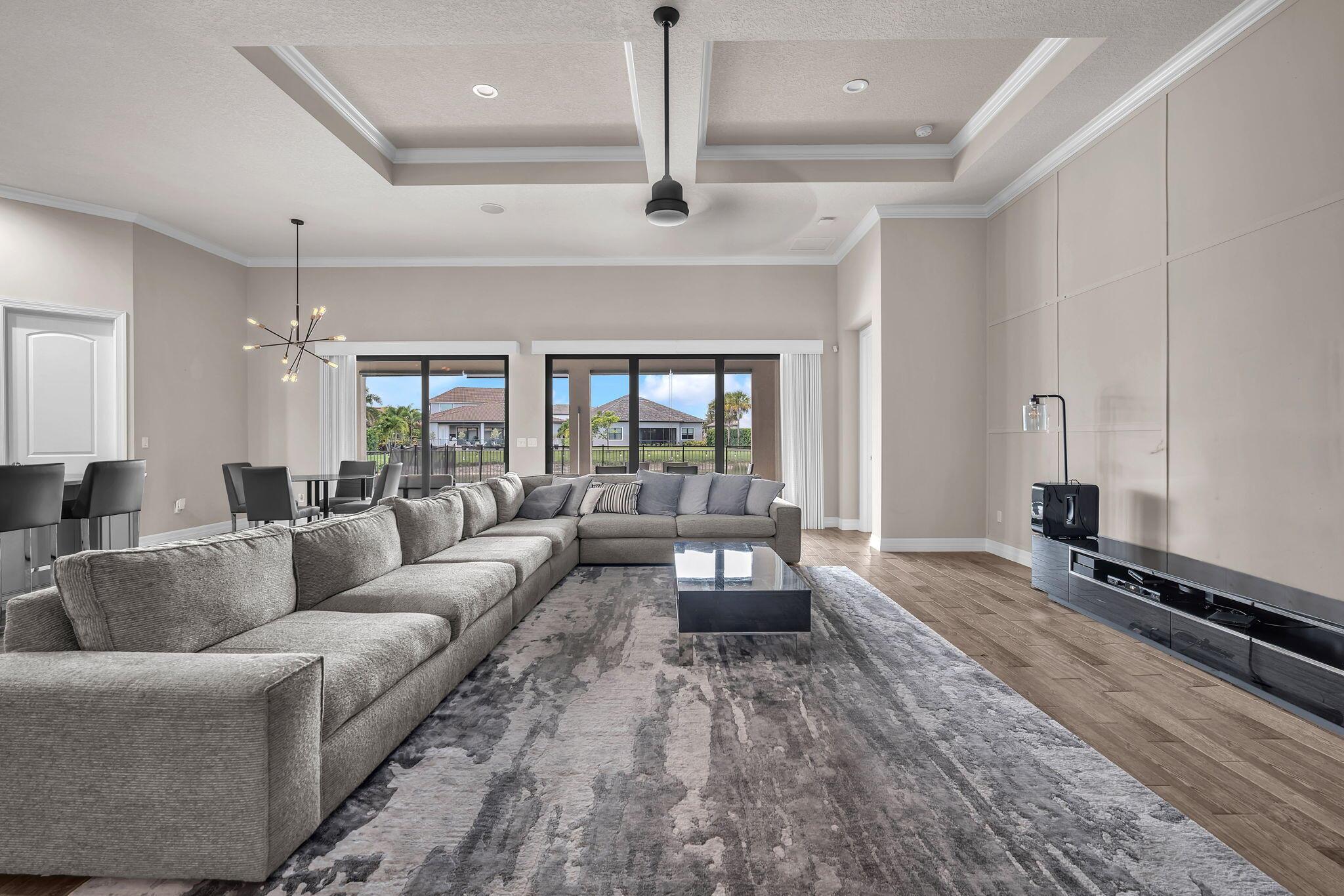 This stunning waterfront home, situated on a rare, ultra-premium corner lot, offers panoramic lake views from nearly every room. Enter through custom front doors into an elegant, contemporary residence featuring a spacious open floor plan and soaring ceilings that create an expansive feel. The chef's kitchen is a focal point, boasting gorgeous gray cabinetry, stainless steel appliances, a gas stovetop, double ovens, and a massive kitchen island. The home's modern flair is evident in its neutral color palette, upgraded wood-grain tile flooring downstairs, and dazzling light fixtures. The seamless indoor/outdoor flow between the living room and the patio makes this an entertainer's dream.