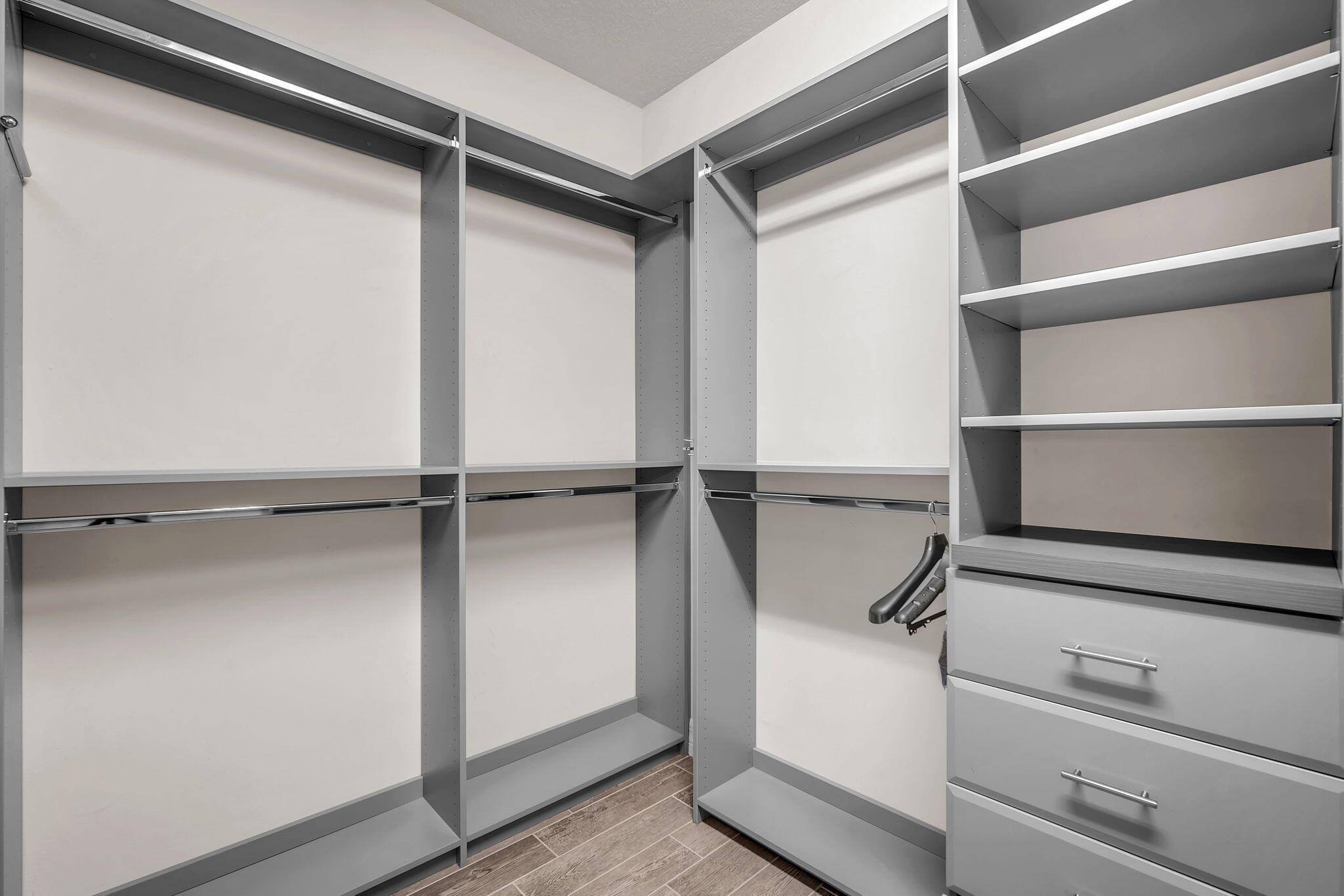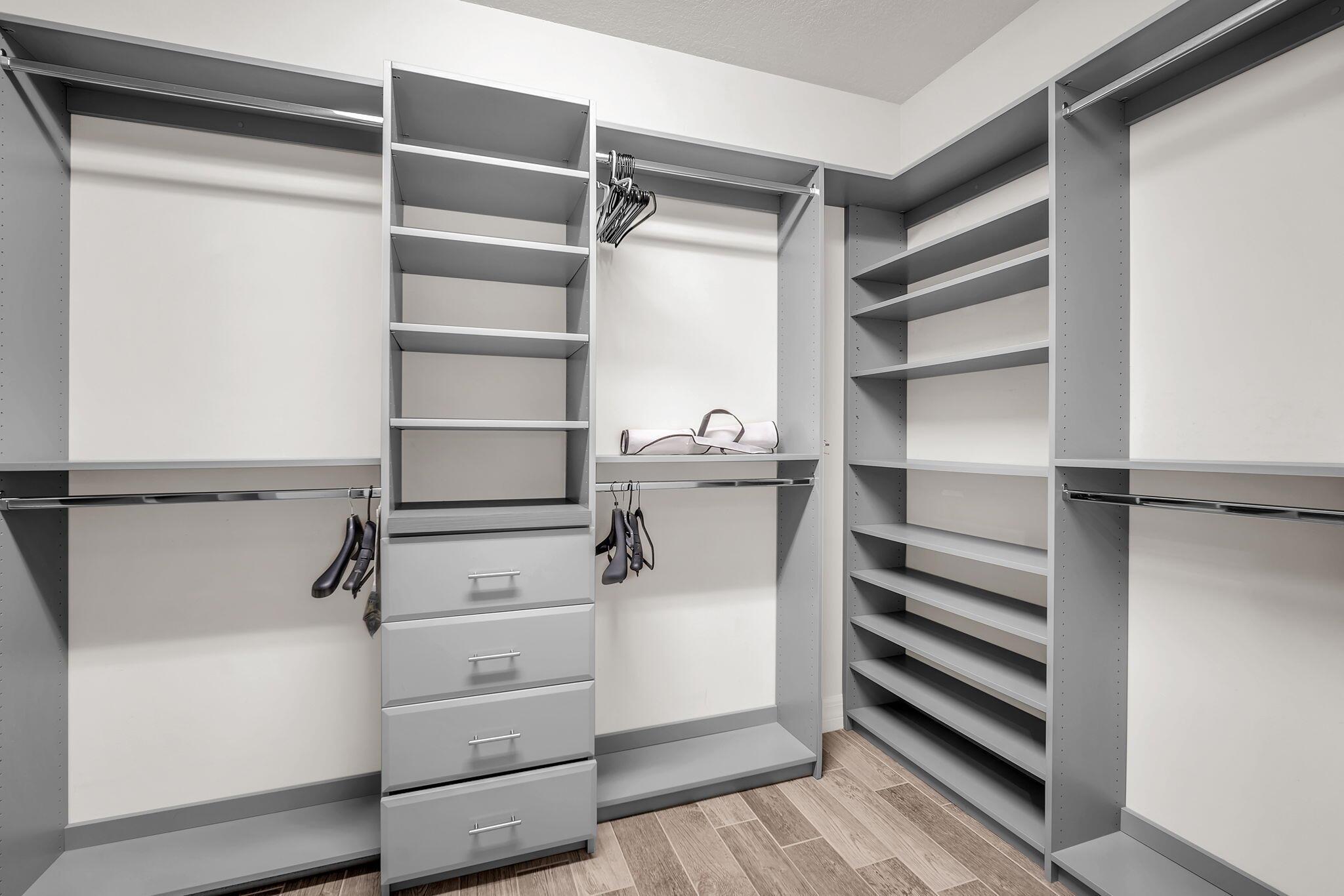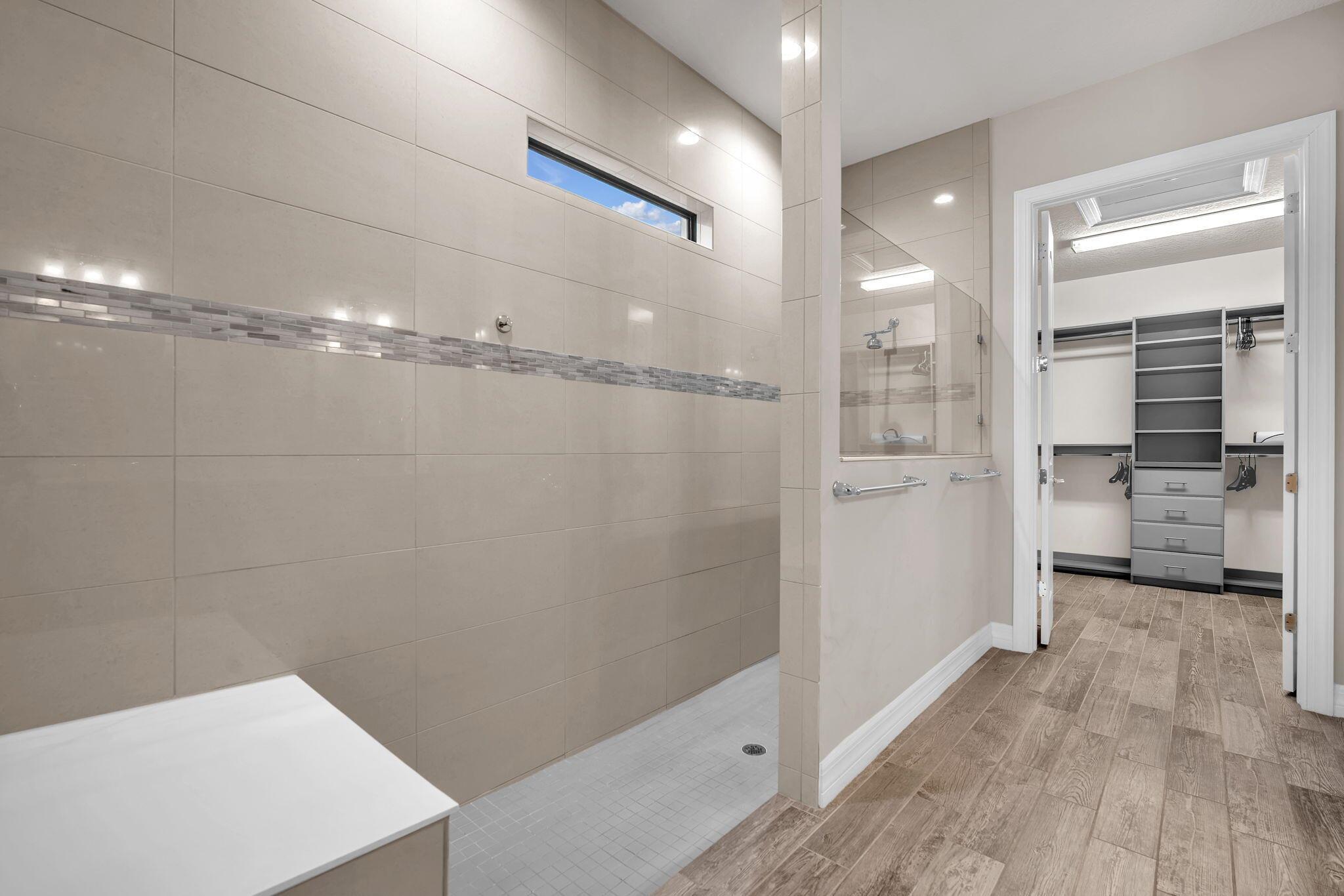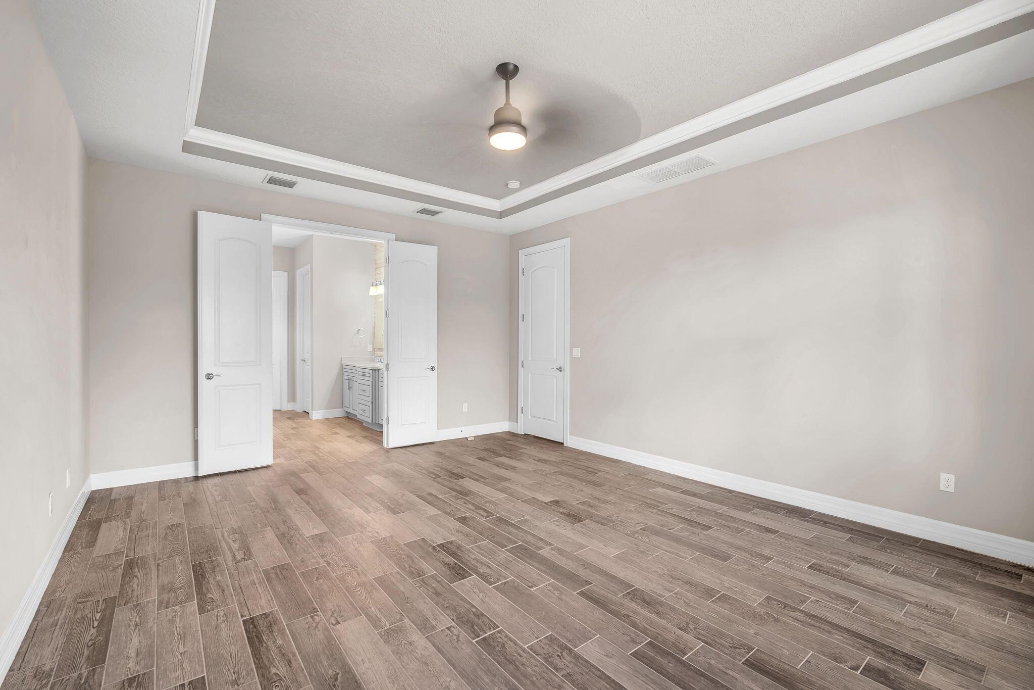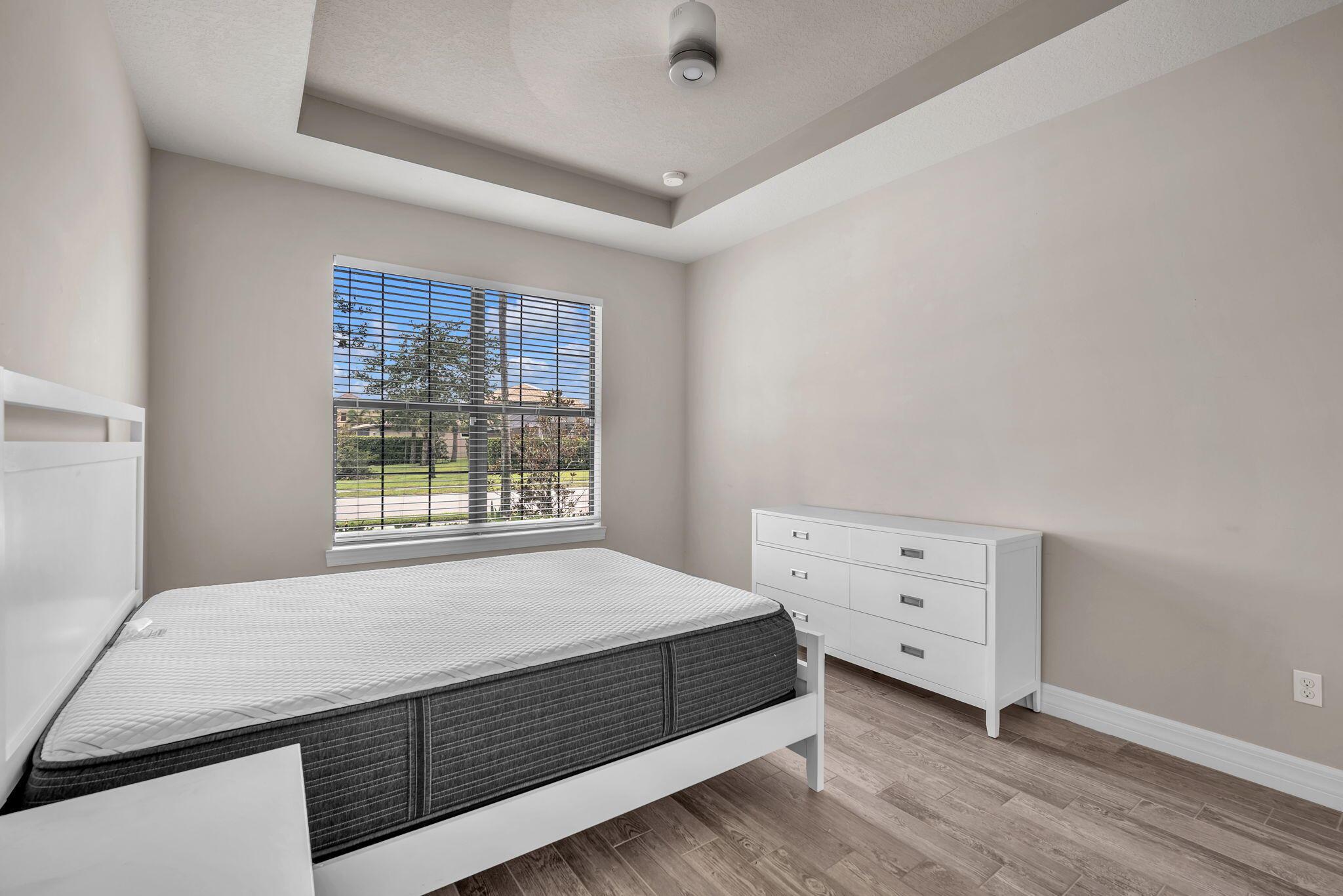 This stunning waterfront home, situated on a rare, ultra-premium corner lot, offers panoramic lake views from nearly every room. Enter through custom front doors into an elegant, contemporary residence featuring a spacious open floor plan and soaring ceilings that create an expansive feel. The chef's kitchen is a focal point, boasting gorgeous gray cabinetry, stainless steel appliances, a gas stovetop, double ovens, and a massive kitchen island. The home's modern flair is evident in its neutral color palette, upgraded wood-grain tile flooring downstairs, and dazzling light fixtures. The seamless indoor/outdoor flow between the living room and the patio makes this an entertainer's dream.