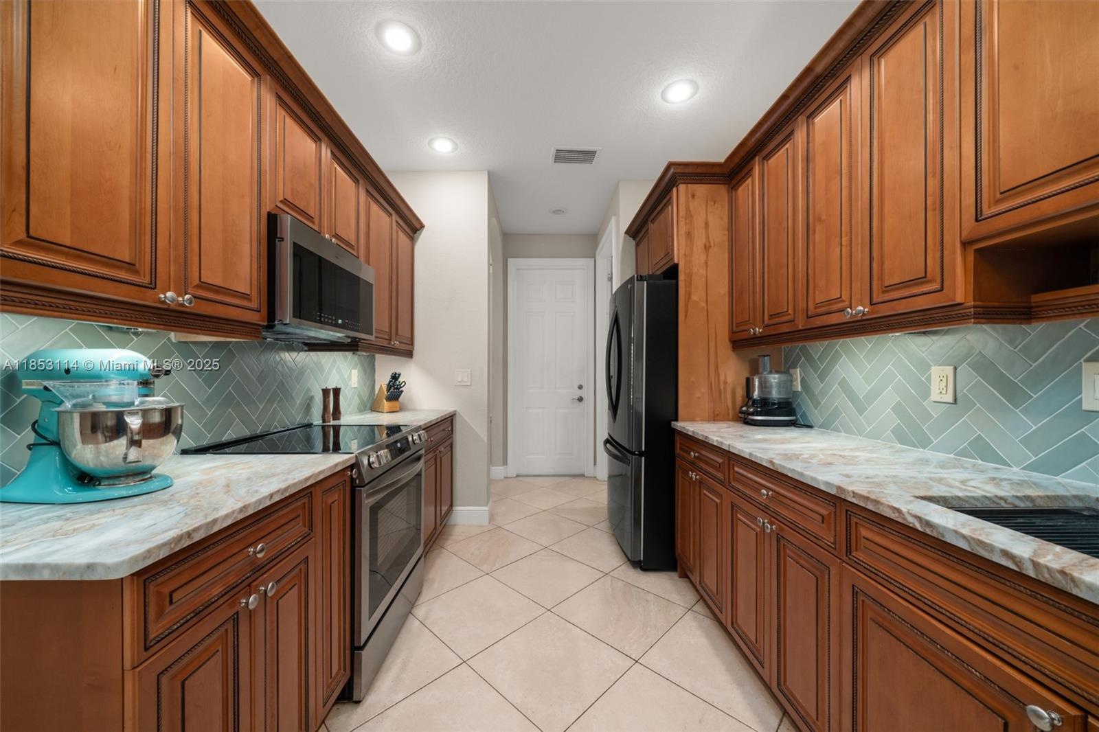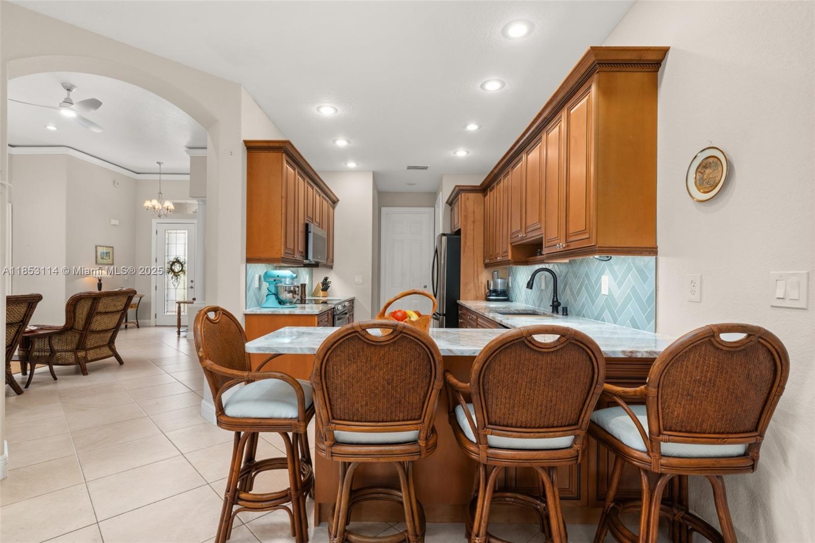 In sought-after Magnolia Place at Sun N’ Lakes, this home offers style and comfort with a 2023 concrete barrel tile roof. The open split-bedroom layout features 12' vaulted ceilings & upgraded ceiling fans. The kitchen includes solid wood cabinets, granite counters, under-cabinet lighting & stainless appliances (under 4 years old). The primary suite has two walk-in closets and a spa-like bath with dual sinks, walk-in shower, and private water closet. Two guest bedrooms,one with a built-in desk—share a full bath. Hurricane-rated sliders open to a screened paver porch.City water/sewer, well irrigation, and a maintained lawn with regular pest control included. Enjoy a community pool, clubhouse with restaurant, two golf courses, and on-site police/fire,minutes from hospital, shopping & dining.
