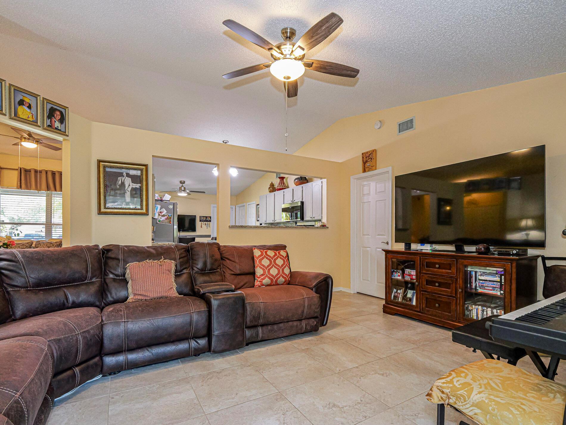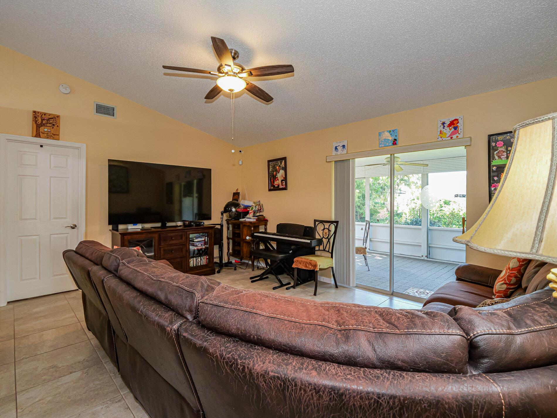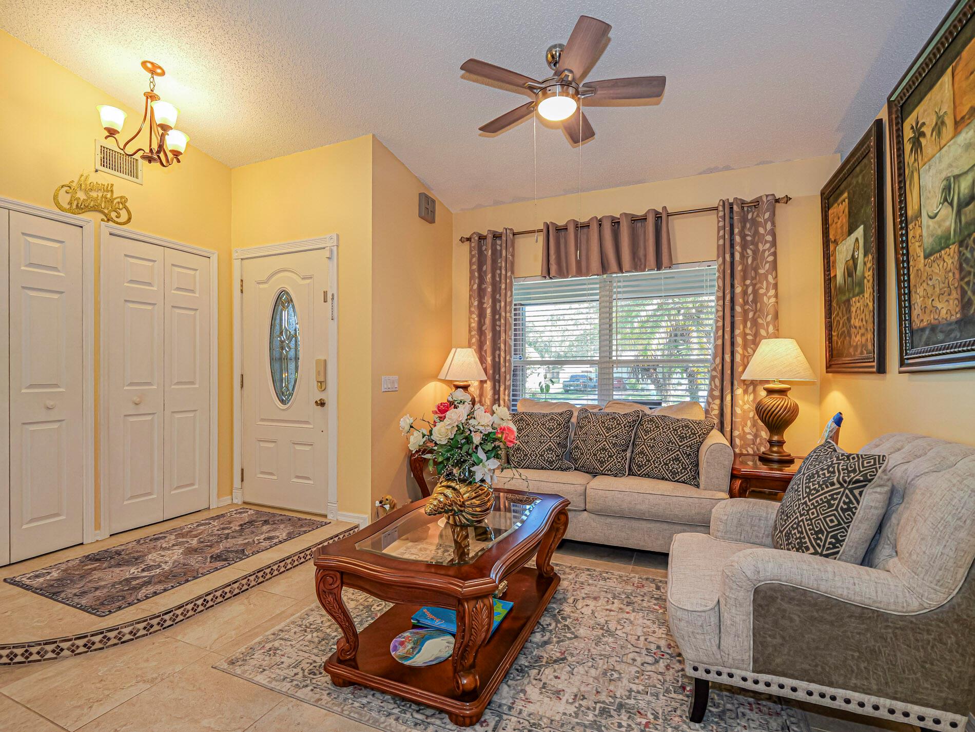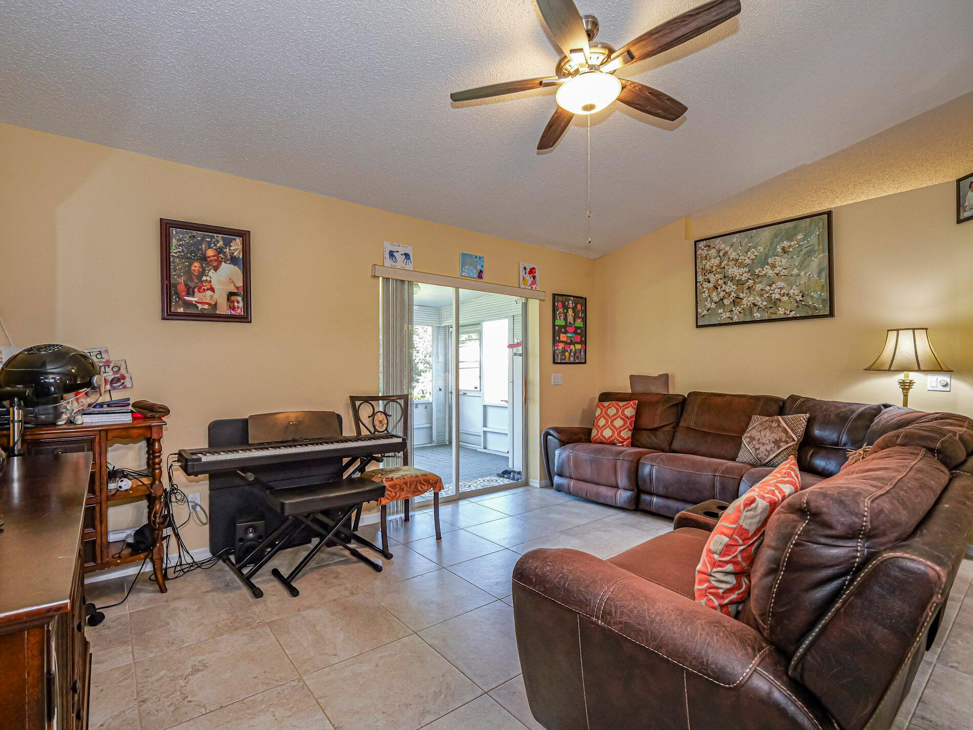 This is a must see! Welcome to this move in ready 3-bedroom, 2.5-bathroom home featuring a beautifully manicured yard with a 2 car garage with screen door. Enjoy the convenience of being minutes from shopping, dining, parks, and the beach. The backyard features fruit trees and a shed with a ramp. The living room, dining area and family room offer plenty of space for relaxation and hosting guests. Washer and dryer are included. The home boasts a screened front porch with tile flooring. The kitchen is equipped with granite countertops, and the living room, kitchen, and family areas all have tile flooring. The master bathroom has been recently renovated. 2023 roof. Screened back porch with pull-down hurricane shutters. This home is full of potential!