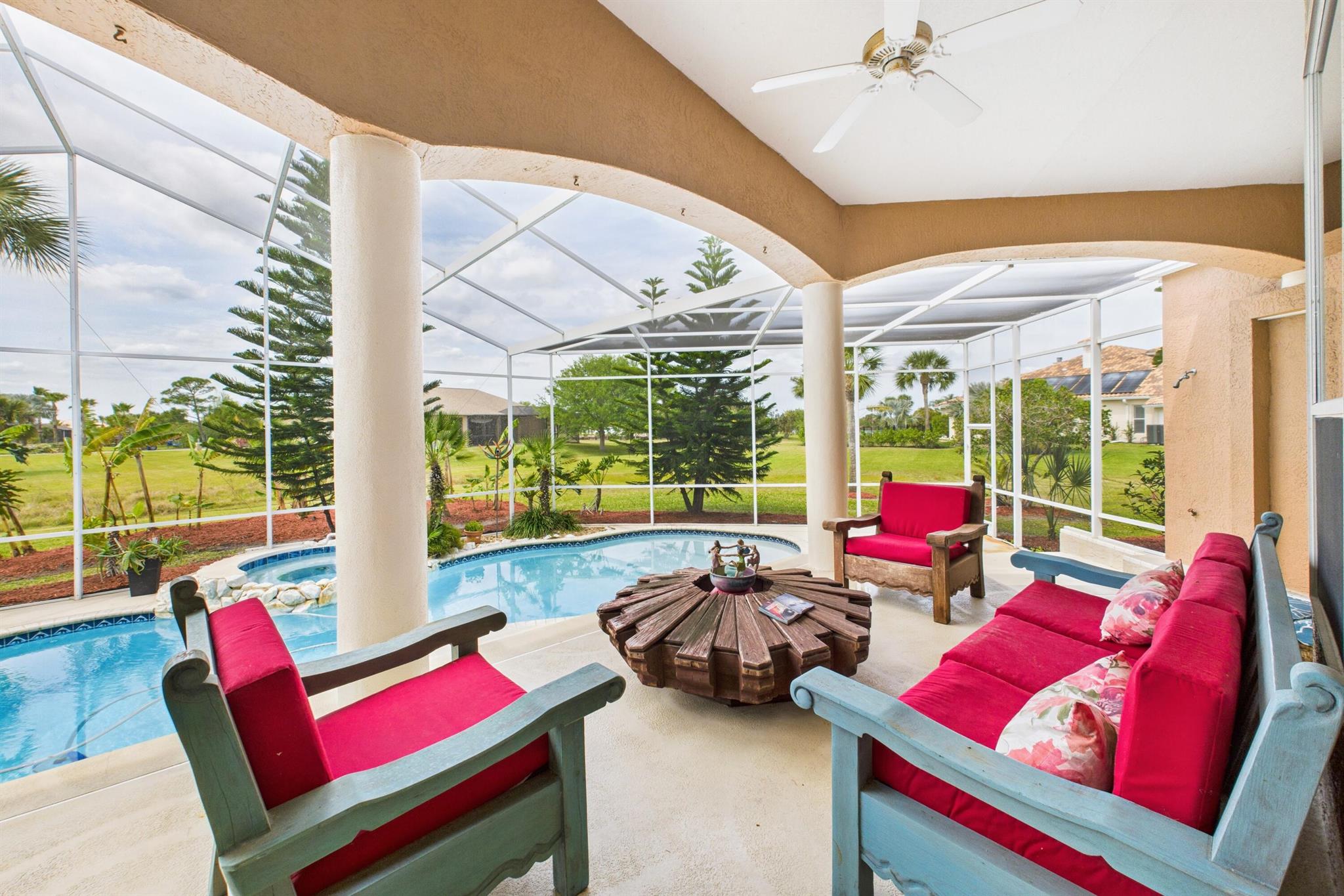 Experience elevated living in this exquisite estate home, set on over an acre within a prestigious gated community. Thoughtfully designed with Feng Shui influences, the residence offers a perfect blend of tranquility and luxury. Dramatic vaulted ceilings and expansive windows fill the space with natural light, creating a bright, open ambiance. The gourmet kitchen features high-end appliances and flows effortlessly into a spacious living area, ideal for entertaining. Step outside to a serene two-story covered patio overlooking a screened-in pool and hot tub--your private outdoor sanctuary. This one-of-a-kind property combines privacy, elegance, and comfort in every detail. Schedule your private tour today!