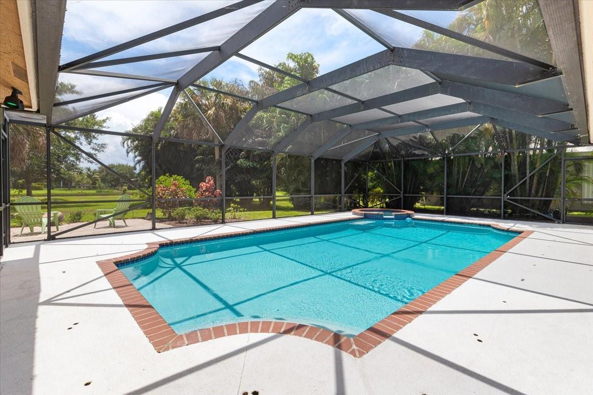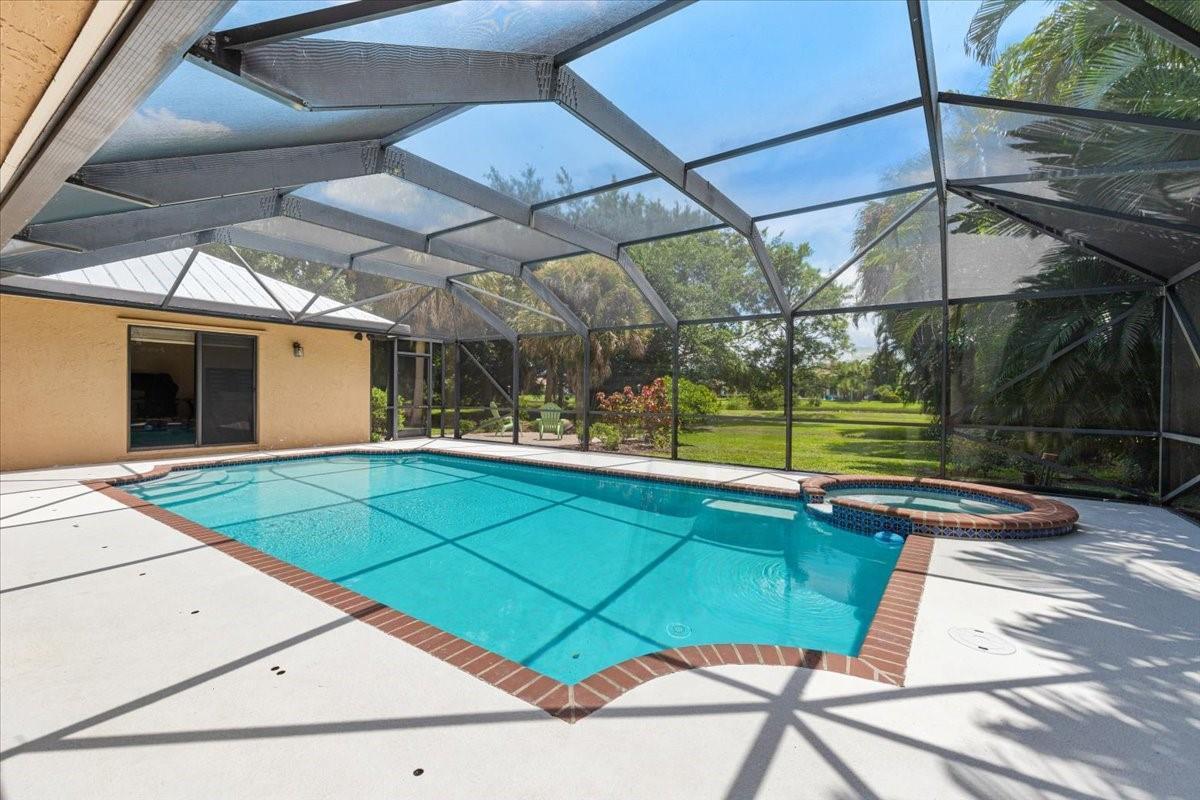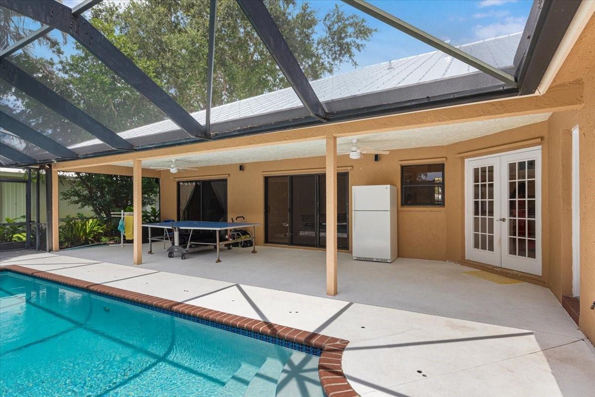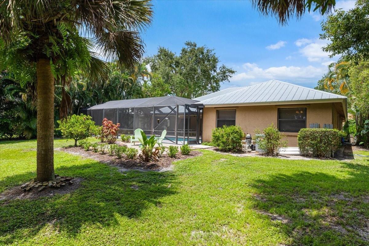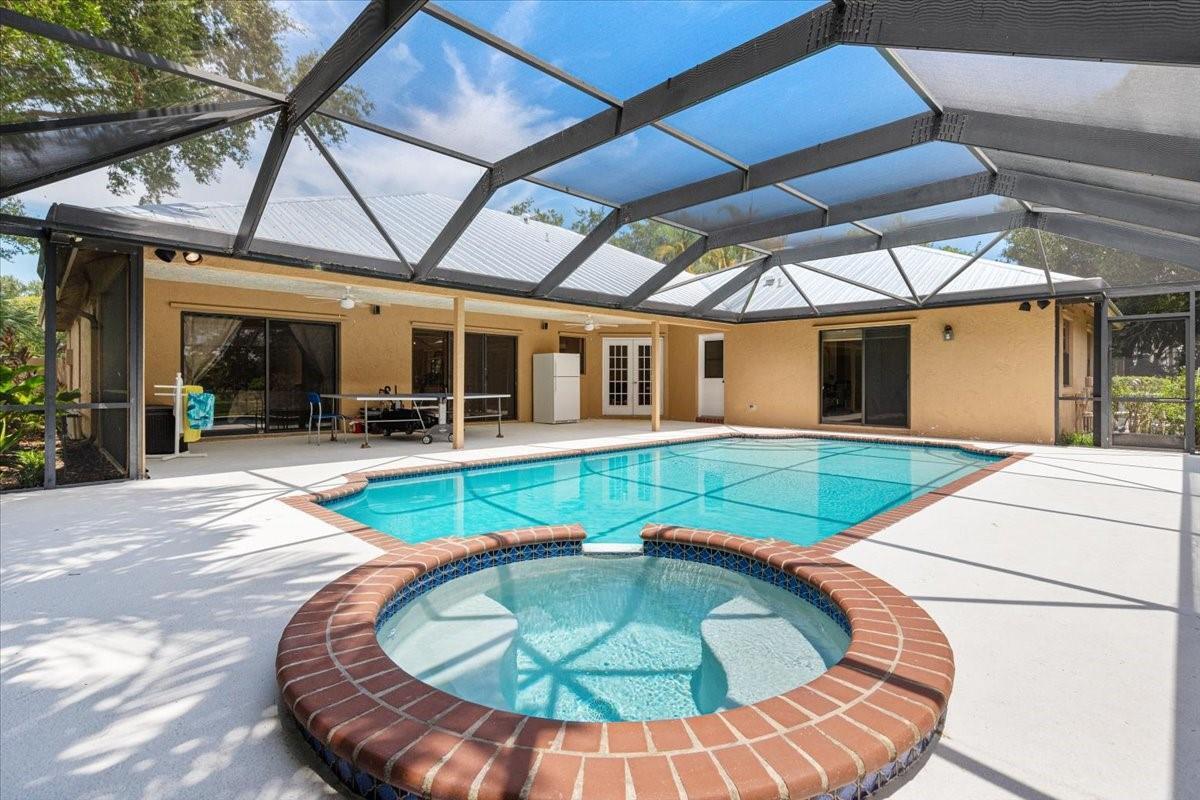 Welcome to your private paradise in the exclusive gated community of Danforth! This stunning residence sits on an expansive 11,741 SQFT lot, stretching to a serene canal. Enjoy the oversized screened-in patio with resurfaced pool, spa, and convenient cabana bath access. Inside, vaulted ceilings greet you, along with an upgraded kitchen, recessed lighting, and freshly painted interiors. All bedrooms feature luxury vinyl flooring, while clean white tile runs throughout the living areas. The spacious 2,396 LIV SQFT split floor plan provides both comfort and functionality. The master suite boasts dual walk-in closets and an oversized dual walk-in shower. Additional upgrades include NEW ELECTRIC PANEL 2025, NEW 2024 metal roof, newer washer/dryer, hurricane shutters, and 2019 WH