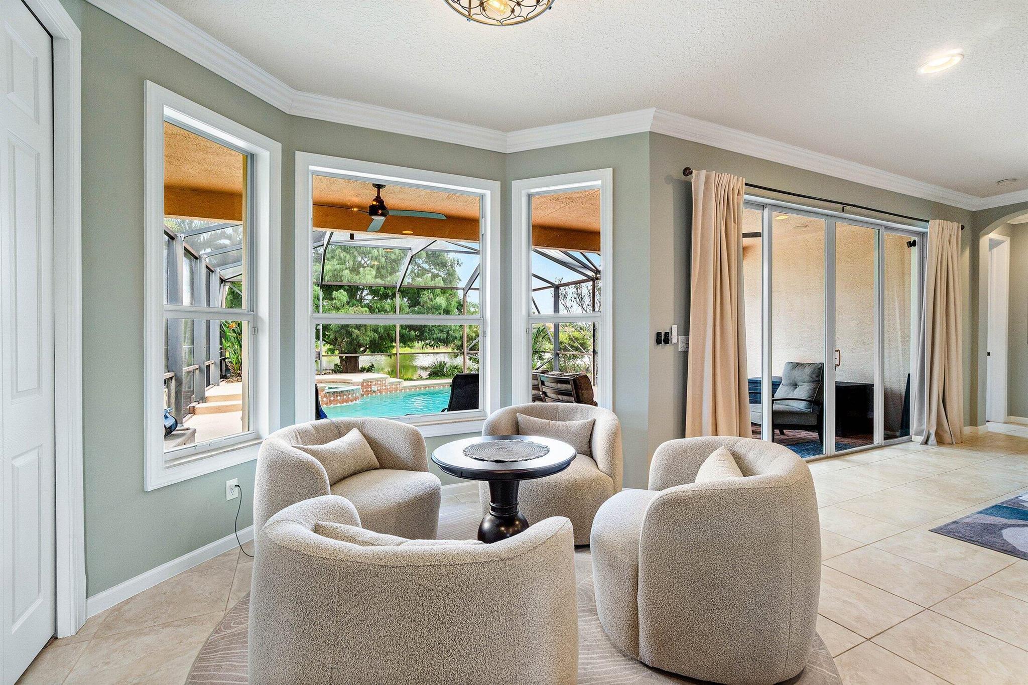Tranquil lakefront home residing in Legacy Cove of Stuart. This Brookfield model commands Southern exposure and offers 3,646 square feet of living space, four bedrooms, study, three full bathrooms, powder room along with an expansive loft. Finishes and noteworthy attributes; impact windows throughout, new double impact front door, freshly painted interior throughout, new fans, dual vanity primary bathroom with separate water closet, new commodes, salt chlorinated pool and spa with new cell and motherboard and a three car garage complete with dedicated Level 1 and Level 2 EV receptacles.