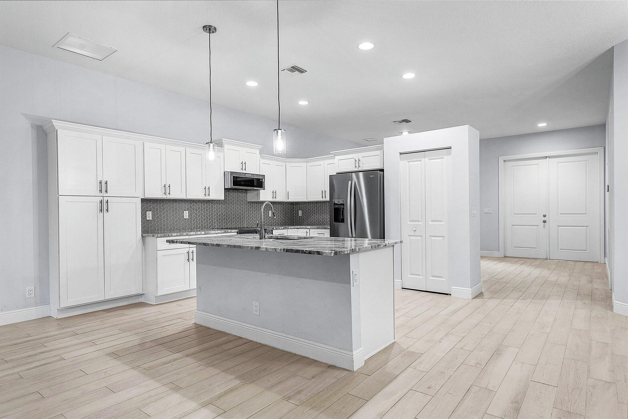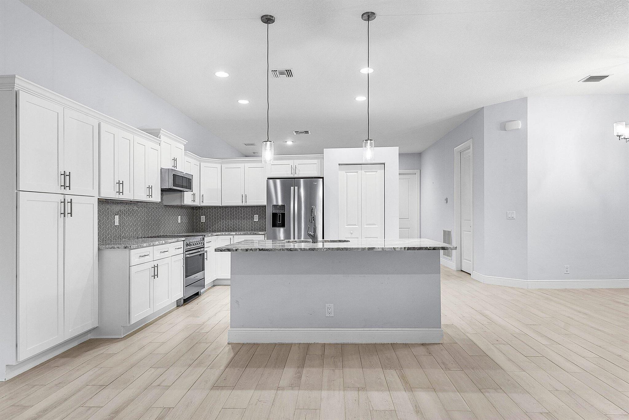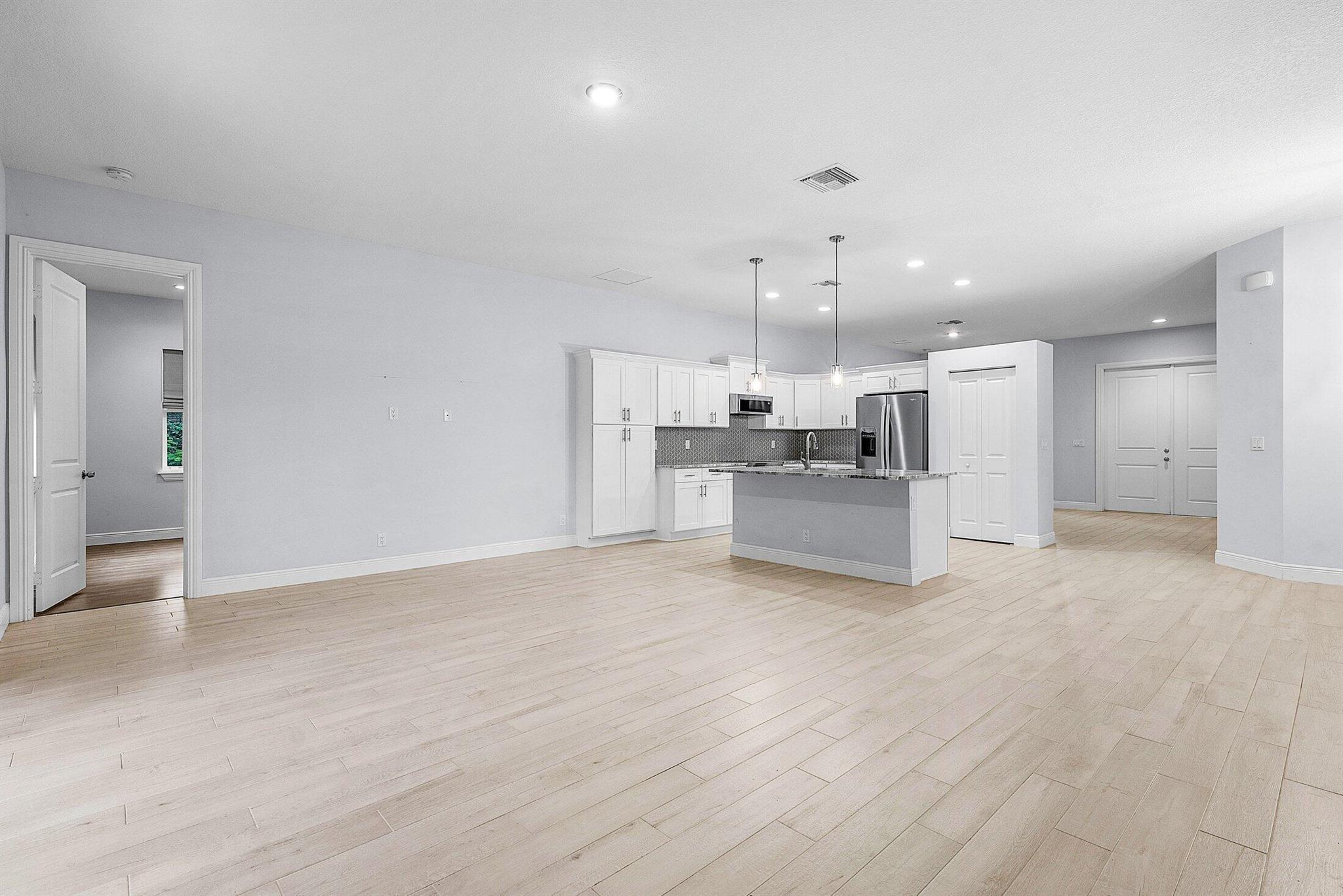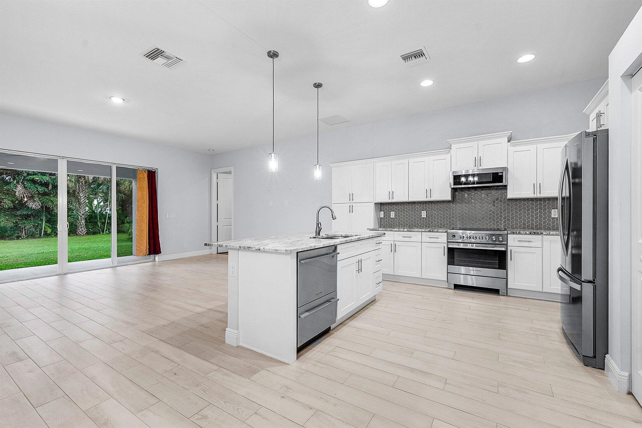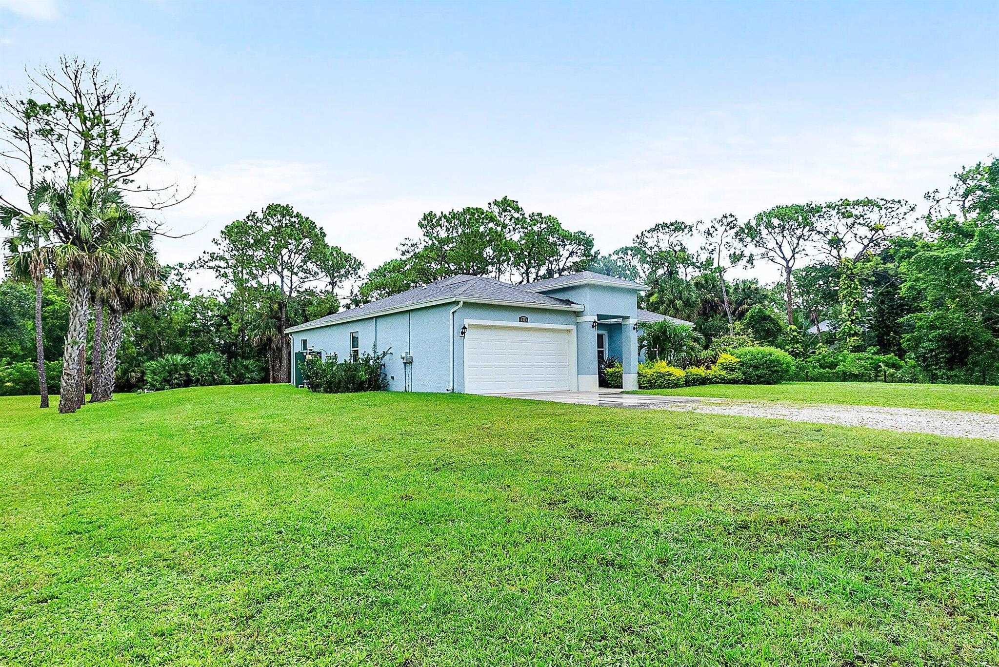 WELCOME HOME This well appointed 2022 built gem is resting on a premium 1.15 acre lot and boasting 4 true bedrooms, 2 full baths, 2 car garage, upgrades galore, hurricane impact windows and doors throughout and this beauty is in a peaceful location! ENTERING you will discover that this home is on a high and dry lot with no pond and fully fenced. The covered entry brings you inside where you are greeted by 10' volume ceilings, high-end flat wall finish, porcelain and luxury vinyl flooring, abundance of natural lighting and gorgeous kitchen that features; a stainless steel appliance package, quartz counter tops, lovely backsplash, spacious island with bar, shaker style cabinetry with two pantries, breakfast nook and great room that overlooks the expansive green space. (CLICK)