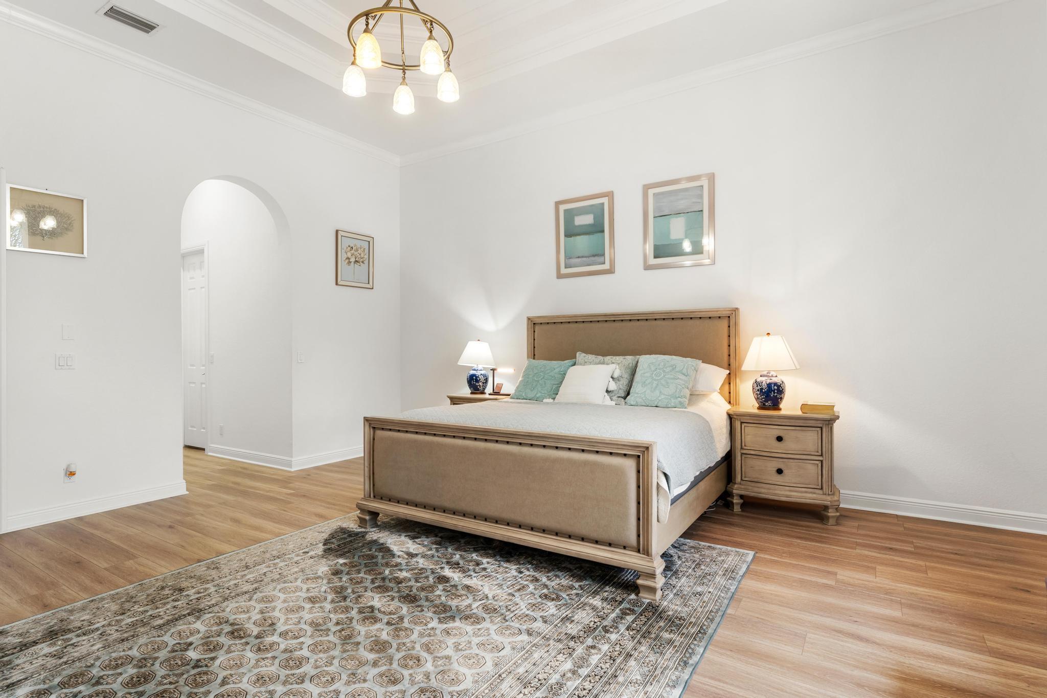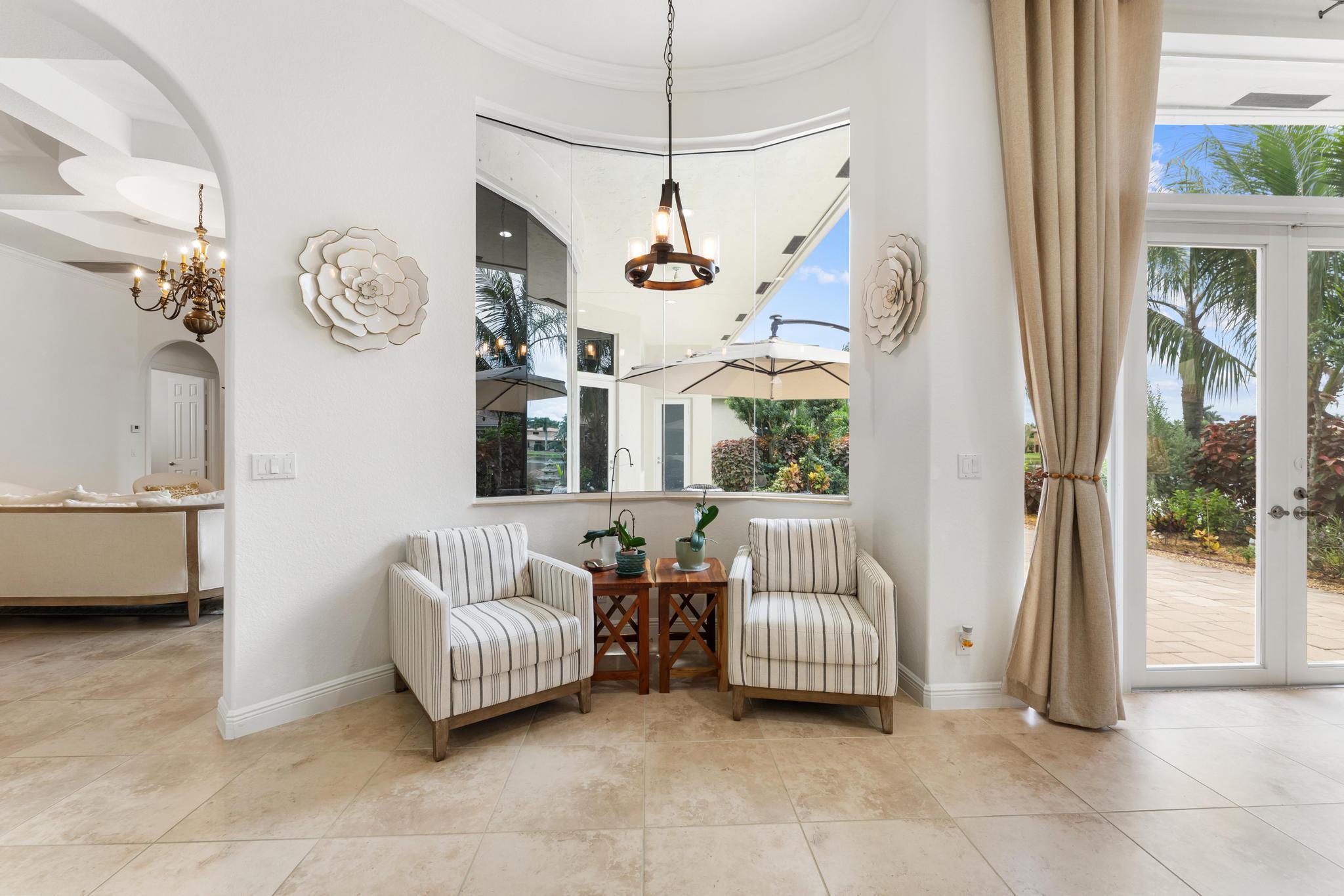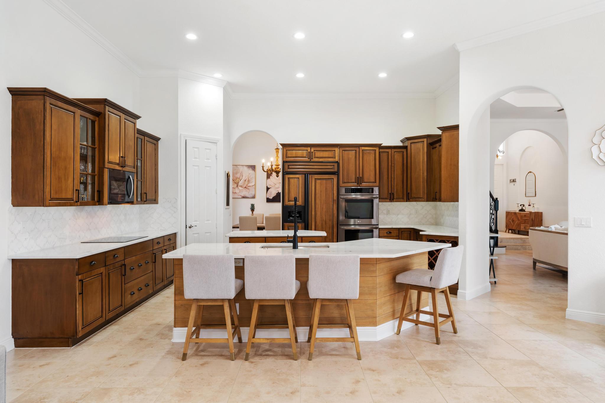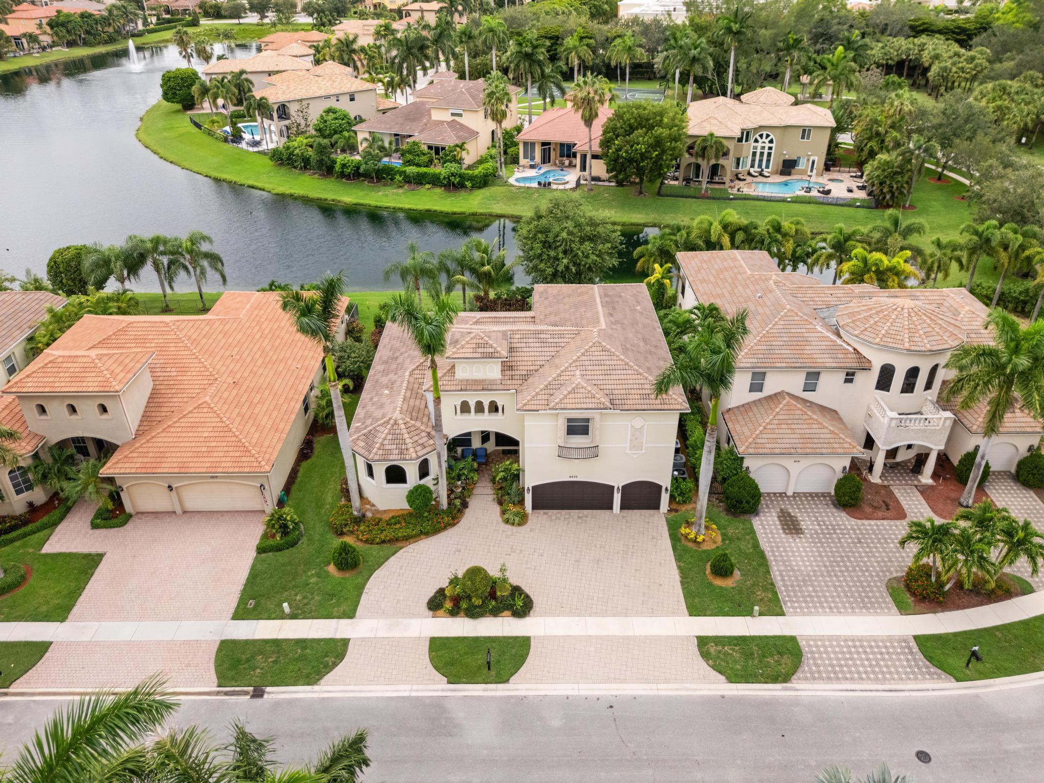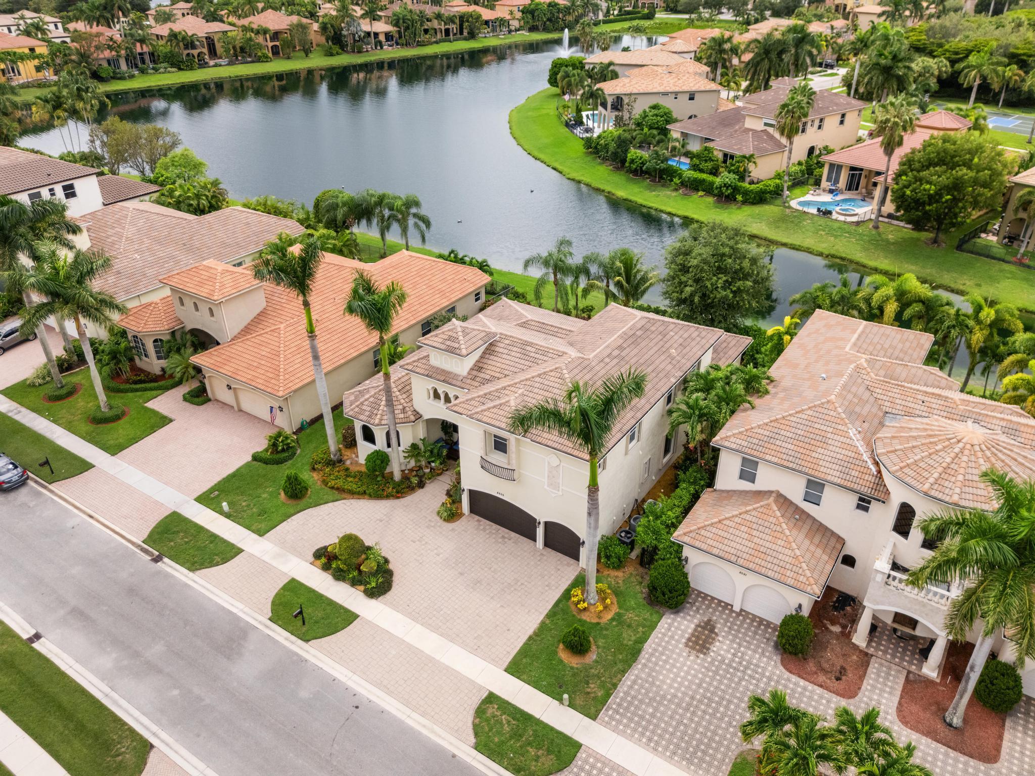This elegant estate offers 4,179 sq ft with an open layout designed for both comfort and entertaining. Inside, the home showcases white marble countertops that flow seamlessly into the backsplash, updated flooring, and expansive living areas filled with natural light through oversized glass and arched windows. Beautiful French doors help create indoor-outdoor living through thoughtful design.The primary suite is a retreat of its own, featuring a European-style walk-around shower, jacuzzi tub, and dual sinks. Additional bedrooms provide flexibility for family, guests, or a private office.Outdoors, enjoy sweeping lake views from the extended patio with room for a pool and an outdoor bathroom. Located just minutes away from Turnpike, shops, golf, and so much more.