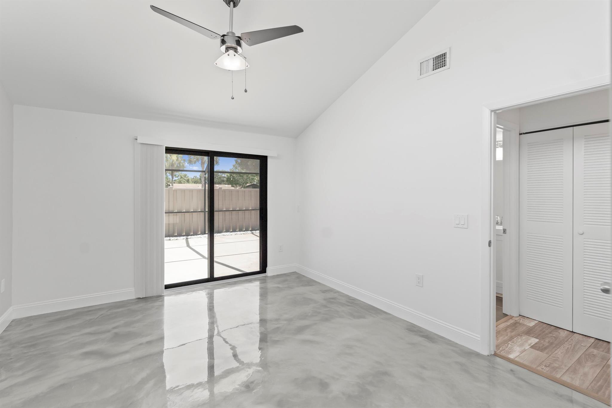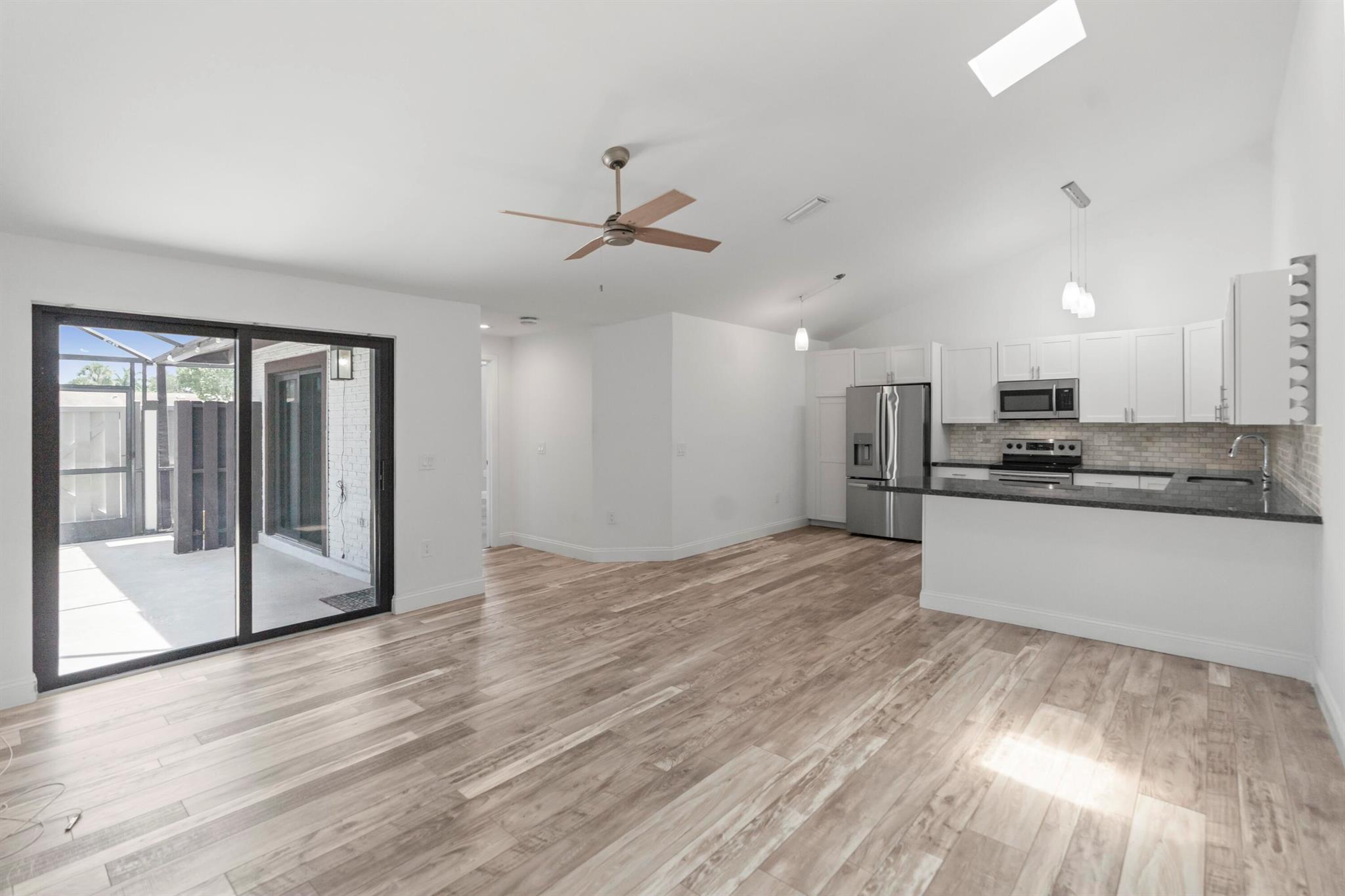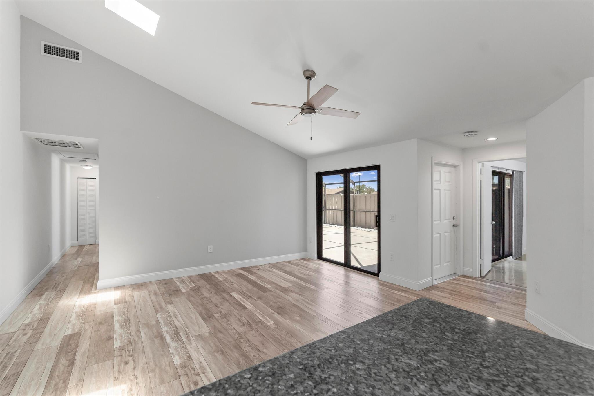 Step into your new home in the heart of Boca Raton! Enjoy the privacy and comfort of a single-family home in this move-in ready villa, located in the all-age community of Boca Gardens. With a split-bedroom layout, the master suite is privately situated on one side of the home with an upgraded bathroom featuring dual vanities, while the other two bedrooms are located on the opposite end for added privacy. Both the master bedroom and bedroom 3 have solar-tinted windows, and the home boasts all-new impact windows and doors (2023). The living area features soaring ceilings and skylights, filling the space with abundant natural light.