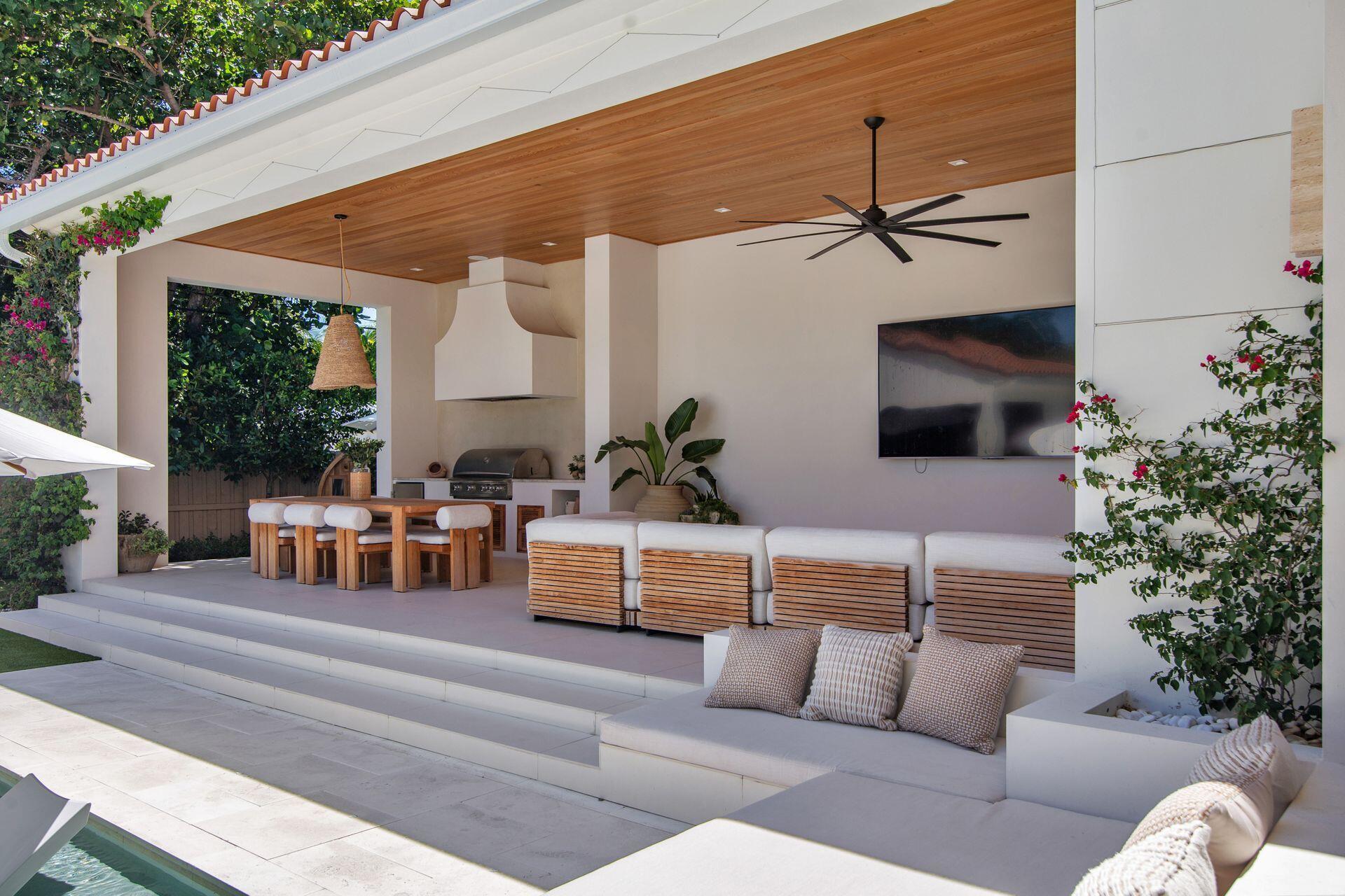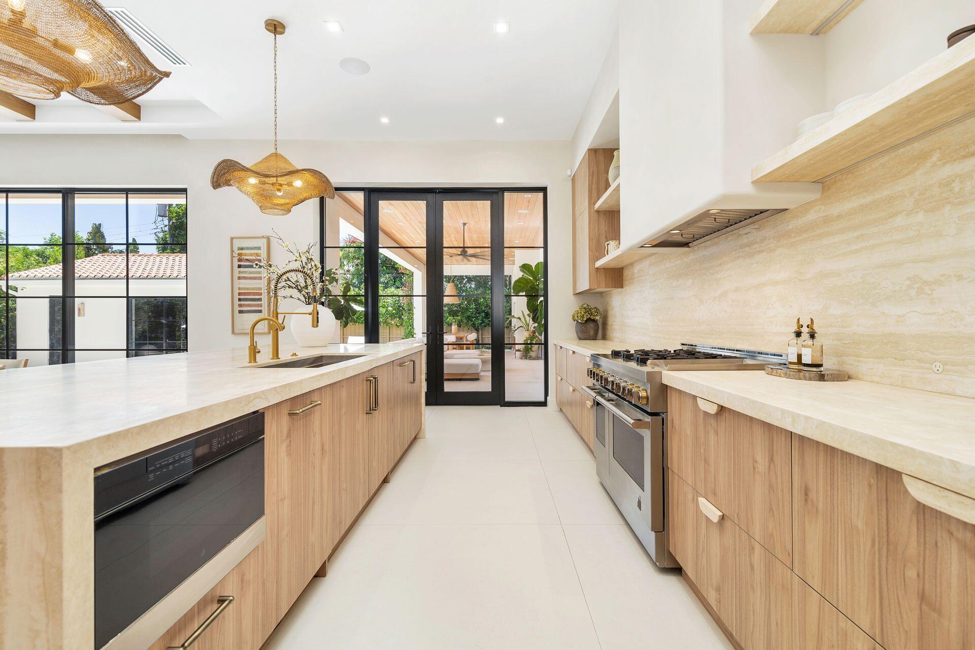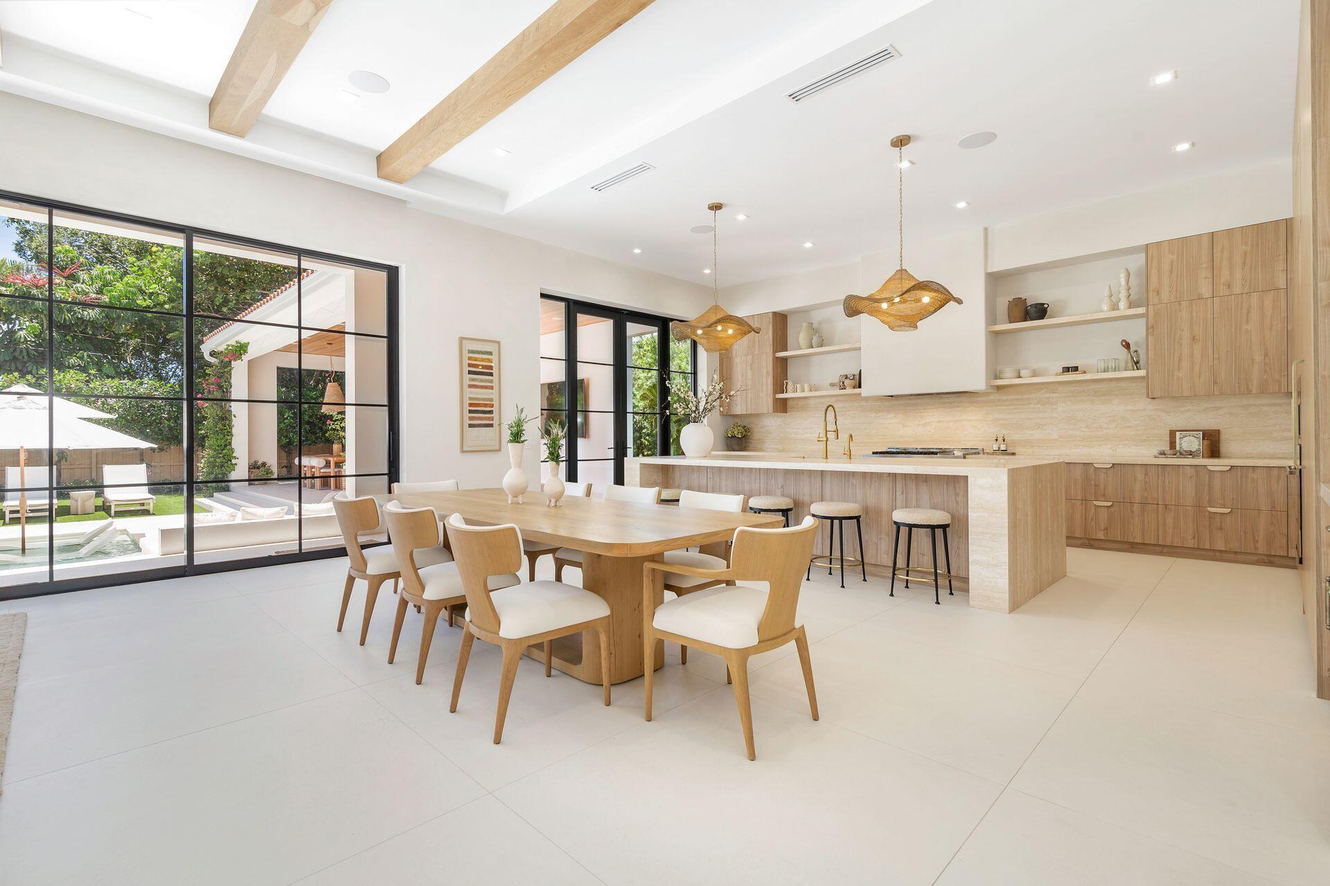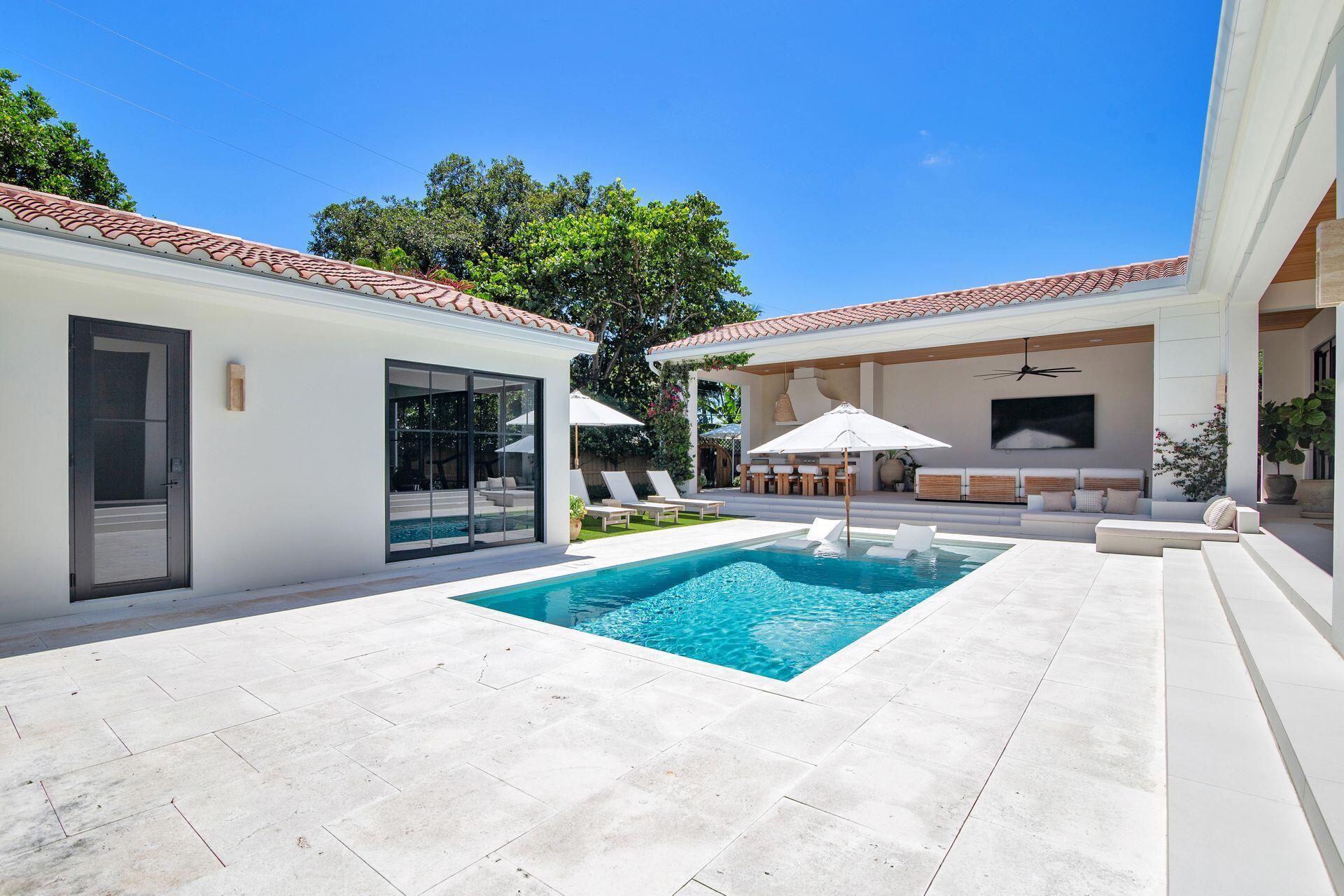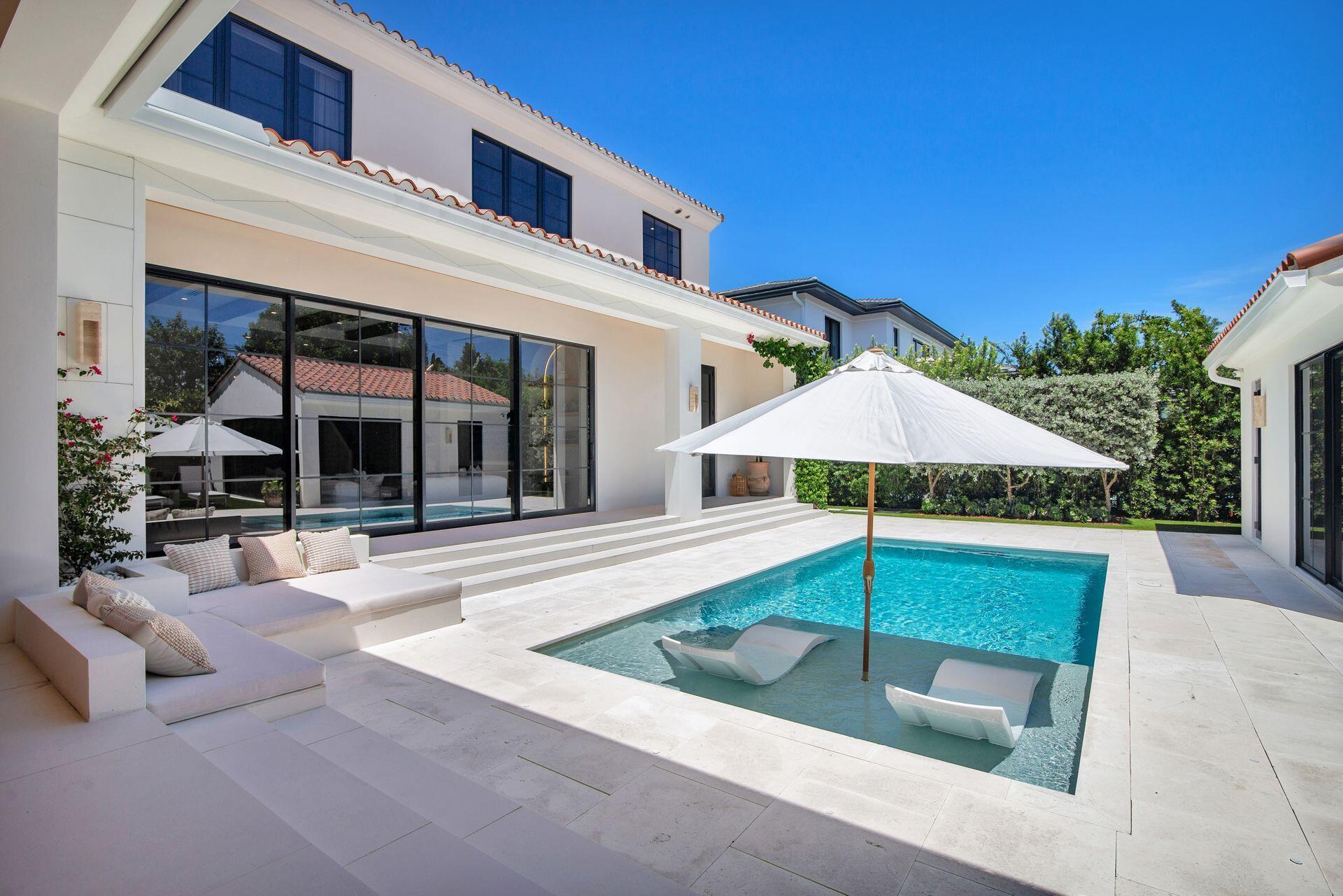 Uber-chic and effortlessly cool, this modern Mediterranean residence combines refined design with a warm, livable feel. Built in 2024 and offered fully furnished, the home features 4 bedrooms, 3 full baths, and 2 powder rooms--completely turnkey and ready to enjoy.With 12' ceilings on the main level and a dramatic wall of 10' sliding glass doors, the interiors are open, airy, and designed for both everyday living and entertaining. The view from the custom front door carries straight through to the south-facing pool, where a Badu swim jet, covered loggia, summer kitchen, and gym/guest cabana create a true private retreat.Every element of the chef's kitchen has been thoughtfully considered, from the travertine countertops and backsplash to the custom pulls - this kitchen is dreamy!