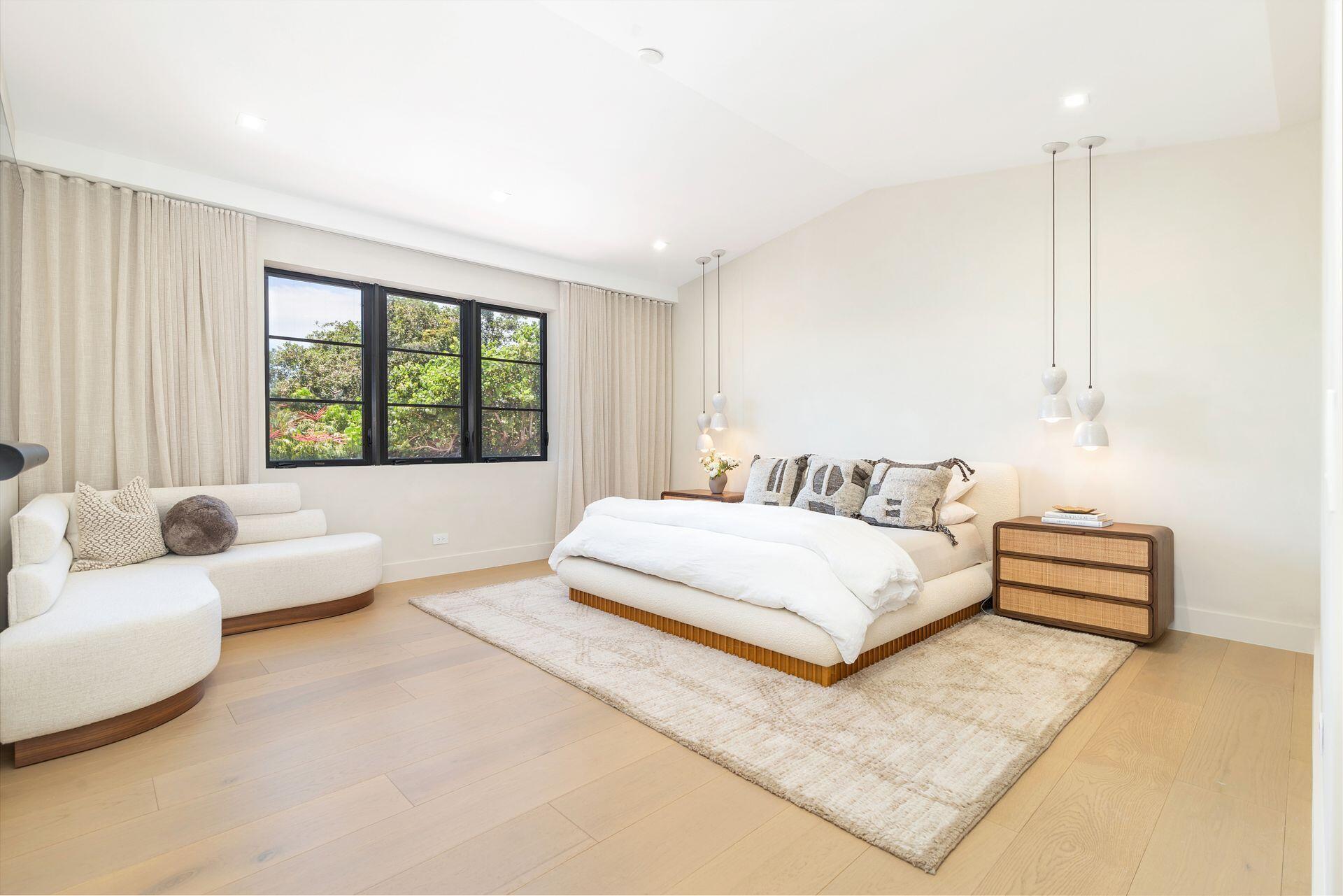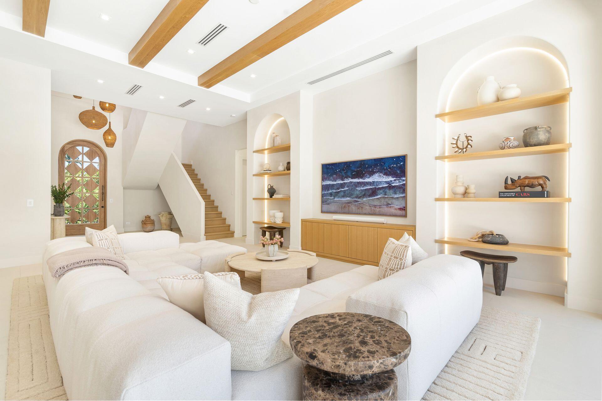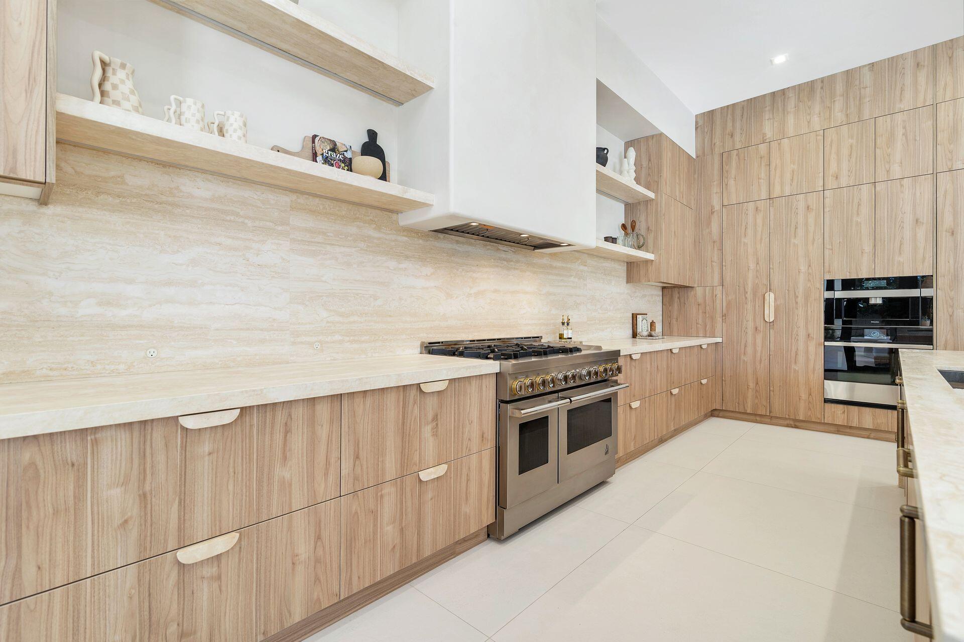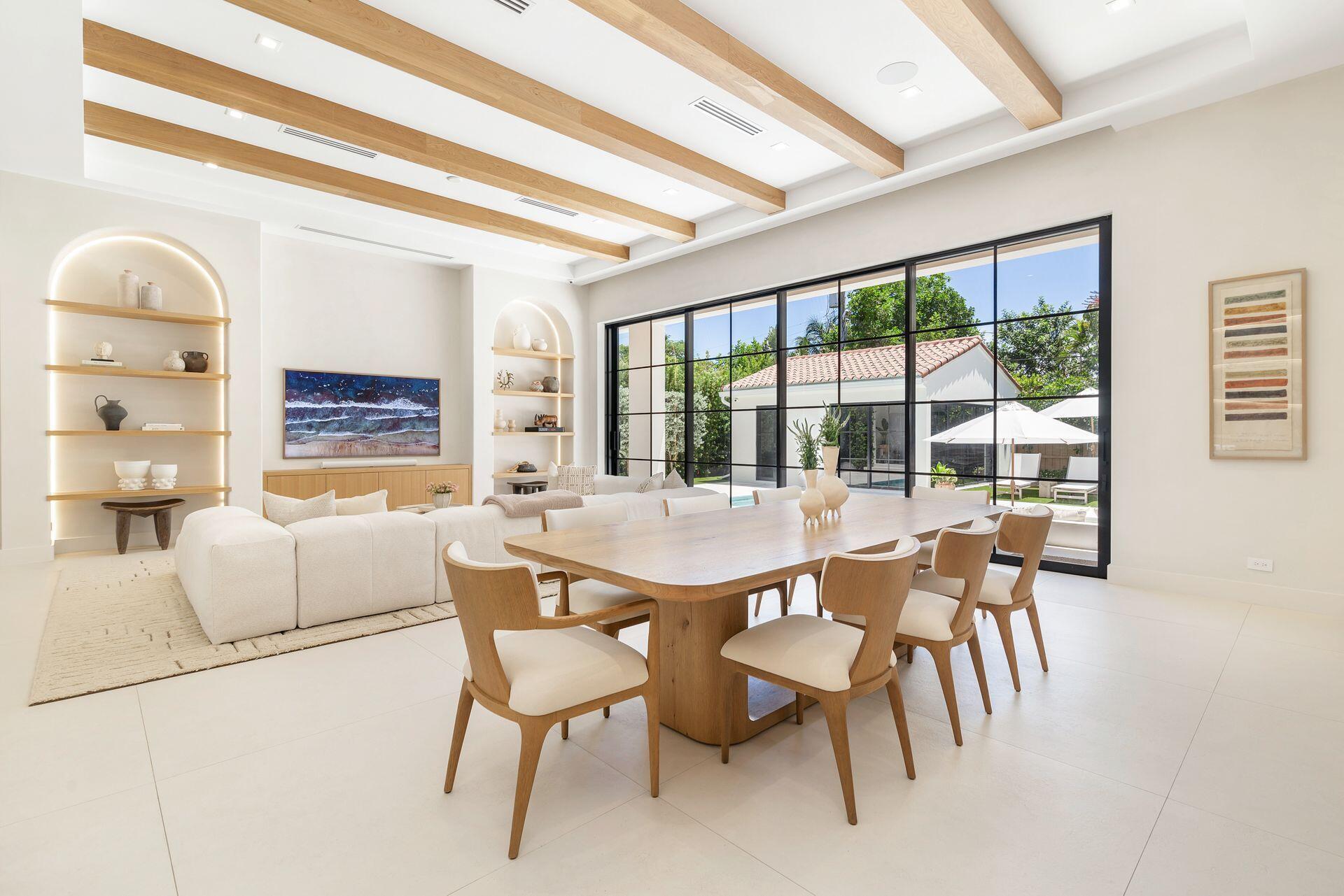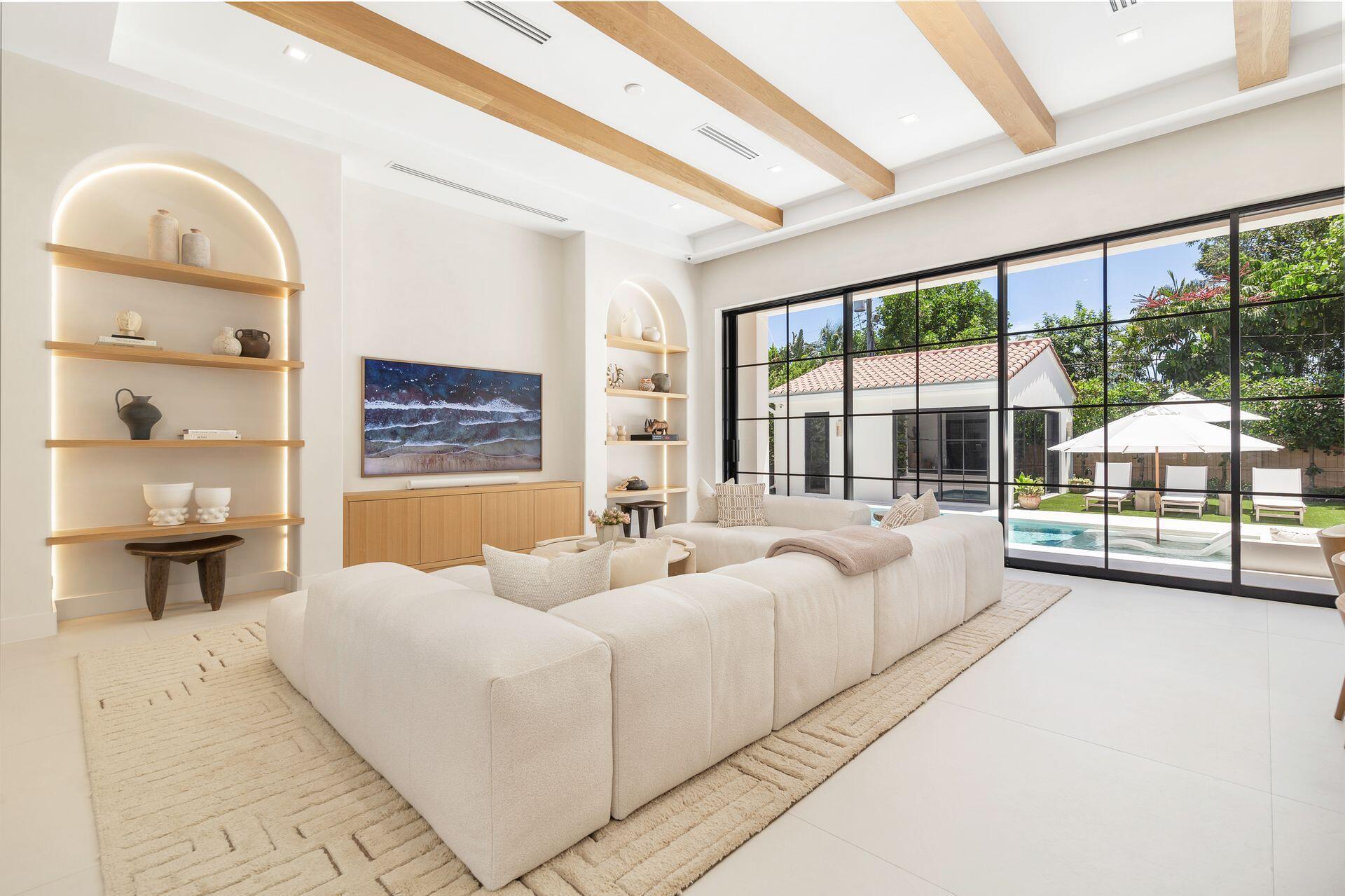 Uber-chic and effortlessly cool, this modern Mediterranean residence combines refined design with a warm, livable feel. Built in 2024 and offered fully furnished, the home features 4 bedrooms, 3 full baths, and 2 powder rooms--completely turnkey and ready to enjoy.With 12' ceilings on the main level and a dramatic wall of 10' sliding glass doors, the interiors are open, airy, and designed for both everyday living and entertaining. The view from the custom front door carries straight through to the south-facing pool, where a Badu swim jet, covered loggia, summer kitchen, and gym/guest cabana create a true private retreat.Every element of the chef's kitchen has been thoughtfully considered, from the travertine countertops and backsplash to the custom pulls - this kitchen is dreamy!