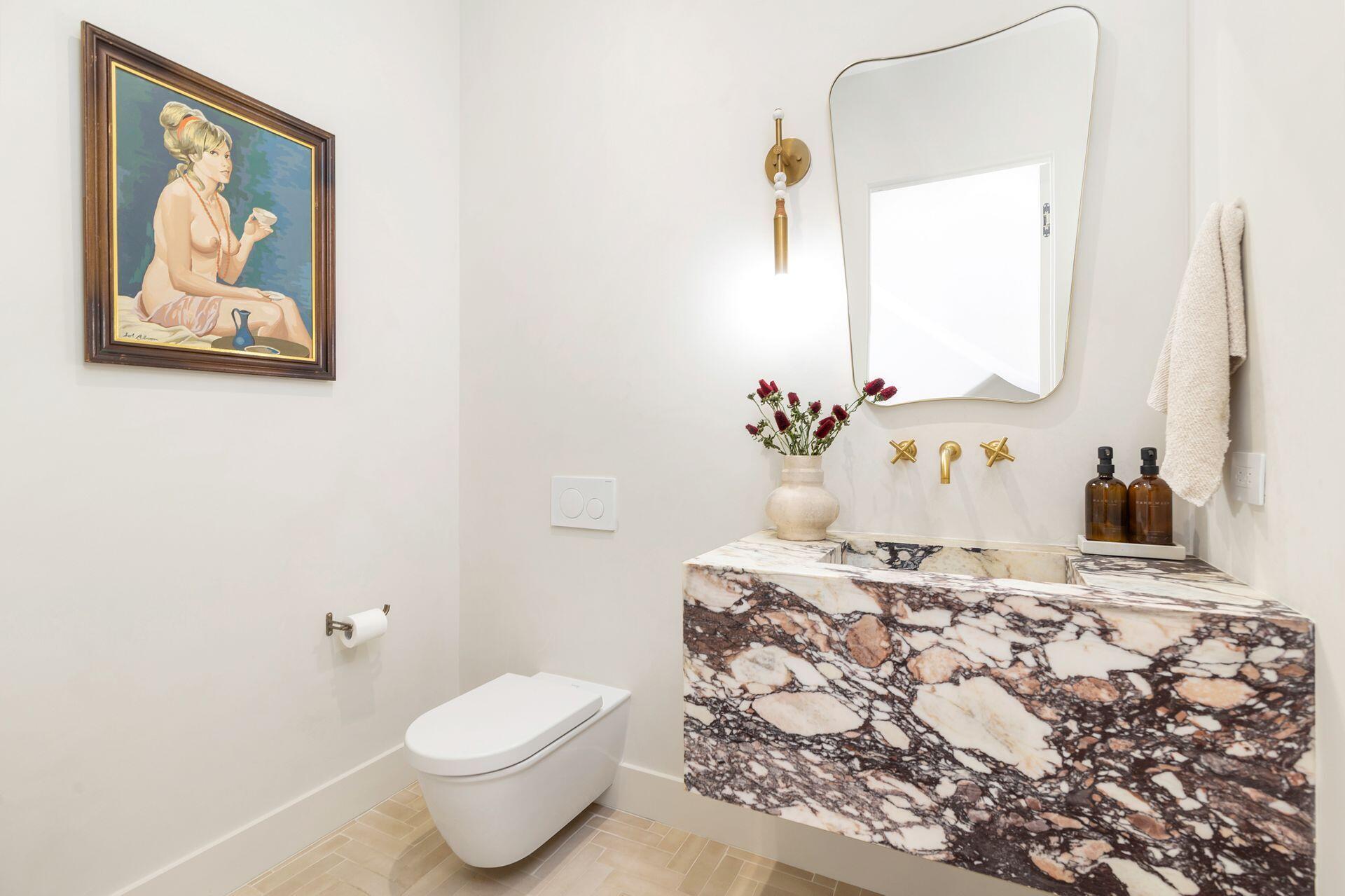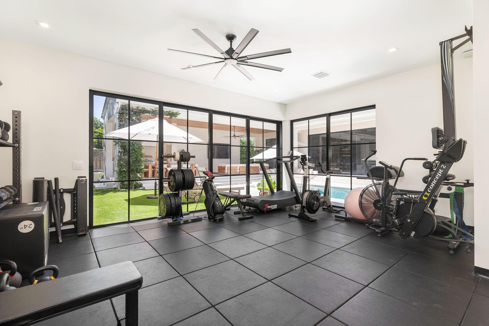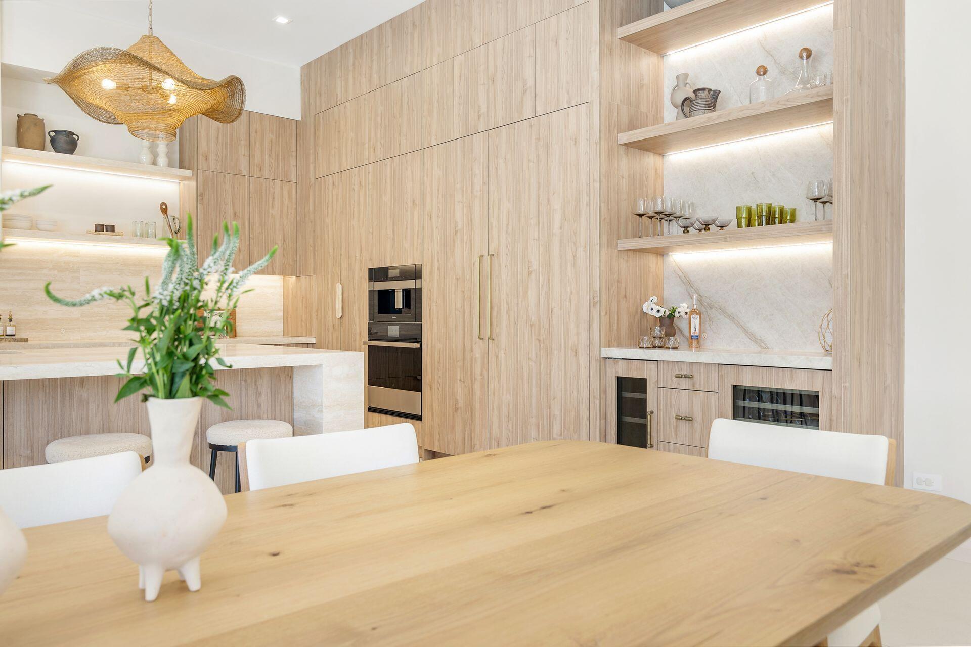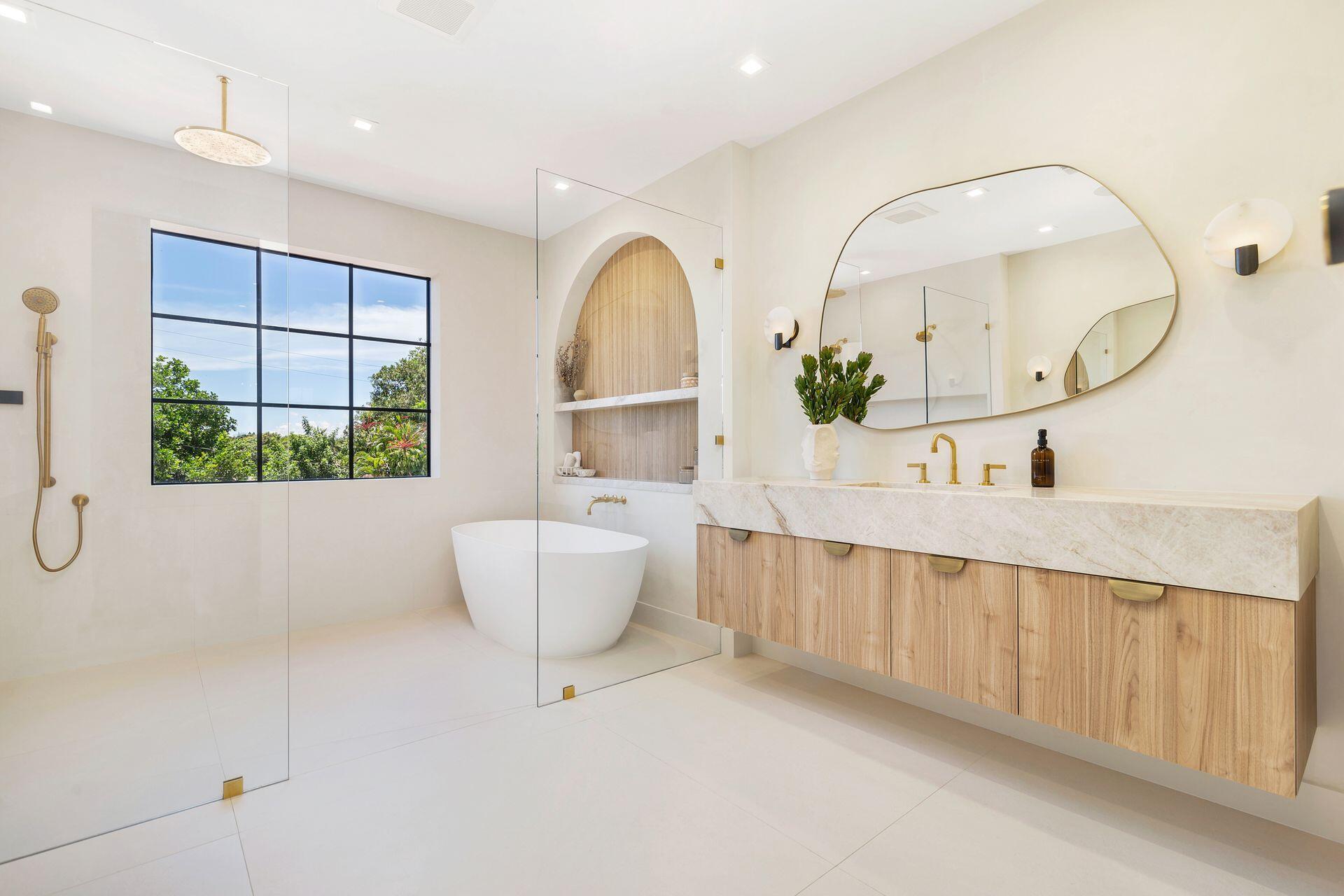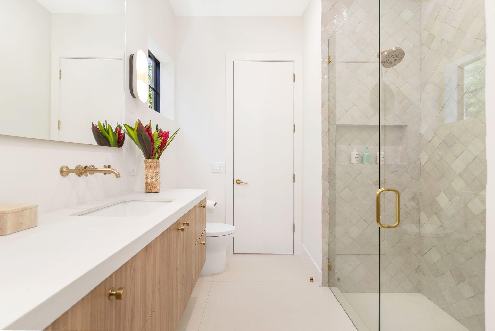 Uber-chic and effortlessly cool, this modern Mediterranean residence combines refined design with a warm, livable feel. Built in 2024 and offered fully furnished, the home features 4 bedrooms, 3 full baths, and 2 powder rooms--completely turnkey and ready to enjoy.With 12' ceilings on the main level and a dramatic wall of 10' sliding glass doors, the interiors are open, airy, and designed for both everyday living and entertaining. The view from the custom front door carries straight through to the south-facing pool, where a Badu swim jet, covered loggia, summer kitchen, and gym/guest cabana create a true private retreat.Every element of the chef's kitchen has been thoughtfully considered, from the travertine countertops and backsplash to the custom pulls - this kitchen is dreamy!