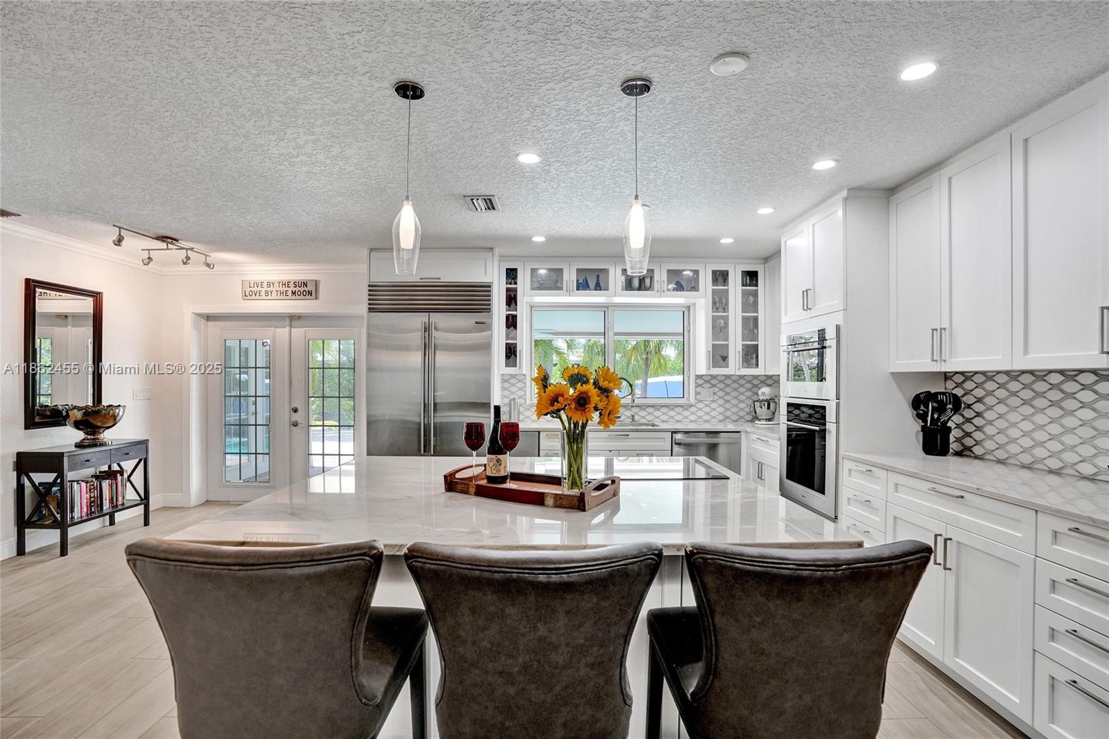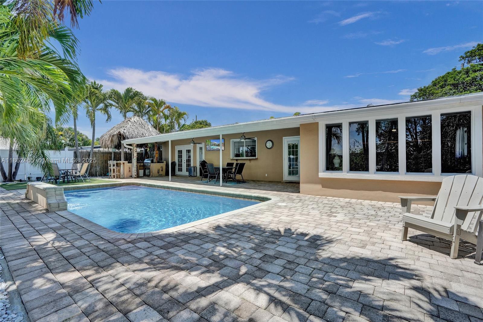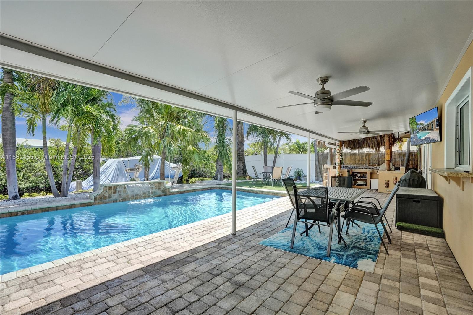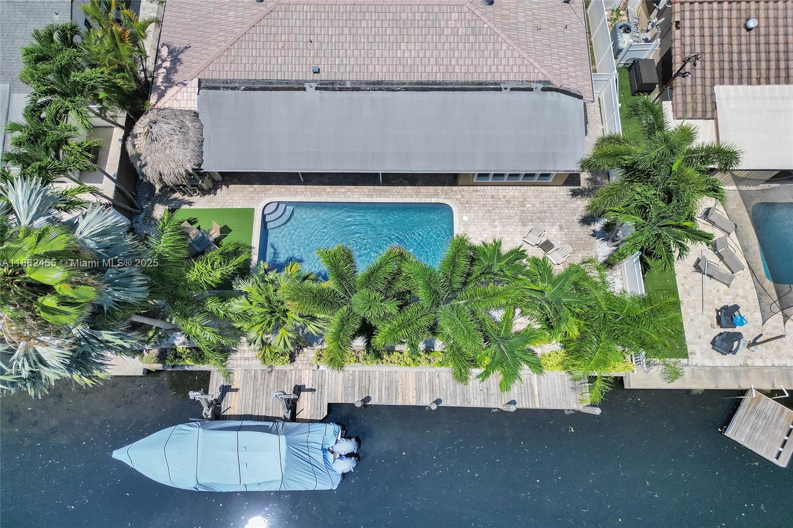 Waterfront Boaters Paradise with only one fixed bridge to the Ocean! Beautifully updated canal-front home features include tile flooring in main areas, vaulted ceilings, knockdown textured walls/ceilings, & crown molding. Chef’s kitchen with Stainless Steel appliances- Sub-Zero fridge, Wolf double oven, microwave/confection, center island, extra icemaker & wine cooler. Spacious bedrooms all with large closets, updated bathrooms including cabana bath for convenience in/out to the pool. Step outside to your backyard Oasis- oversized patio, heated saltwater pool with waterfall, paved deck, custom tiki bar w/ grill, 70’ dock with water, electric, shower & 14,000lb Neptune boat lift, dock Circular driveway& Fenced yard, this home is move-in-ready—perfect for year-round waterfront living!