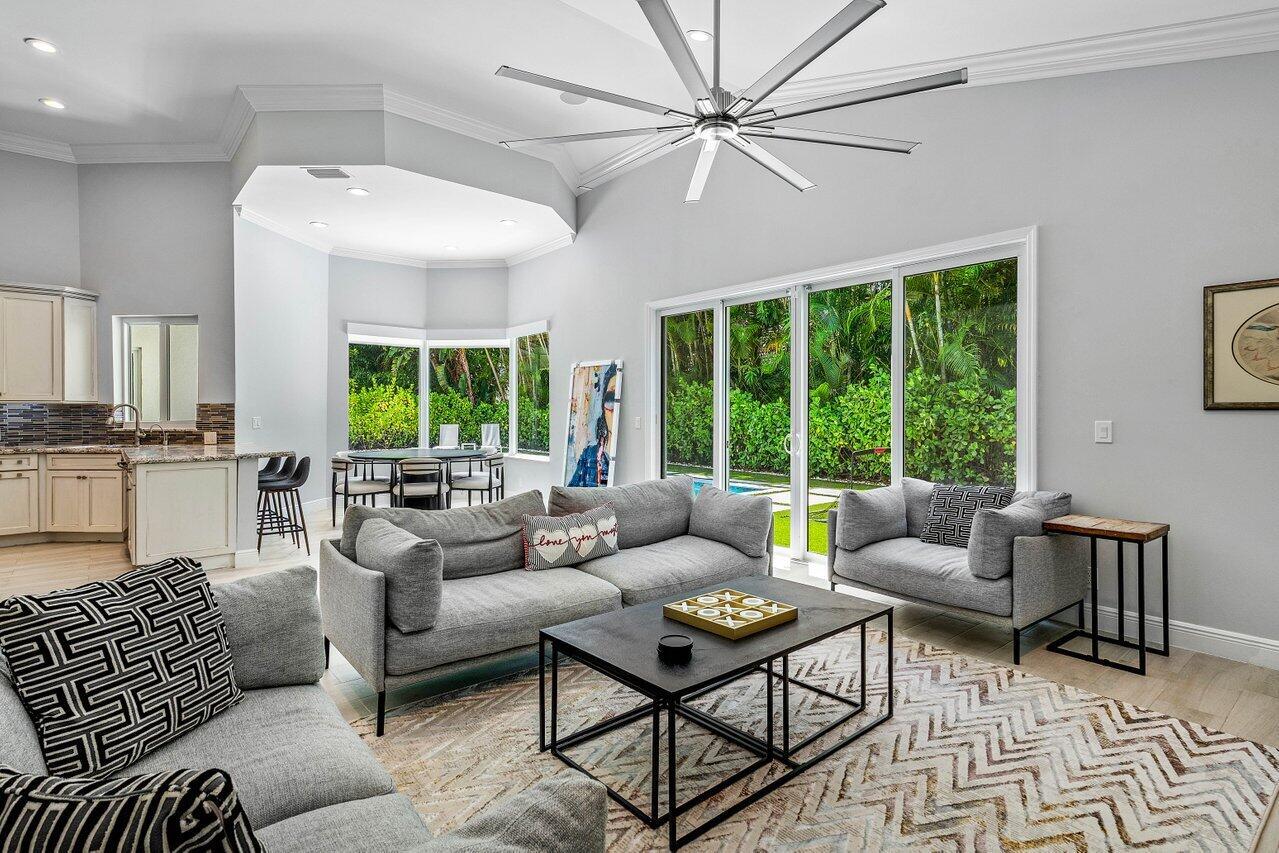 Stunning 5BD /4.2 BA in the Hamptons of Woodfield Country Club. This home welcomes you in with soaring ceilings and natural light streaming through oversized windows and sliding doors, filling the space with warmth and brightness. The main living area offers a perfect blend of comfort and style, featuring a chic bar, an elegant dining space, and thoughtfully chosen light fixtures that add a modern touch. The kitchen is a true centerpiece of the home with a large center island ideal for everyday meals or entertaining. Just off the kitchen, a casual breakfast area and additional living room offer even more space to gather. A downstairs office offers a quiet and functional space to work or unwind.